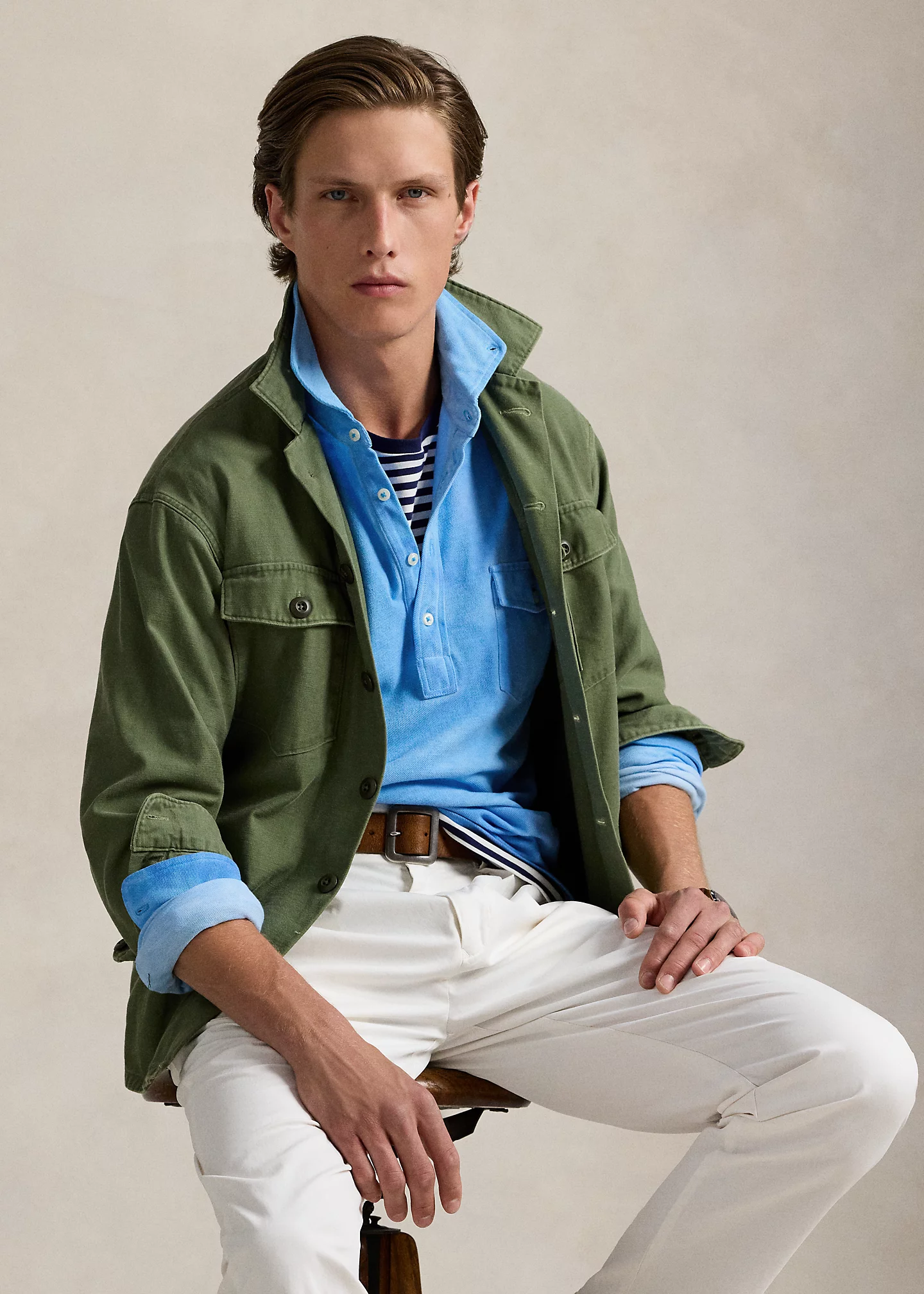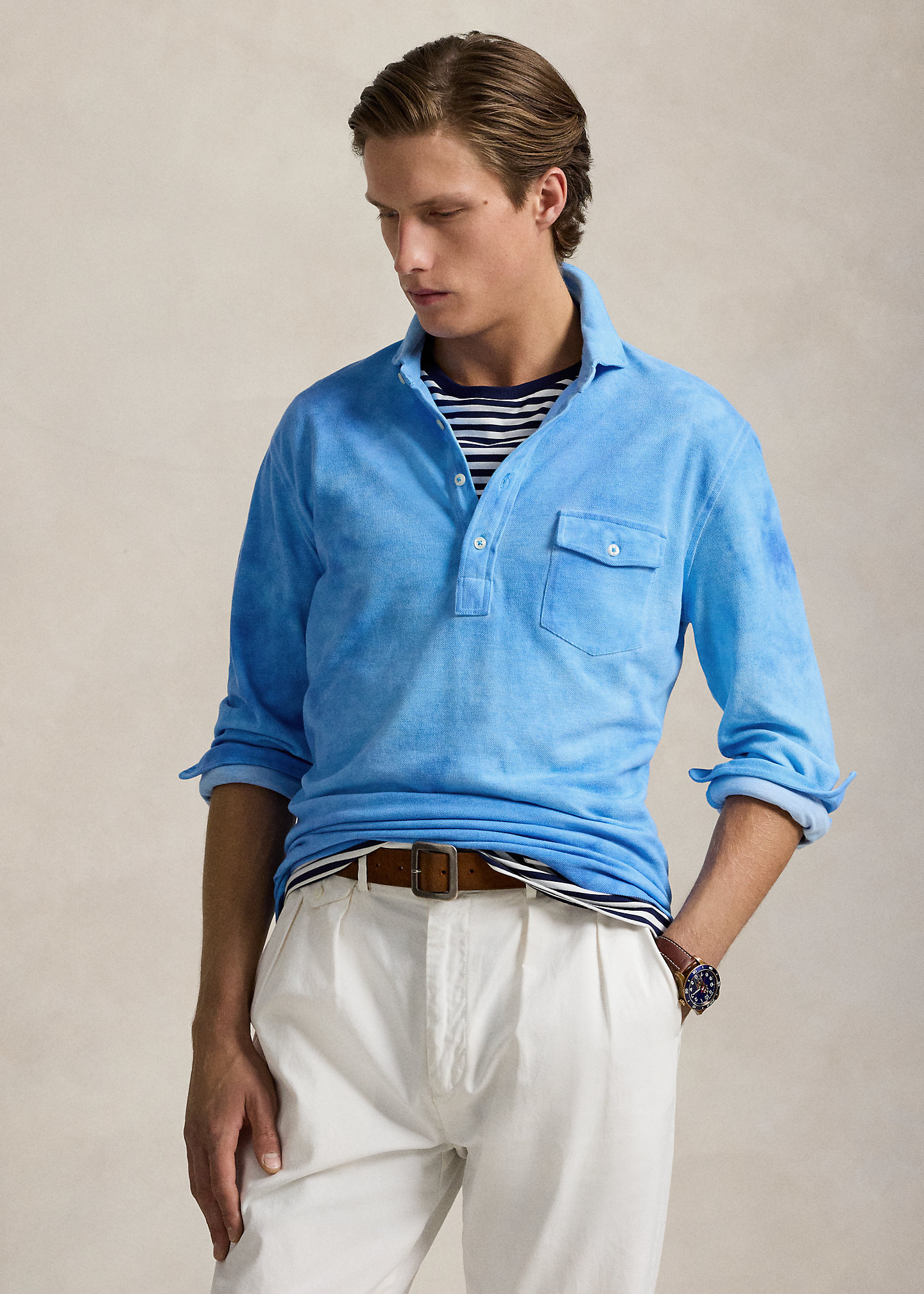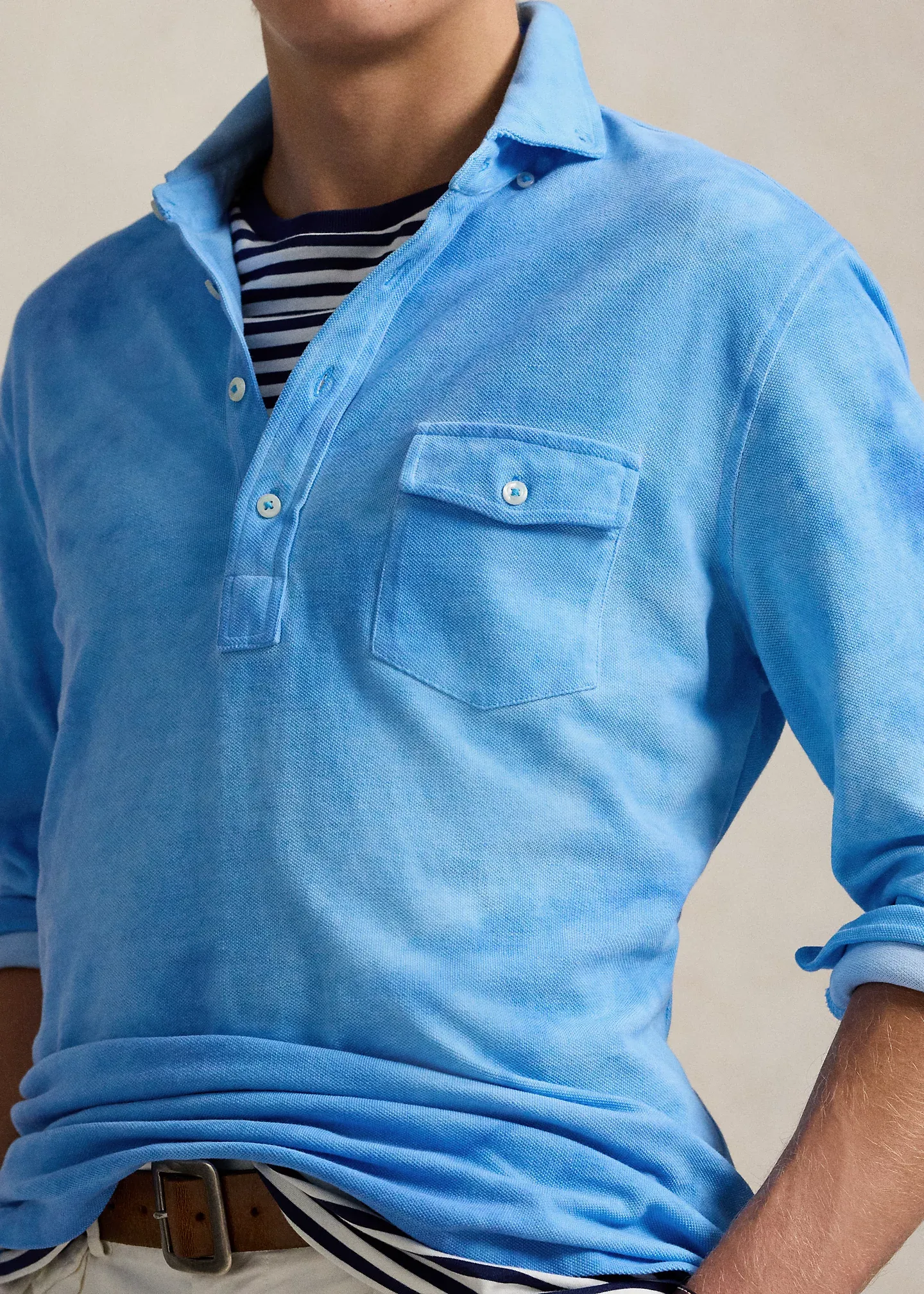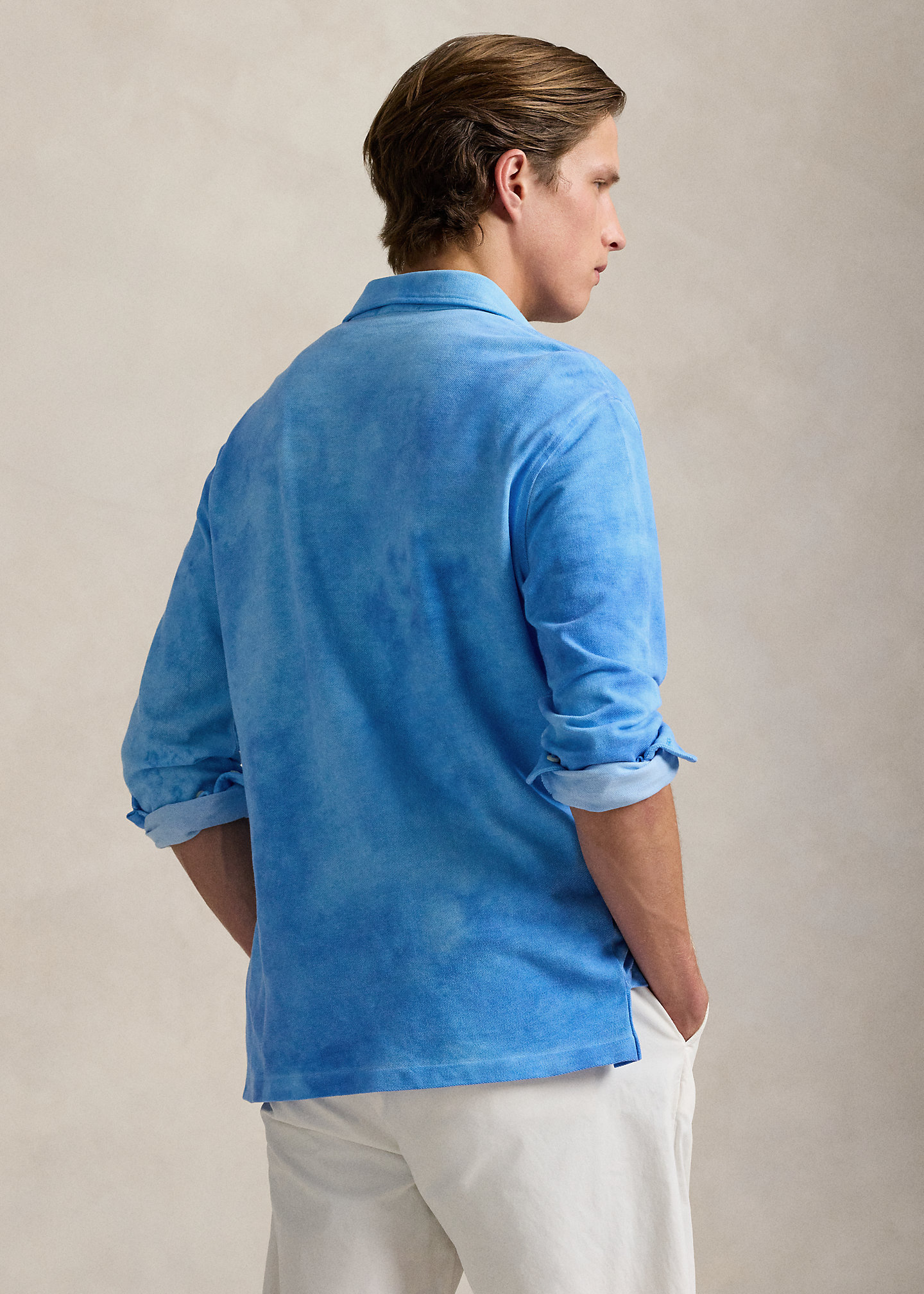 - Button-down collar. Four-button placket. Long sleeves with buttoned barrel cuffs.