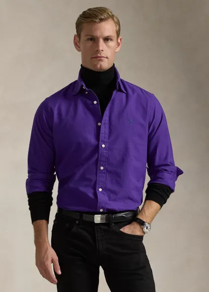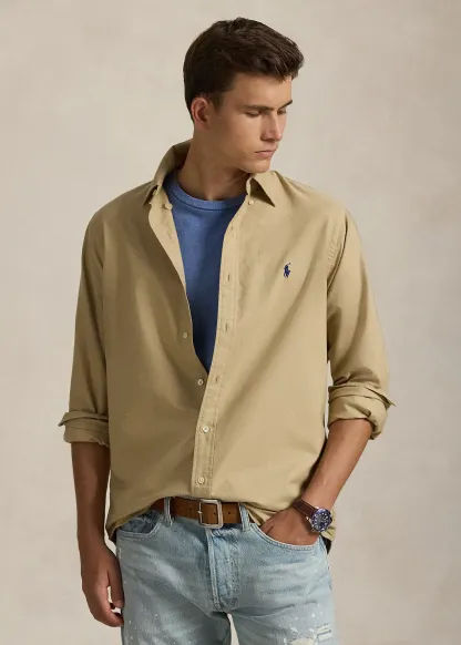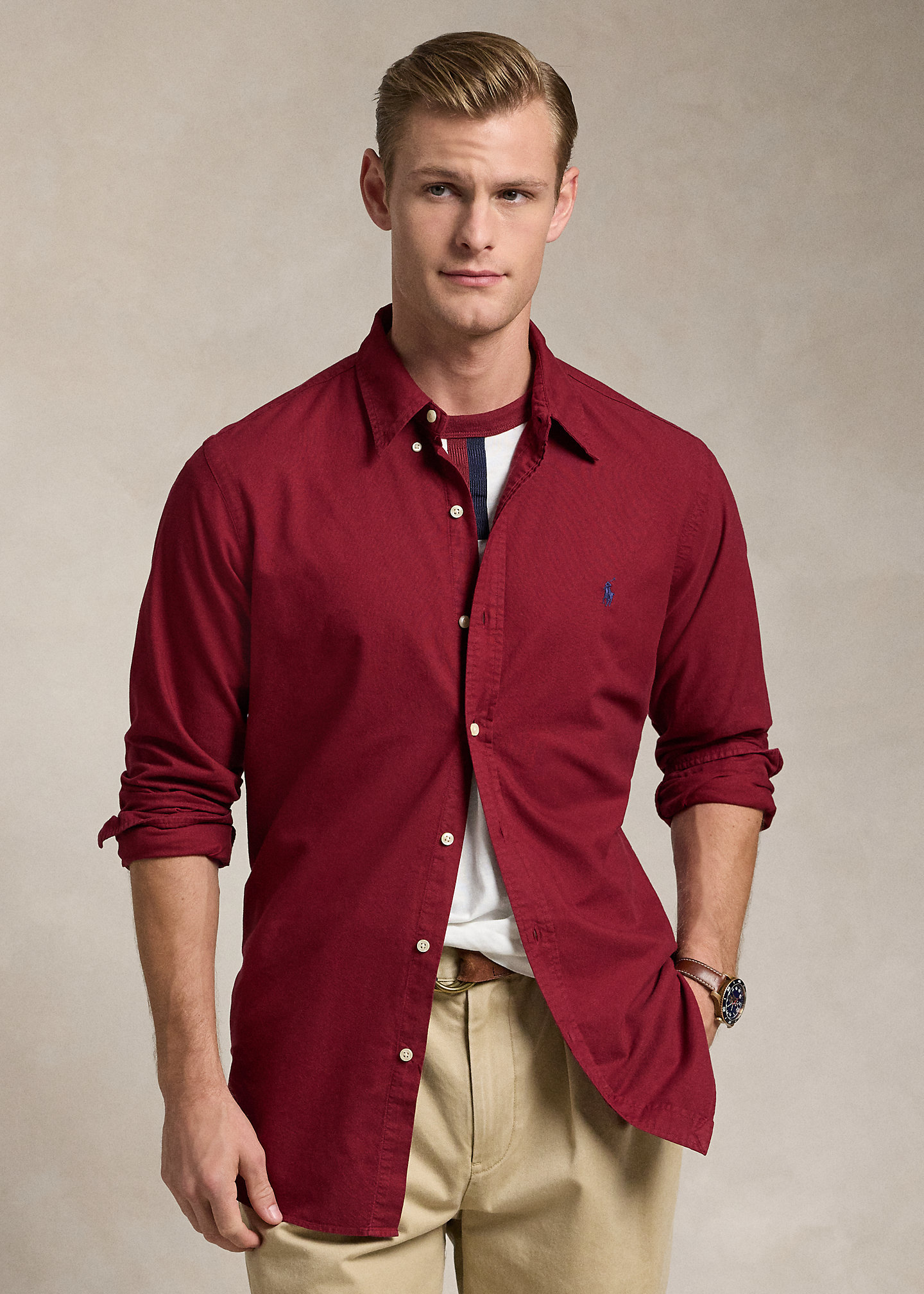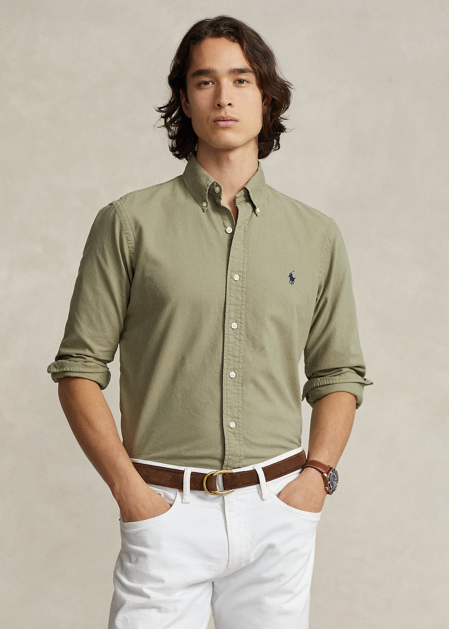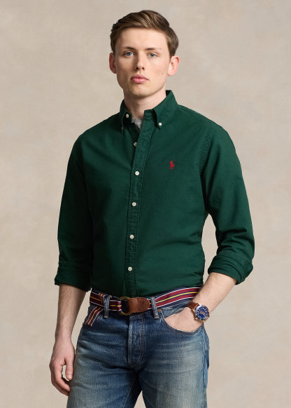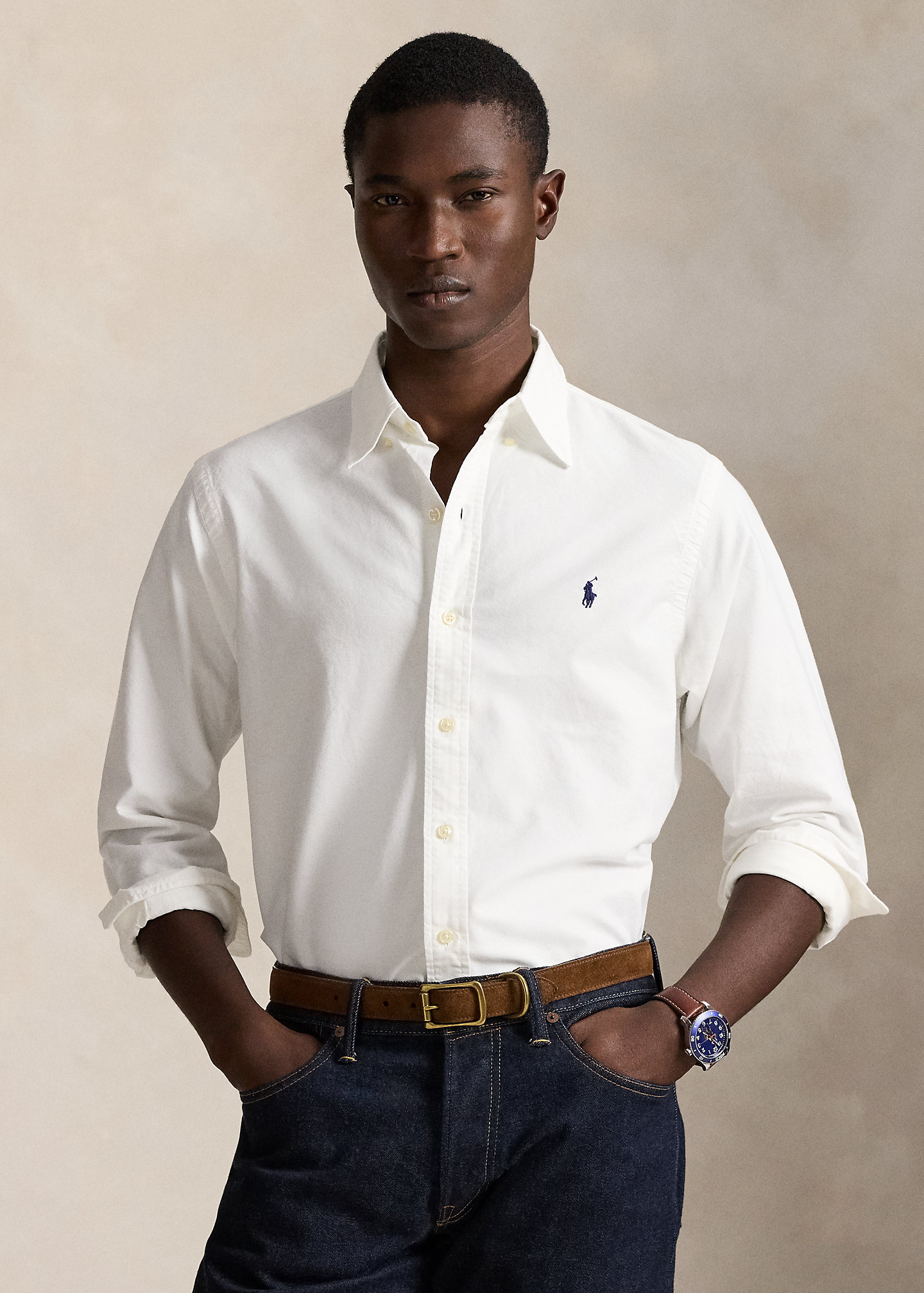 - Button-down point collar. Buttoned placket.