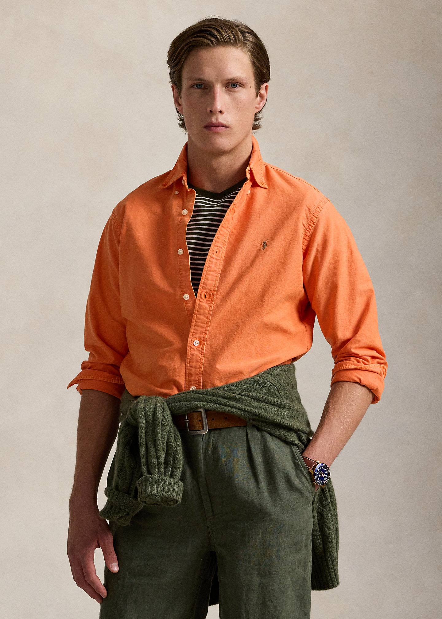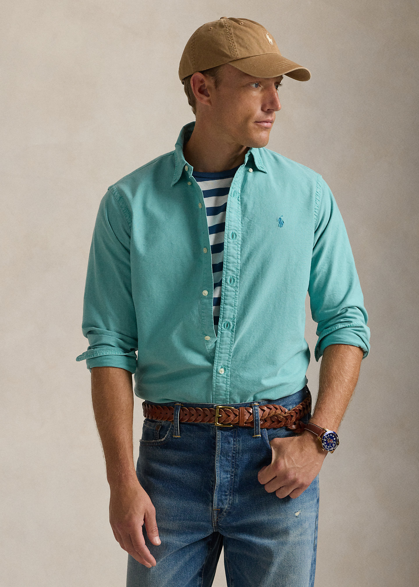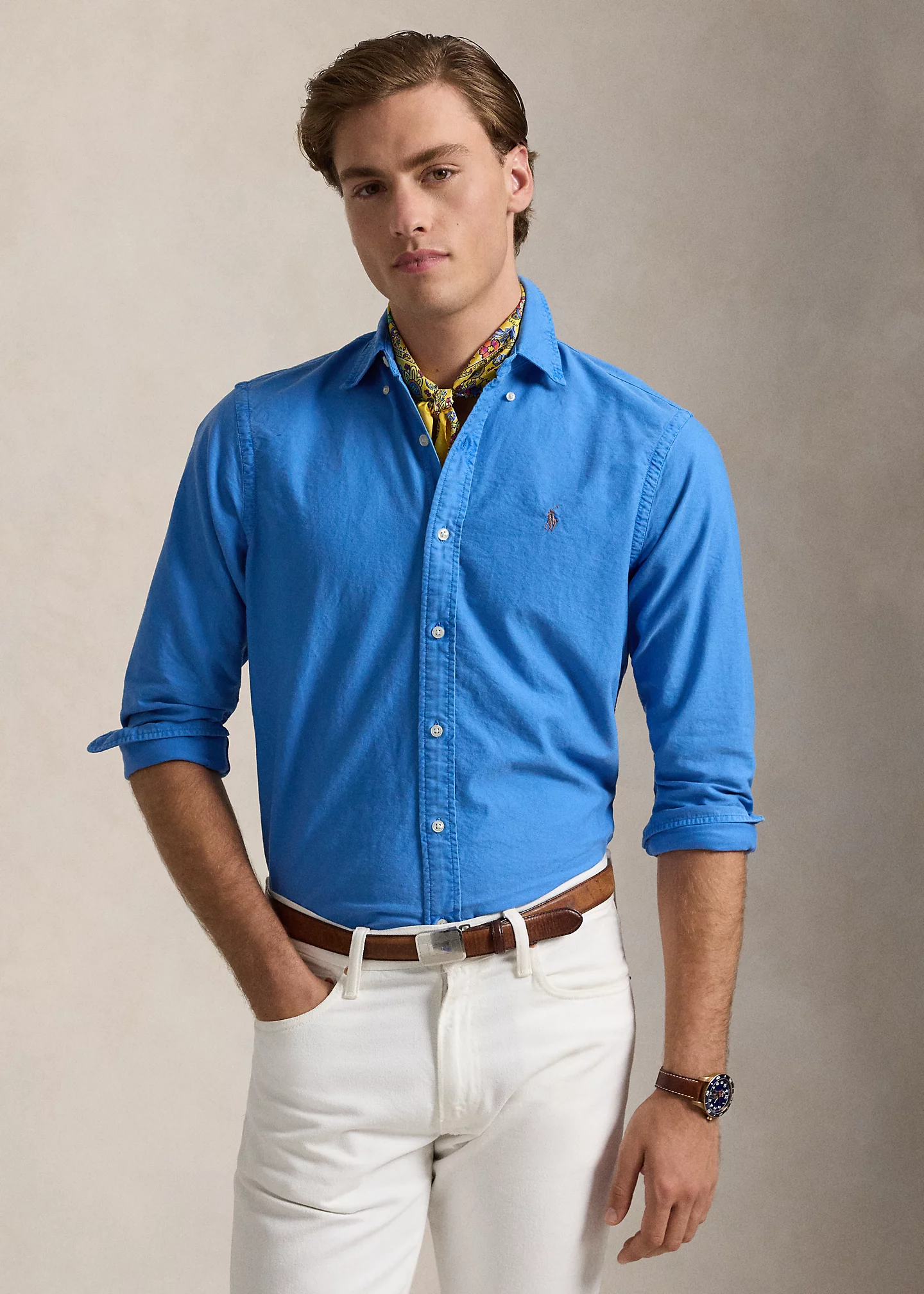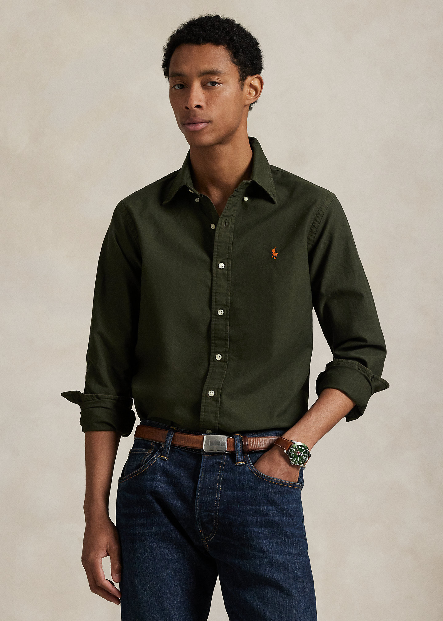 - Button-down point collar. Buttoned placket.