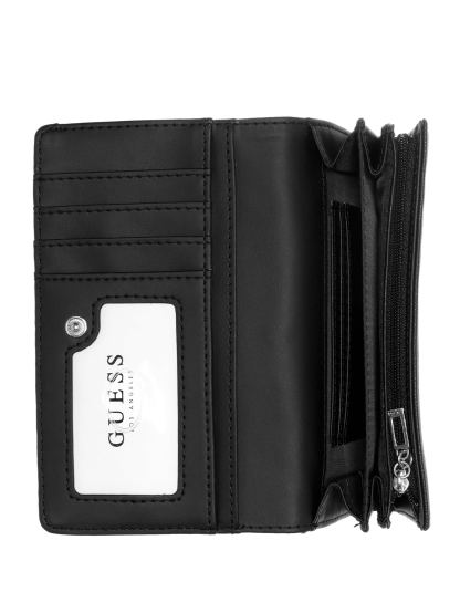 Stay organized with this faux-leather organizer wallet featuring a glitter design, fold-over flap, push-lock closure with an etched logo and wrist strap.