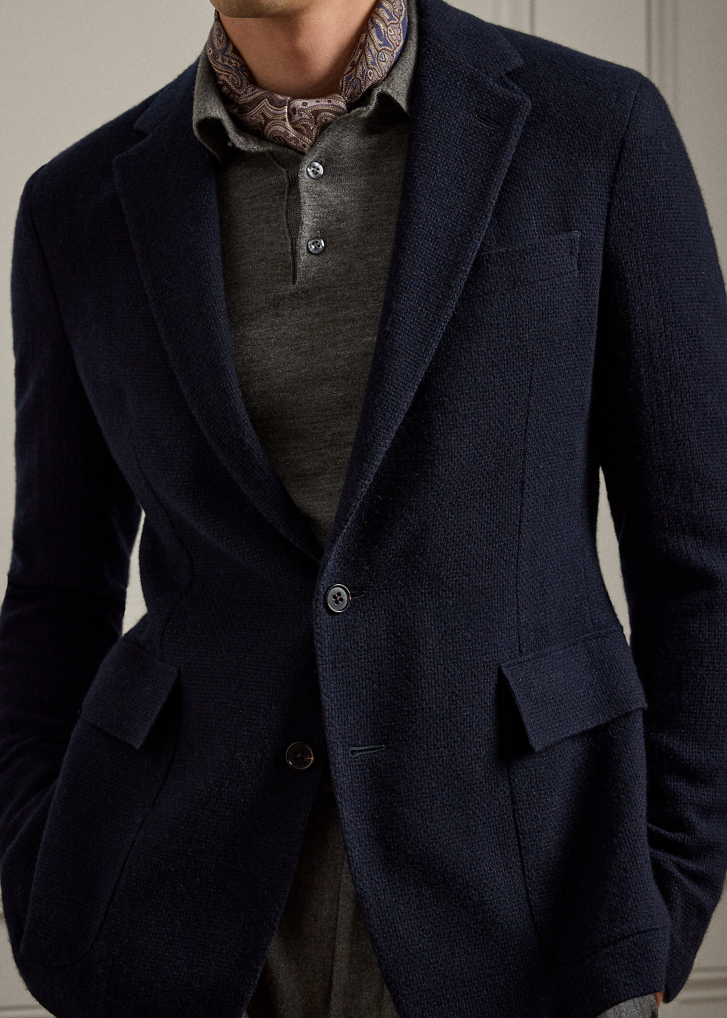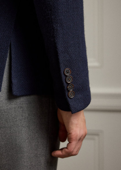 - Notch lapels. Buttoned throat latch. Buttonhole at the left lapel. Two-button silhouette. Genuine horn buttons.