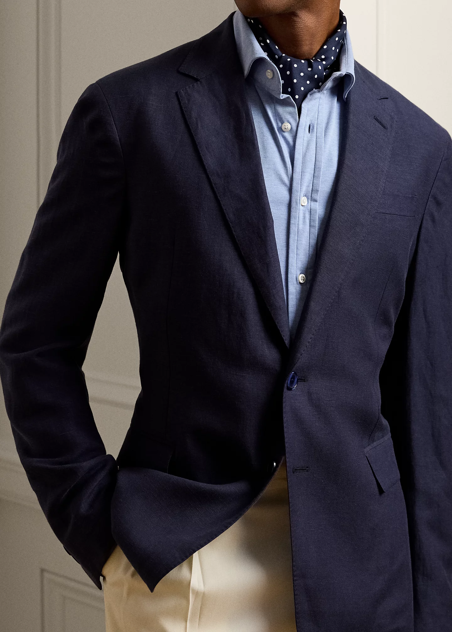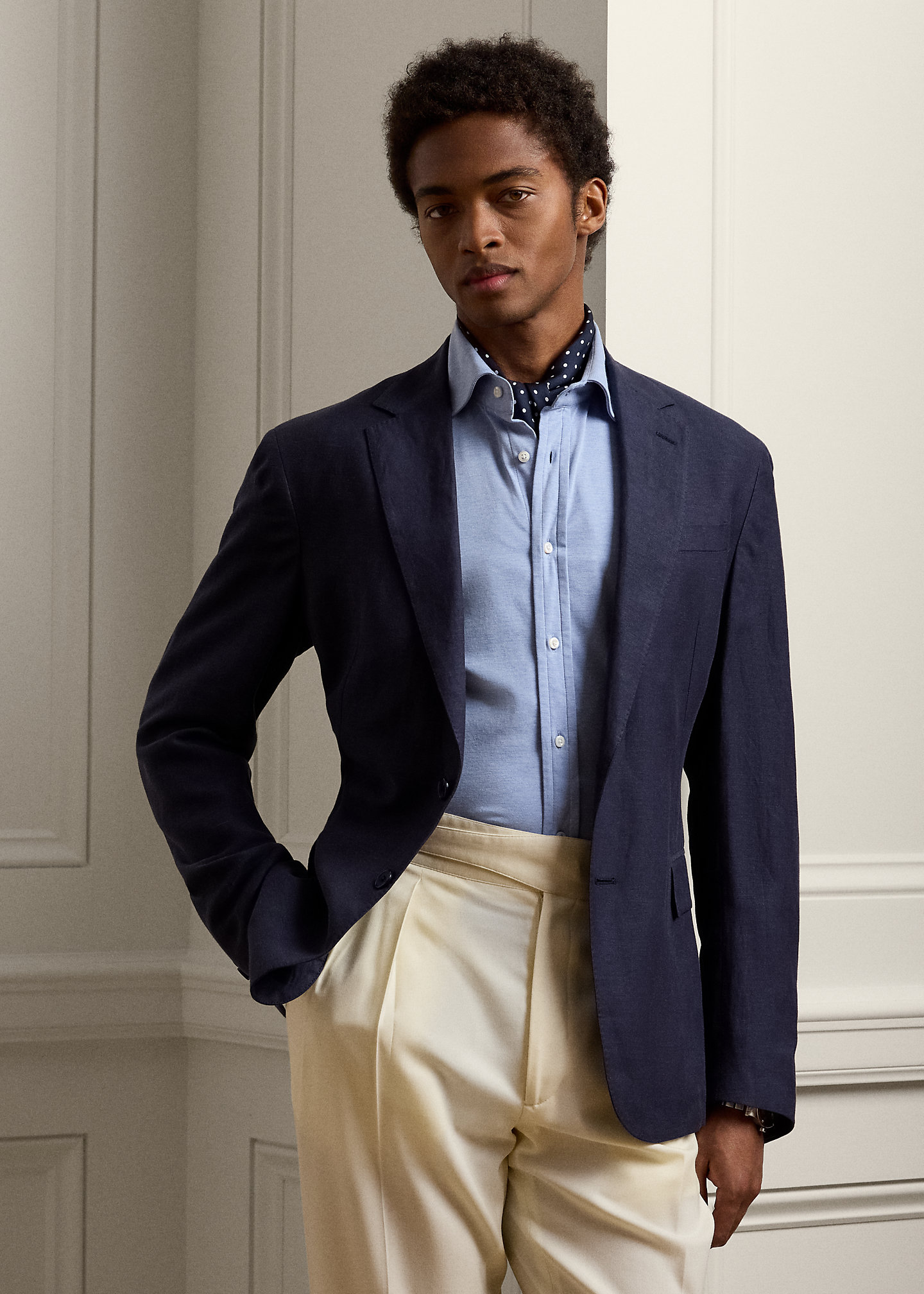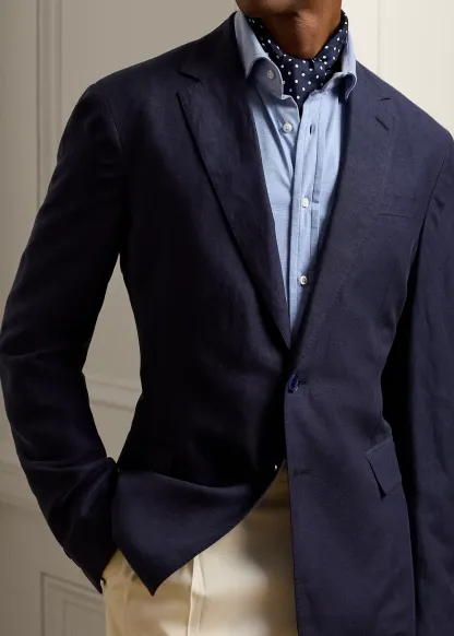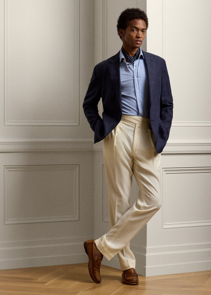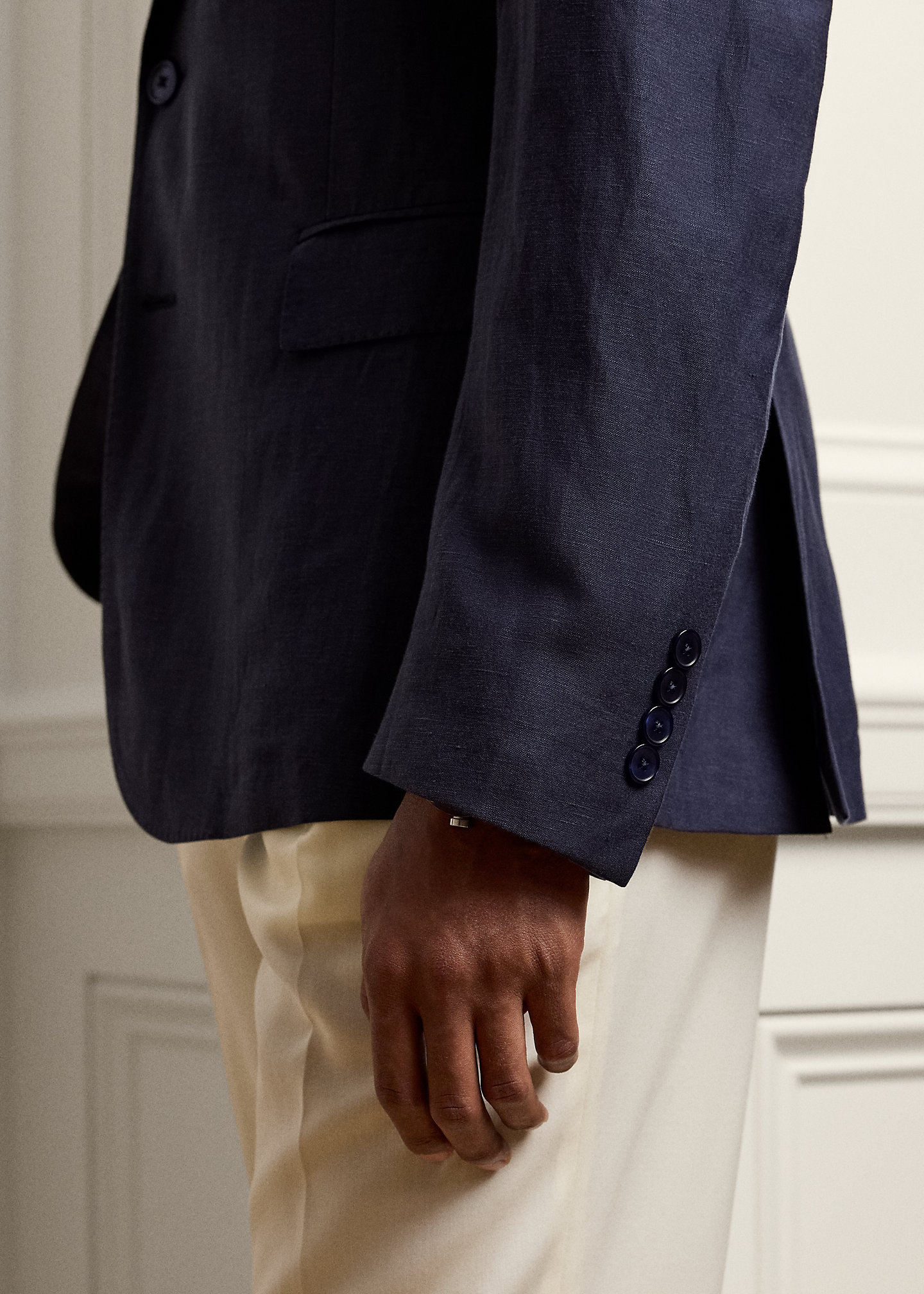 - Notch lapels. Buttonhole at the left lapel. Two-button silhouette. Genuine mother-of-pearl buttons.