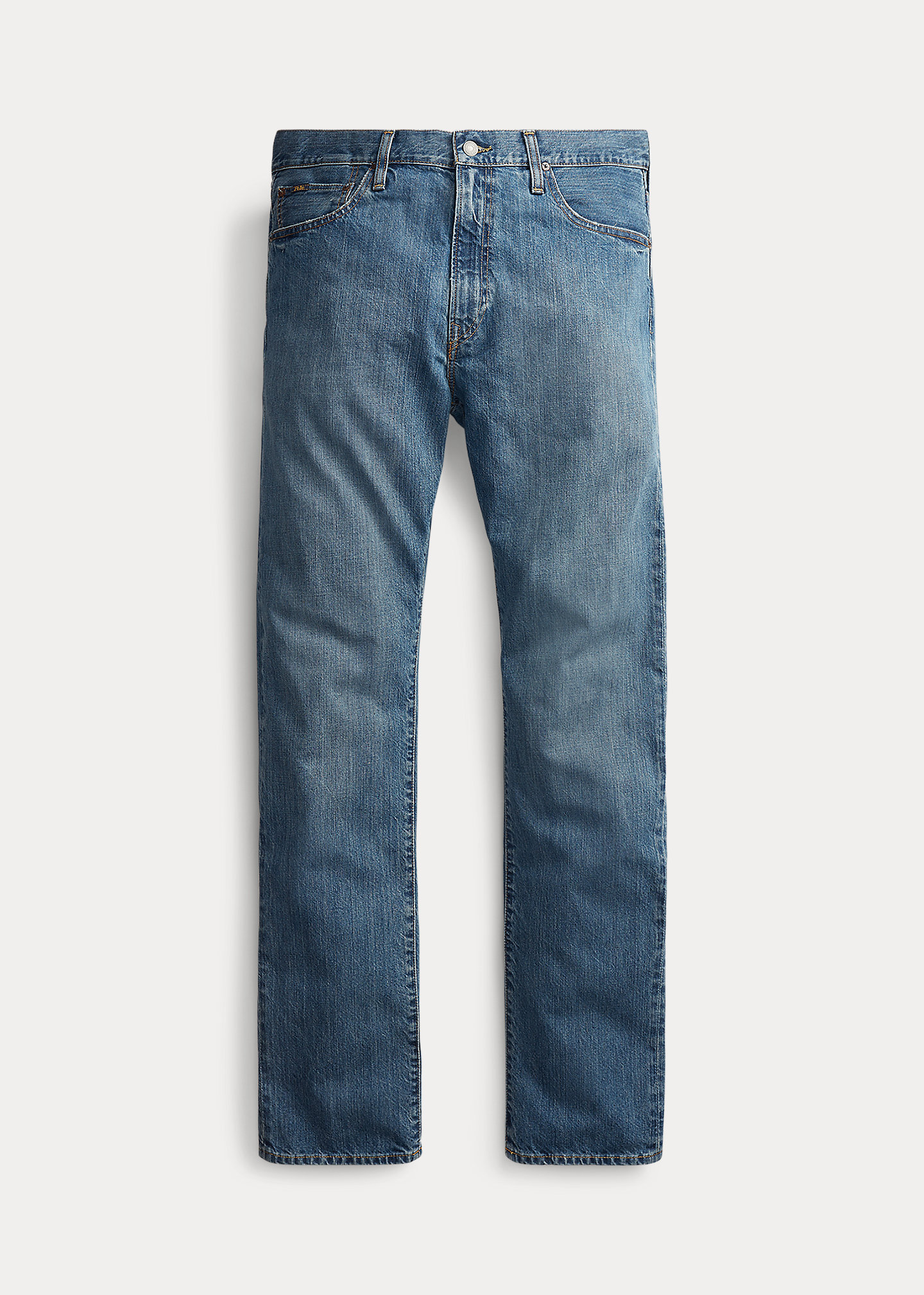 - Five-pocket styling with signature metal rivets. "Polo" label at the coin pocket.