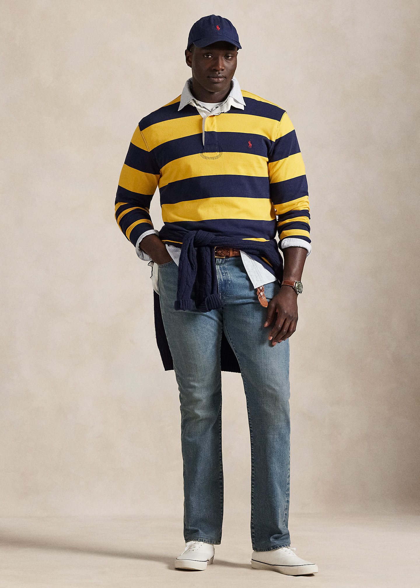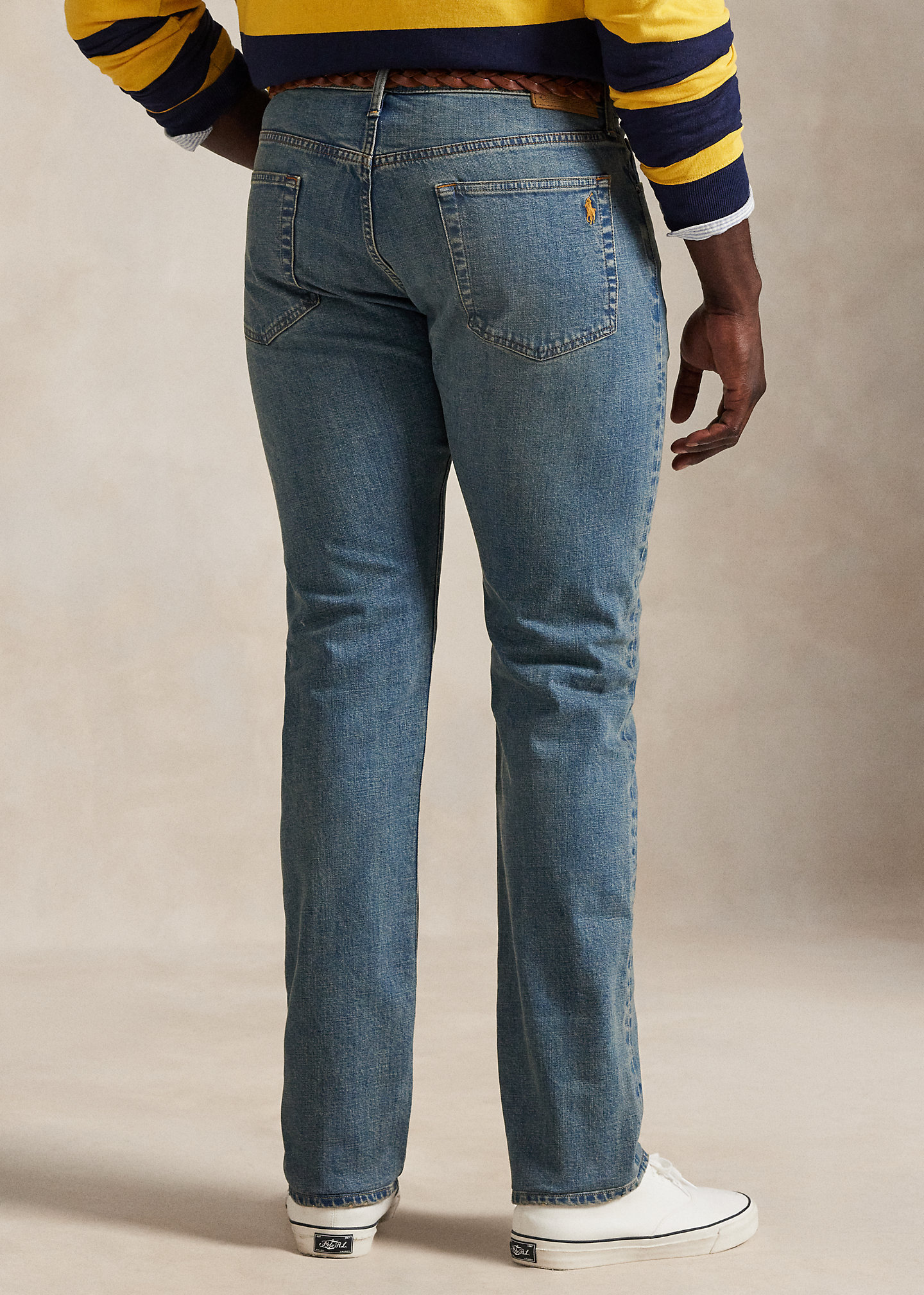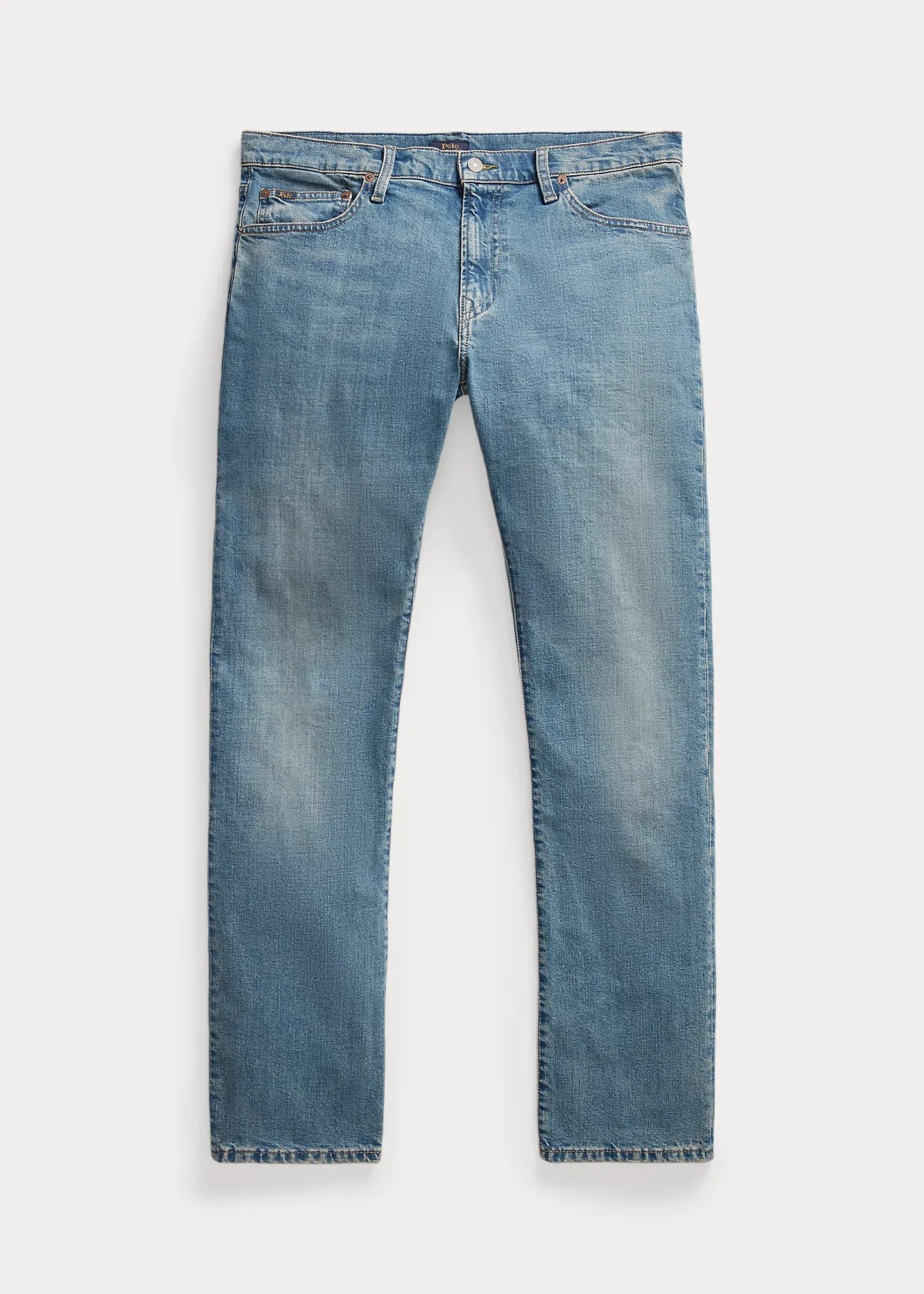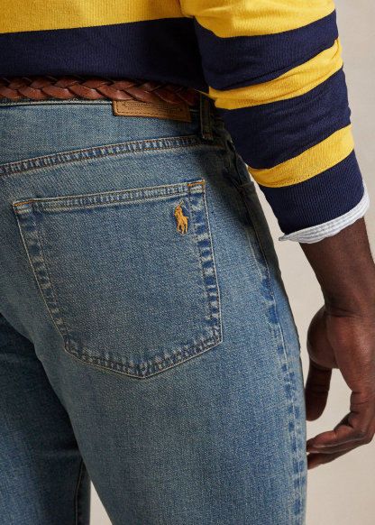 - Five-pocket styling with signature metal rivets. “Polo” label at the coin pocket. “Polo Ralph Lauren” patch at the back right waist.