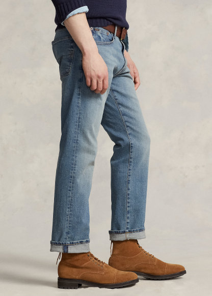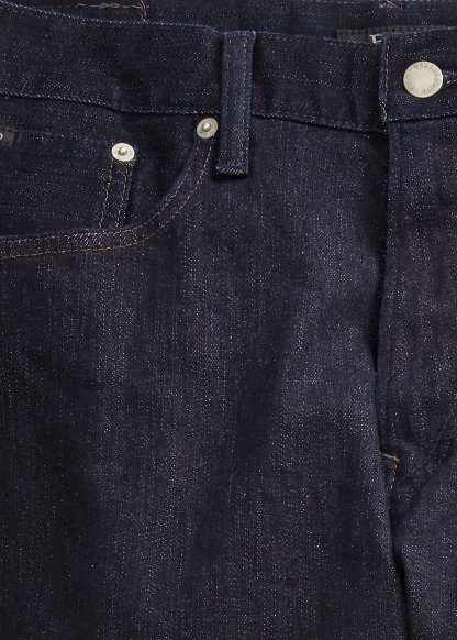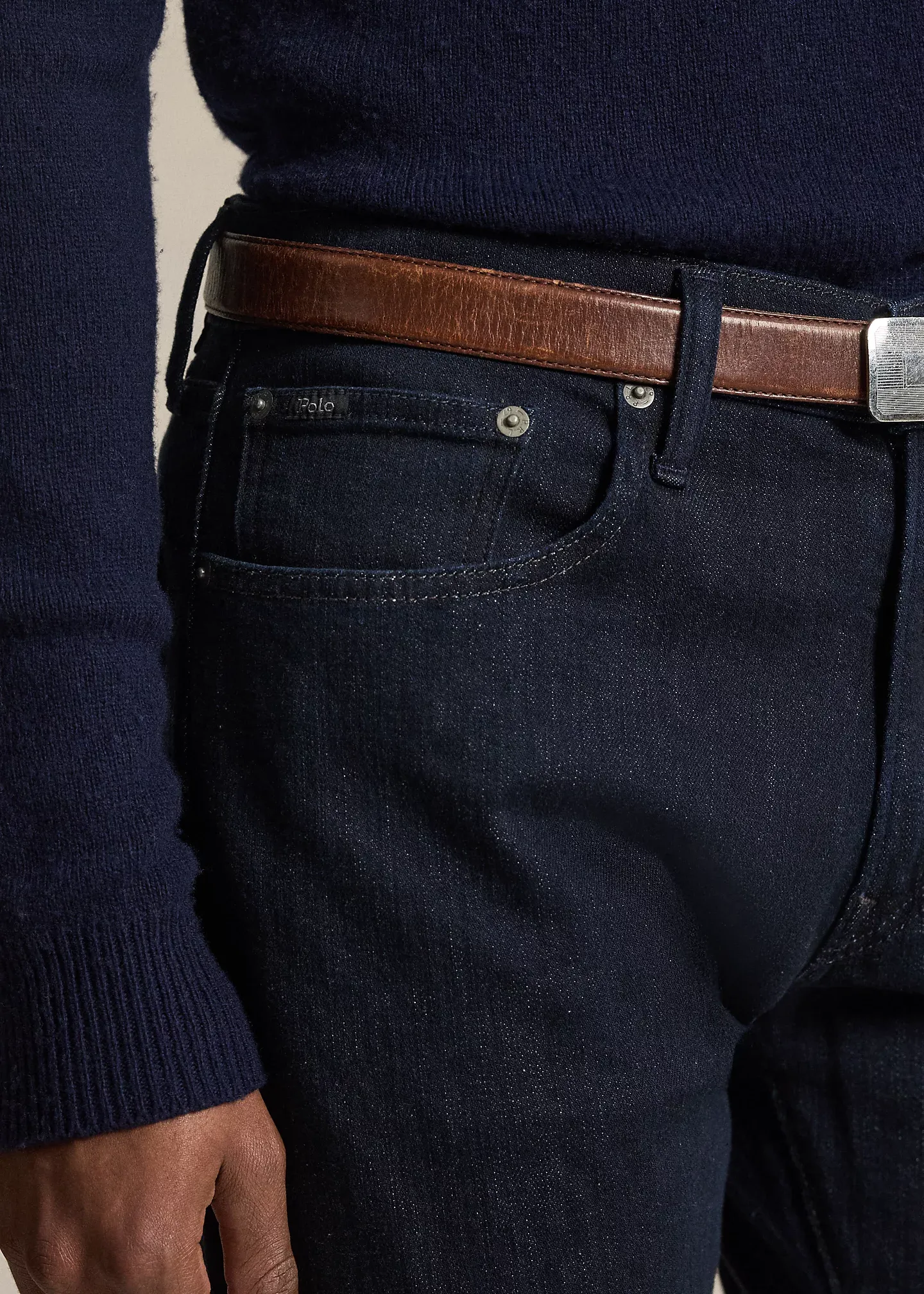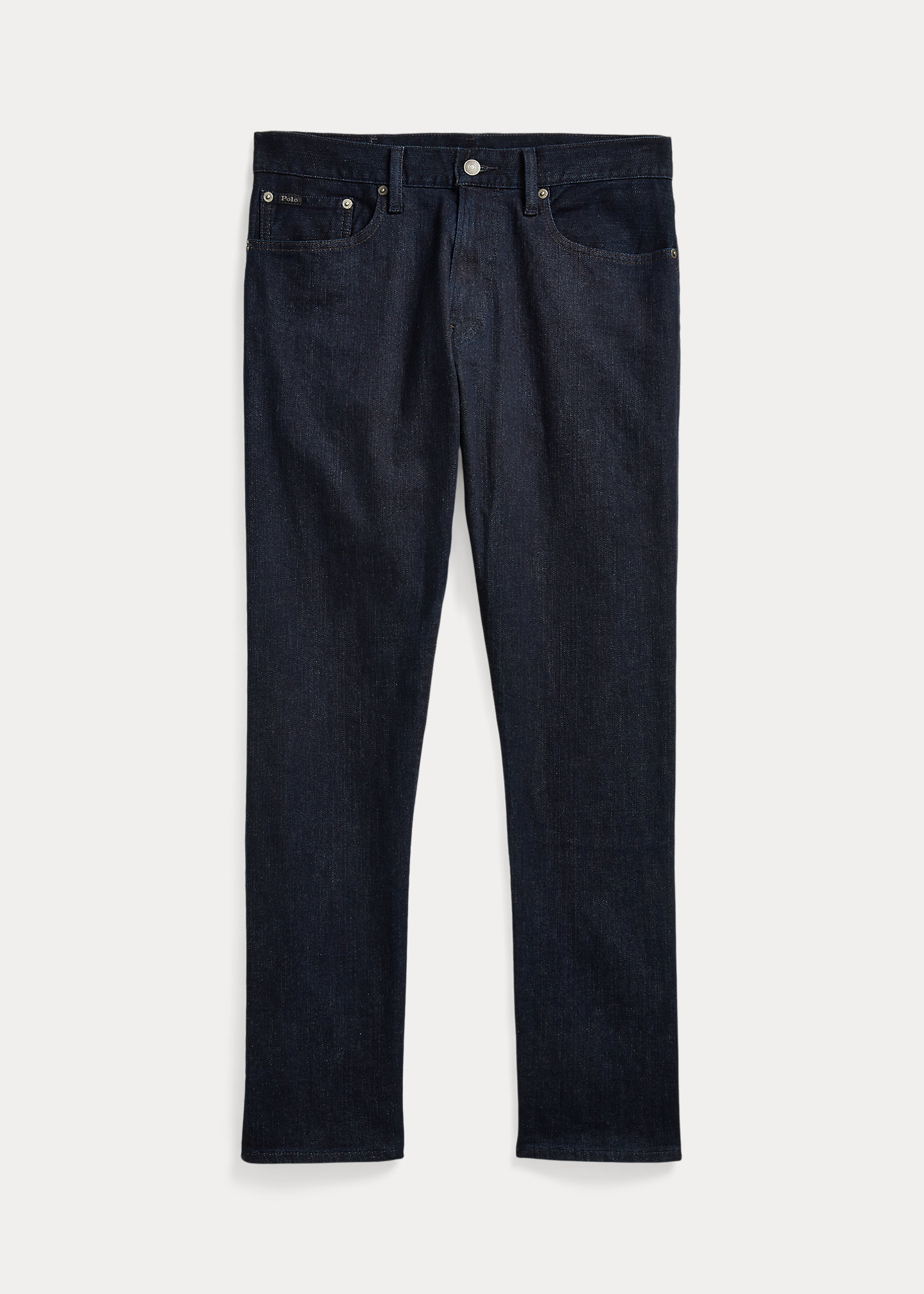 - Five-pocket styling with signature metal rivets. “Polo” label at the coin pocket.