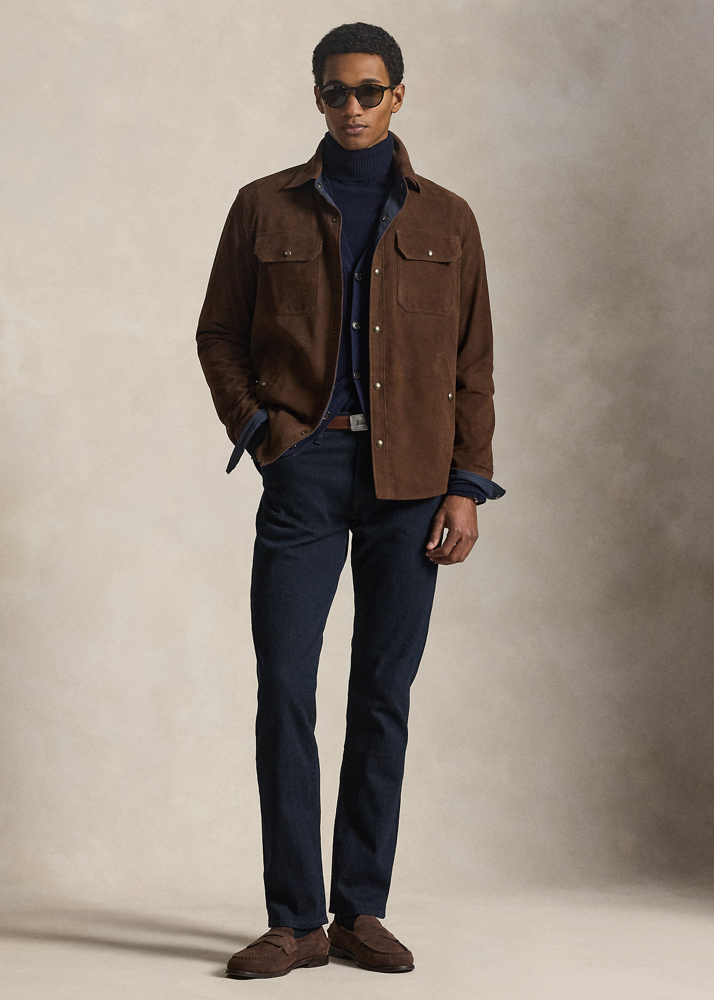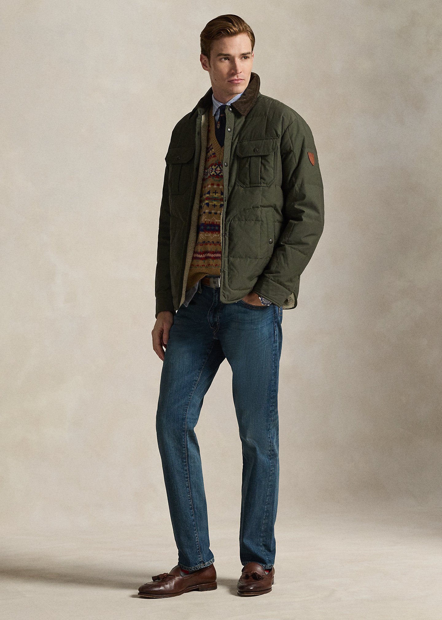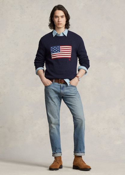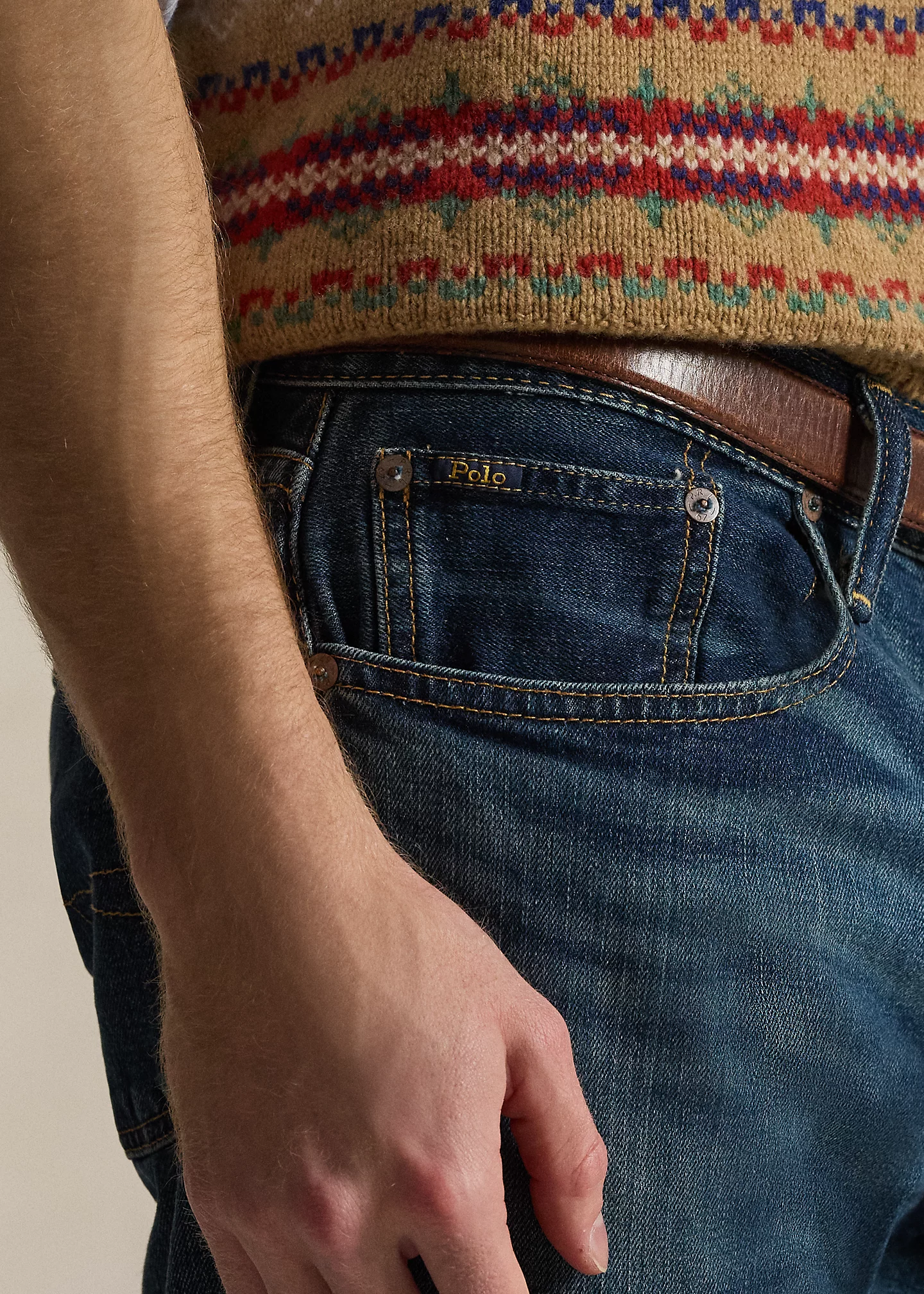 - Five-pocket styling with signature metal rivets. “Polo” label at the coin pocket.