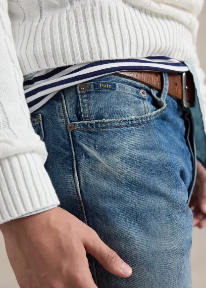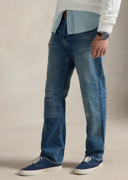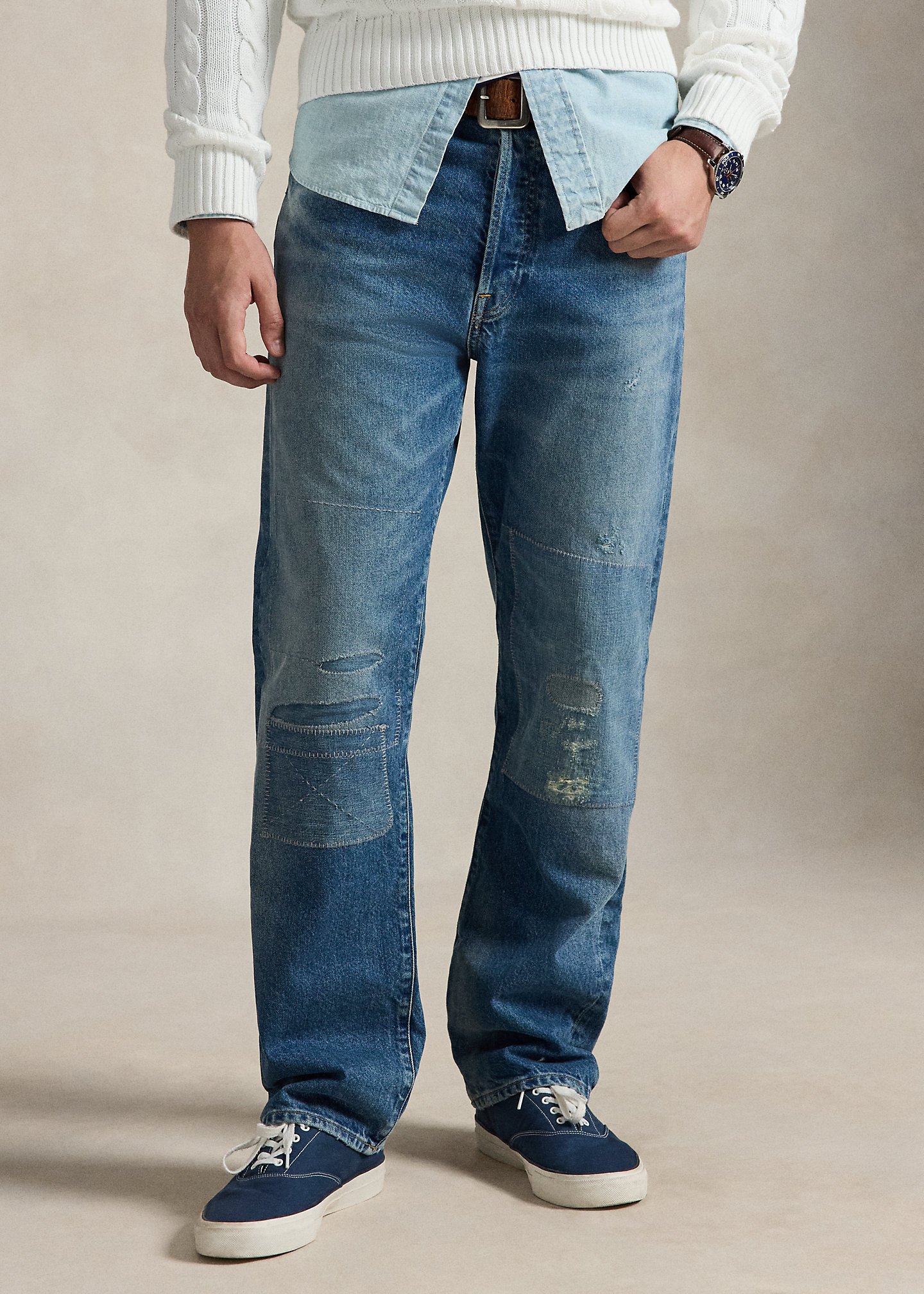- Five-pocket styling with signature metal rivets. Contrasting repair patches.