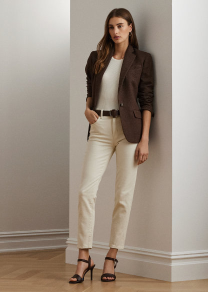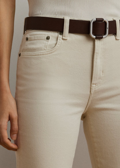 - Five-pocket styling with signature metal rivets. Debossed signature leather patch at the back right waist.