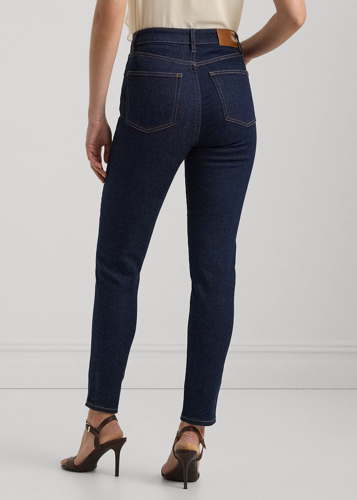 - Five-pocket styling with signature metal rivets. Debossed signature leather patch at the back right waist.