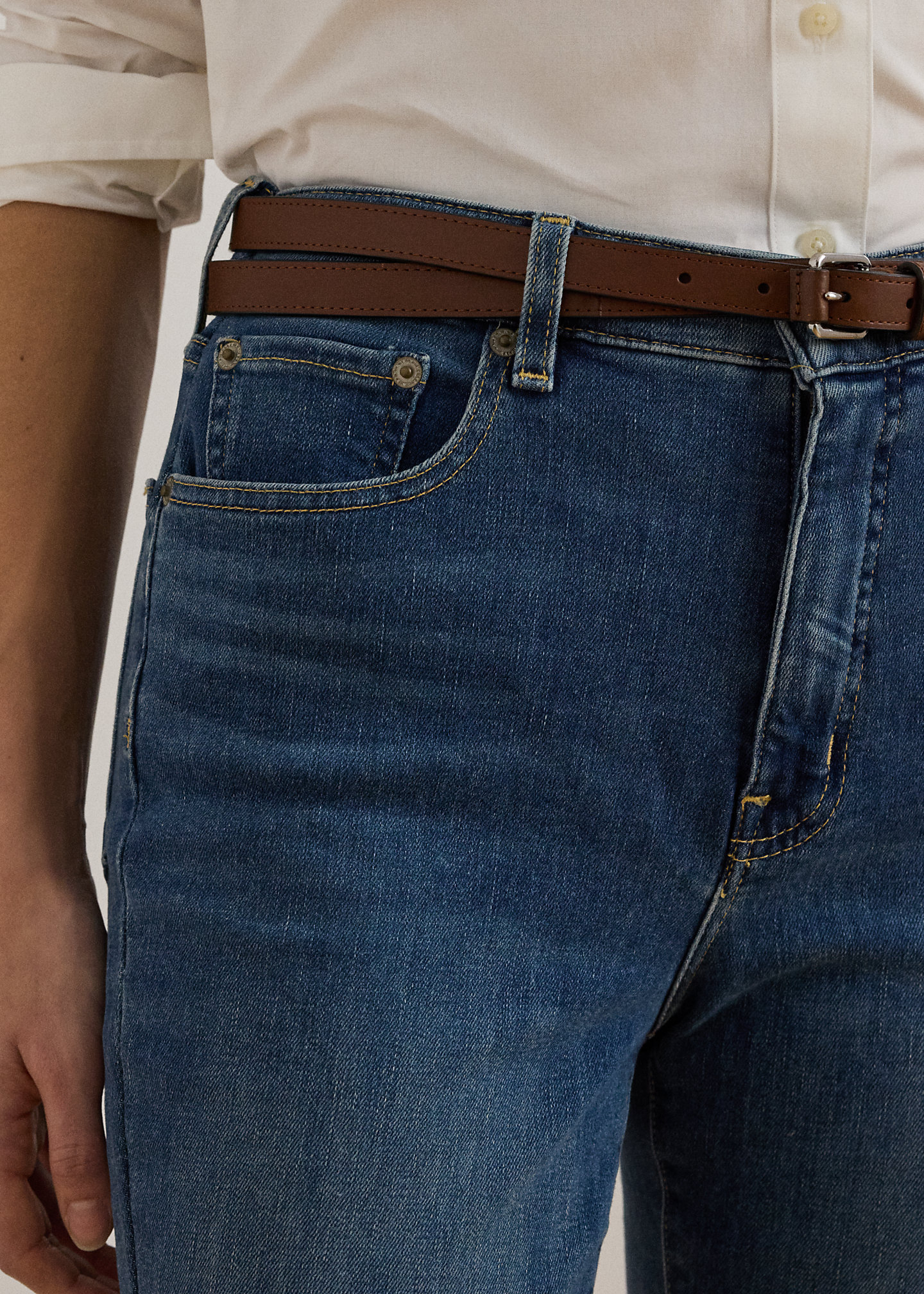 - Five-pocket styling with signature metal rivets. Debossed signature leather patch at the back right waist.