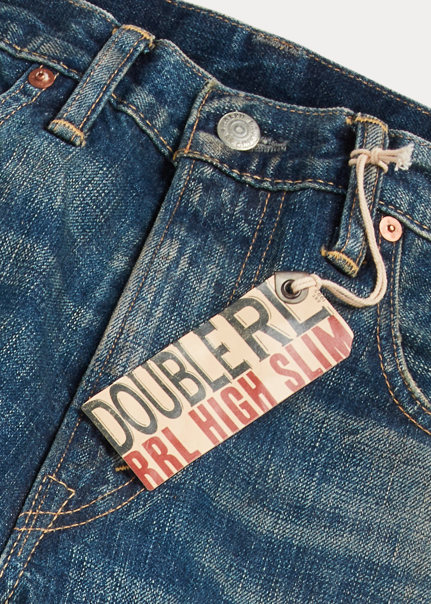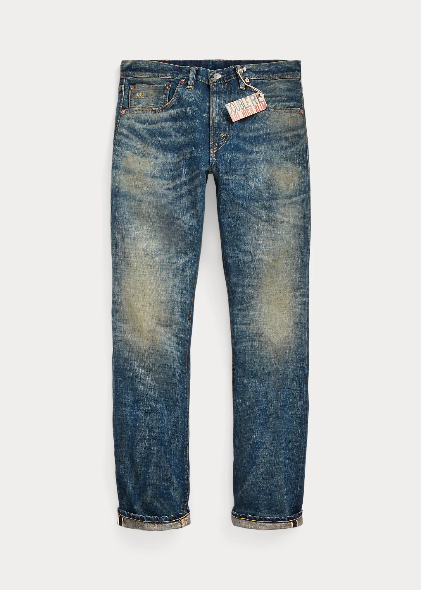 - Leather “RRL”-debossed logo label at the back right waist.