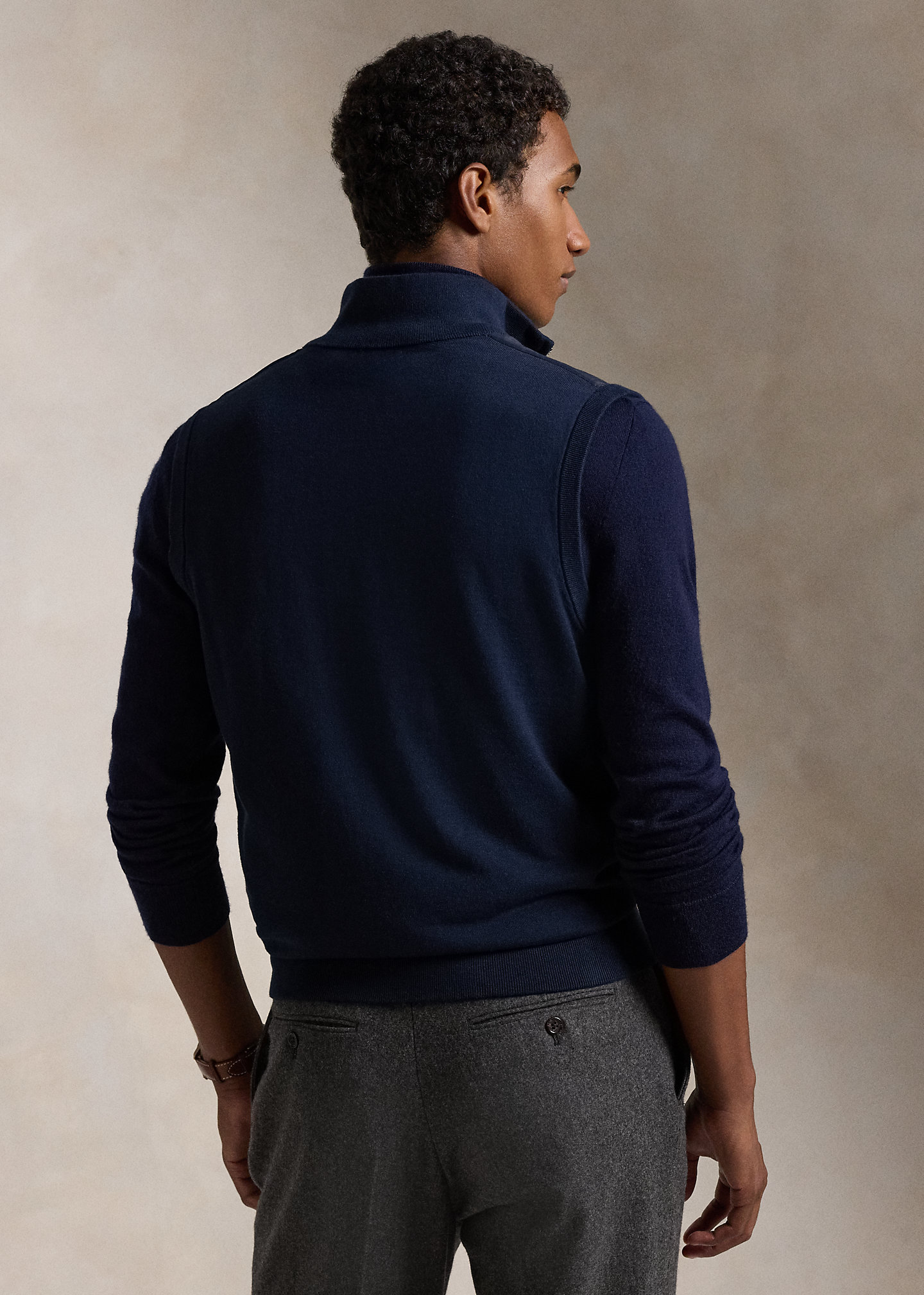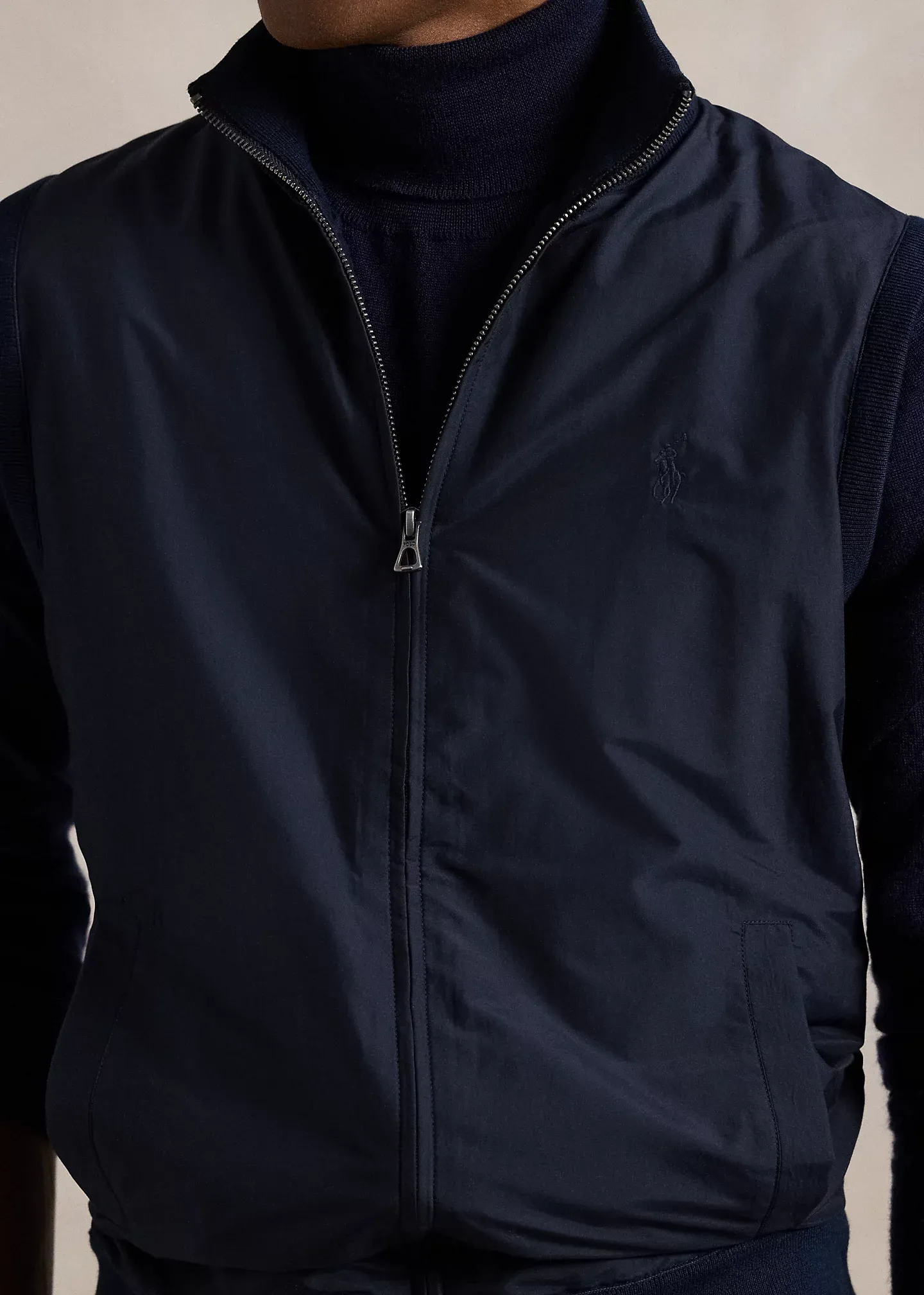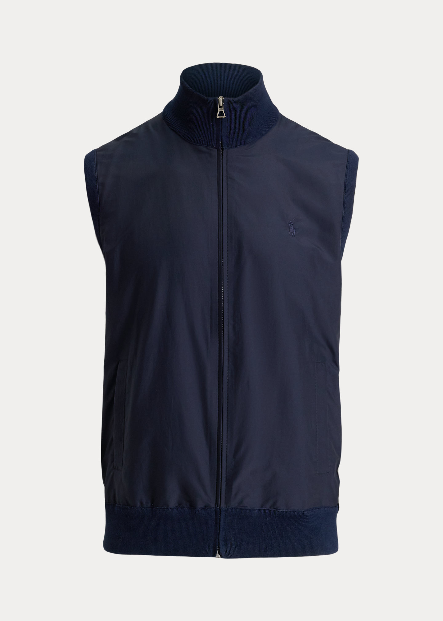 - Rib-knit mockneck. Full-zip front. Rib-knit armholes.