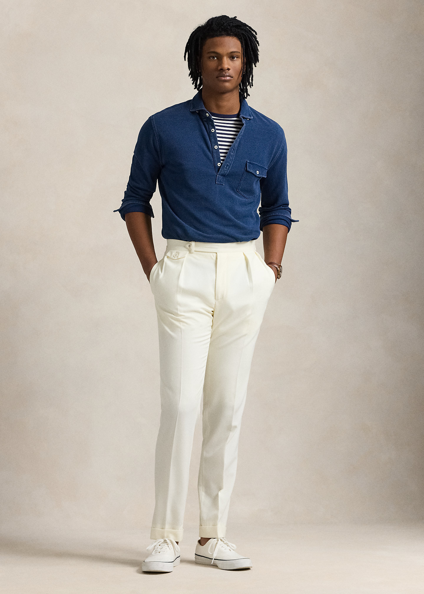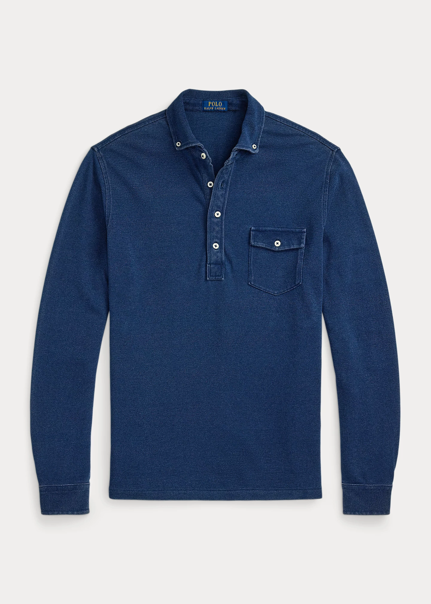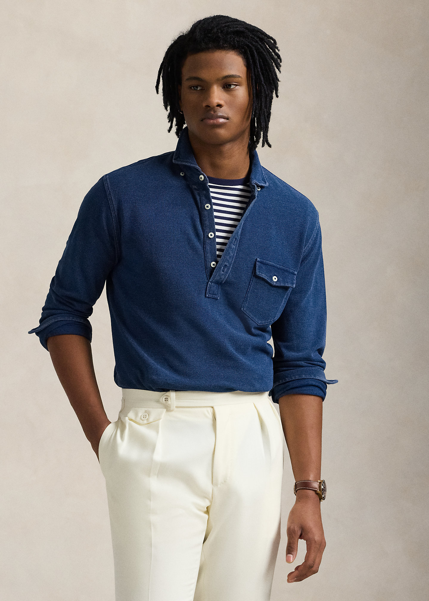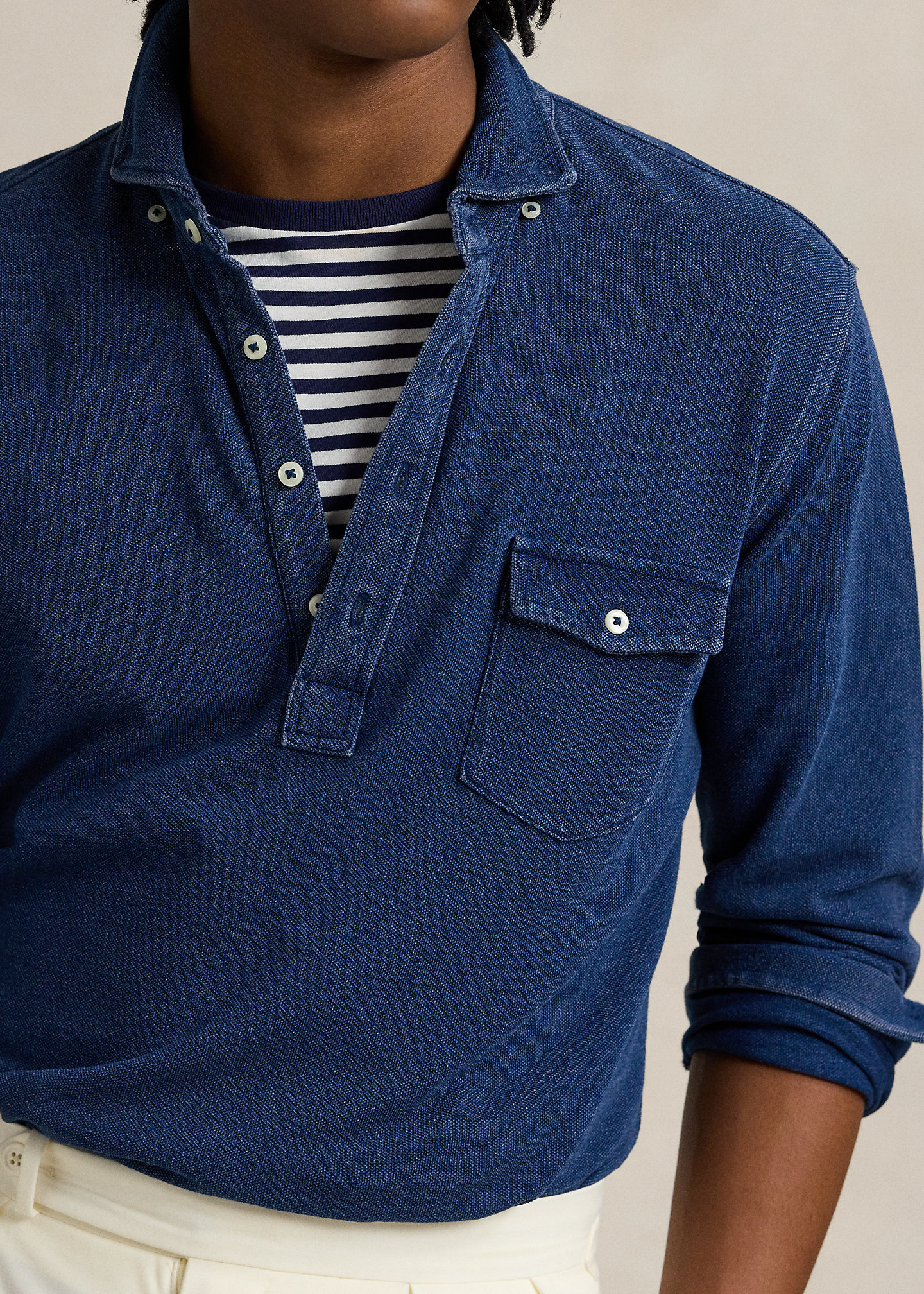 - Button-down collar. Four-button placket. Long sleeves with buttoned barrel cuffs.