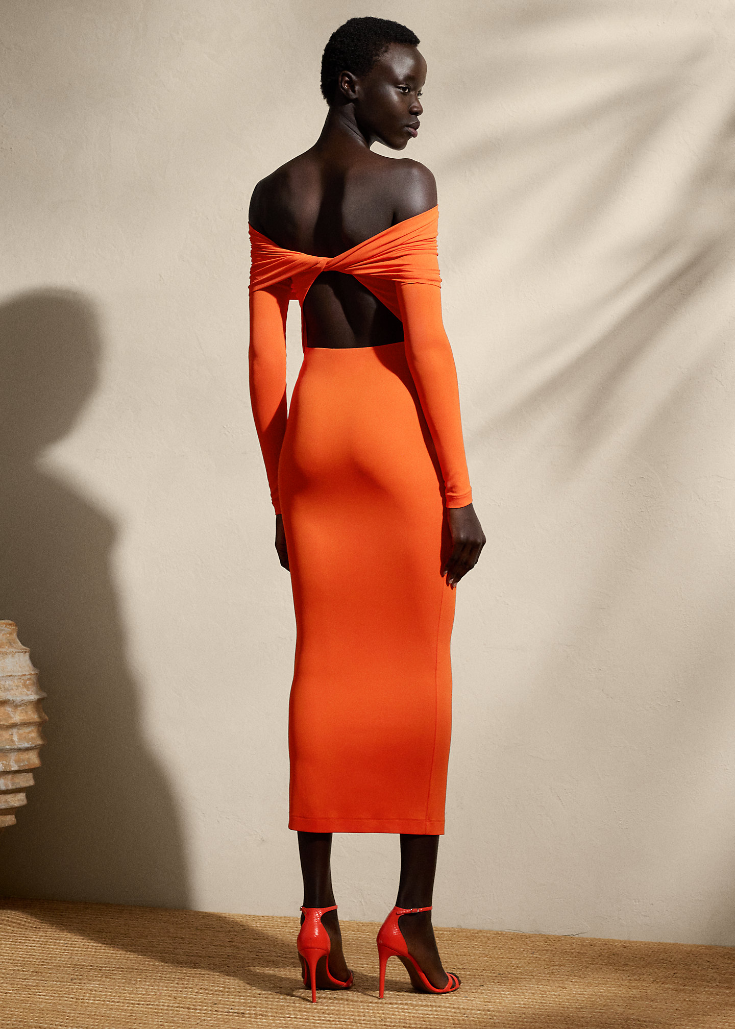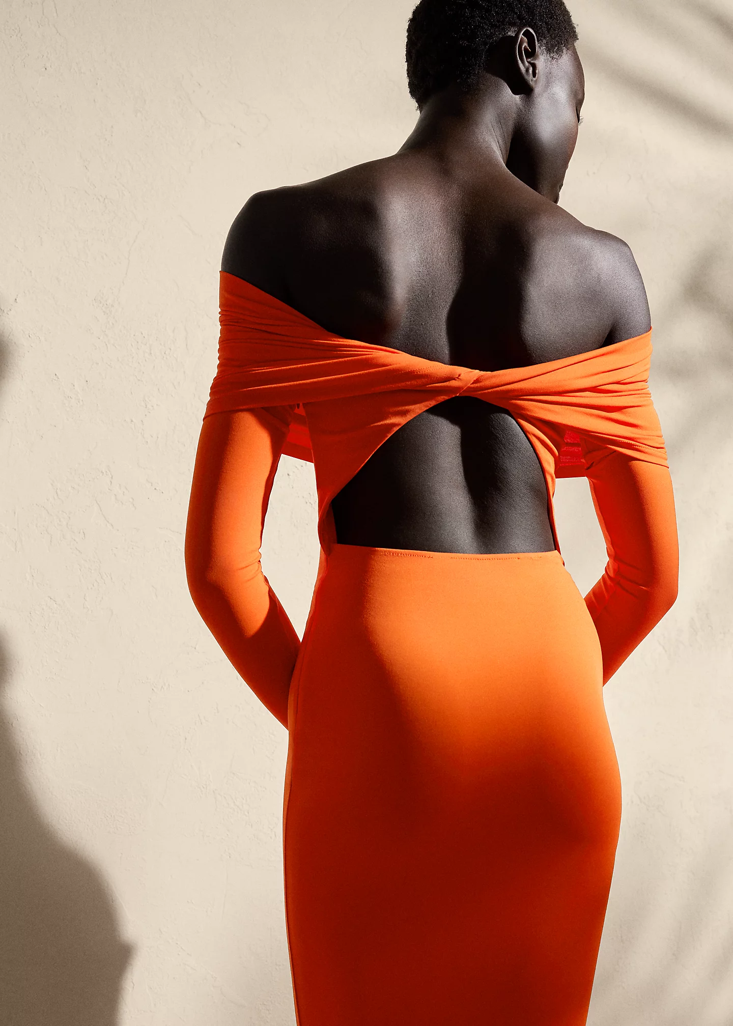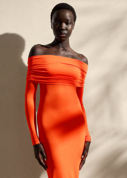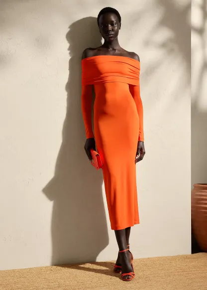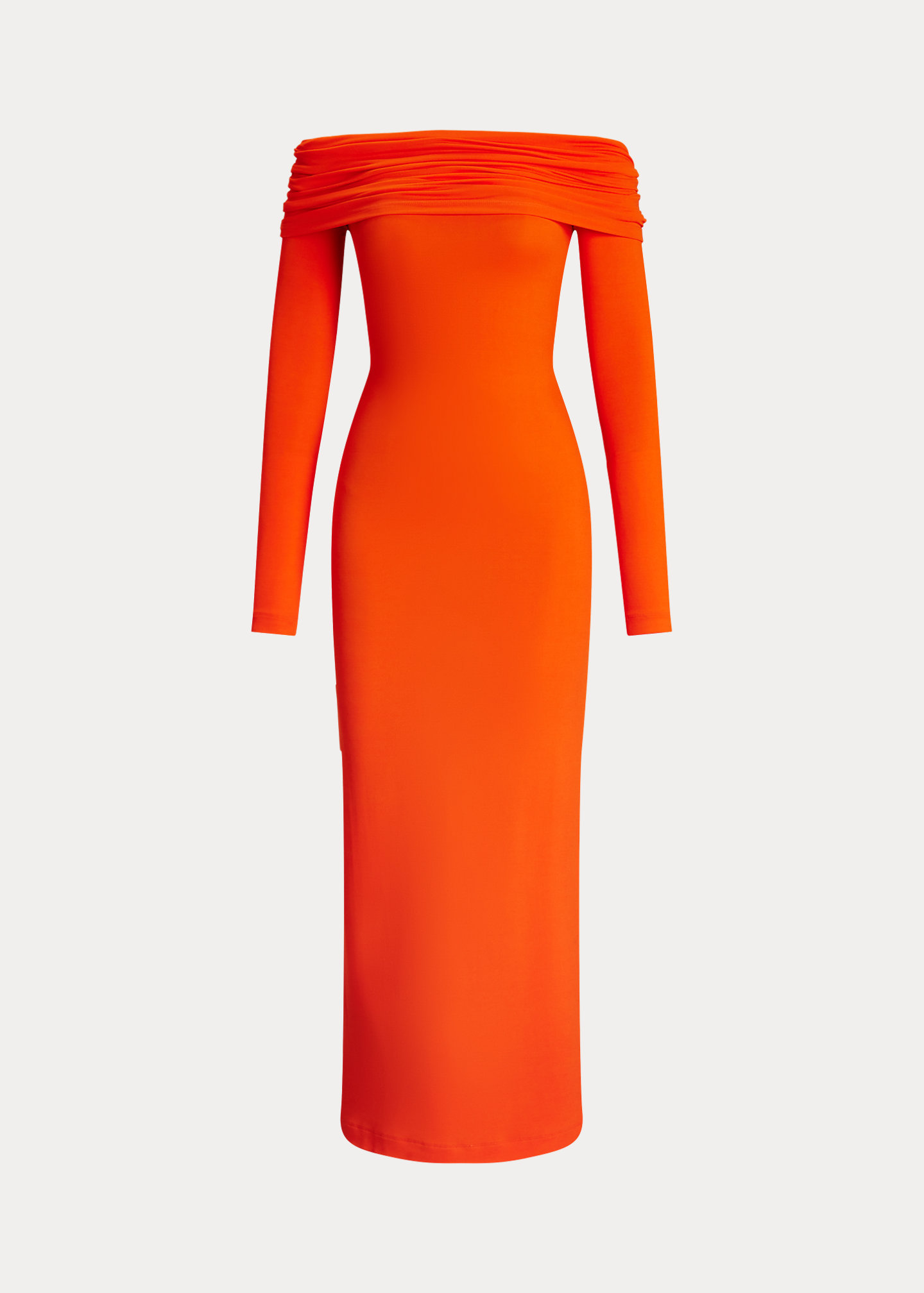 - Fold-over off-the-shoulder neckline. Concealed left-side-seam zipper.