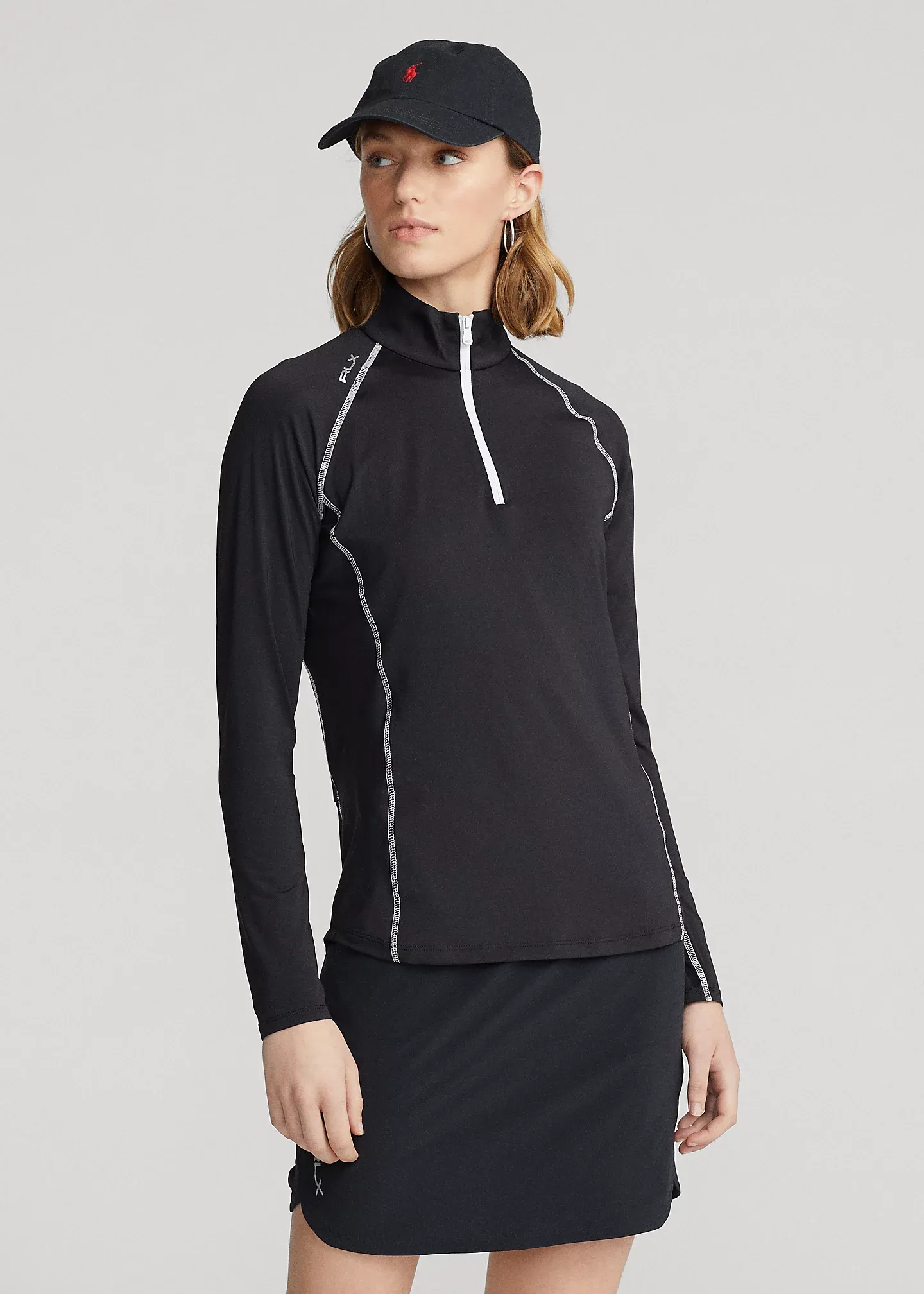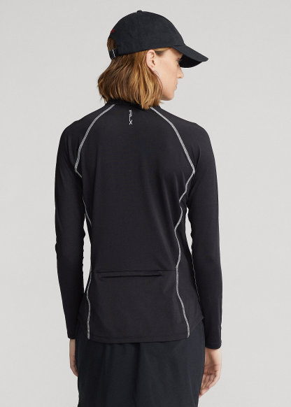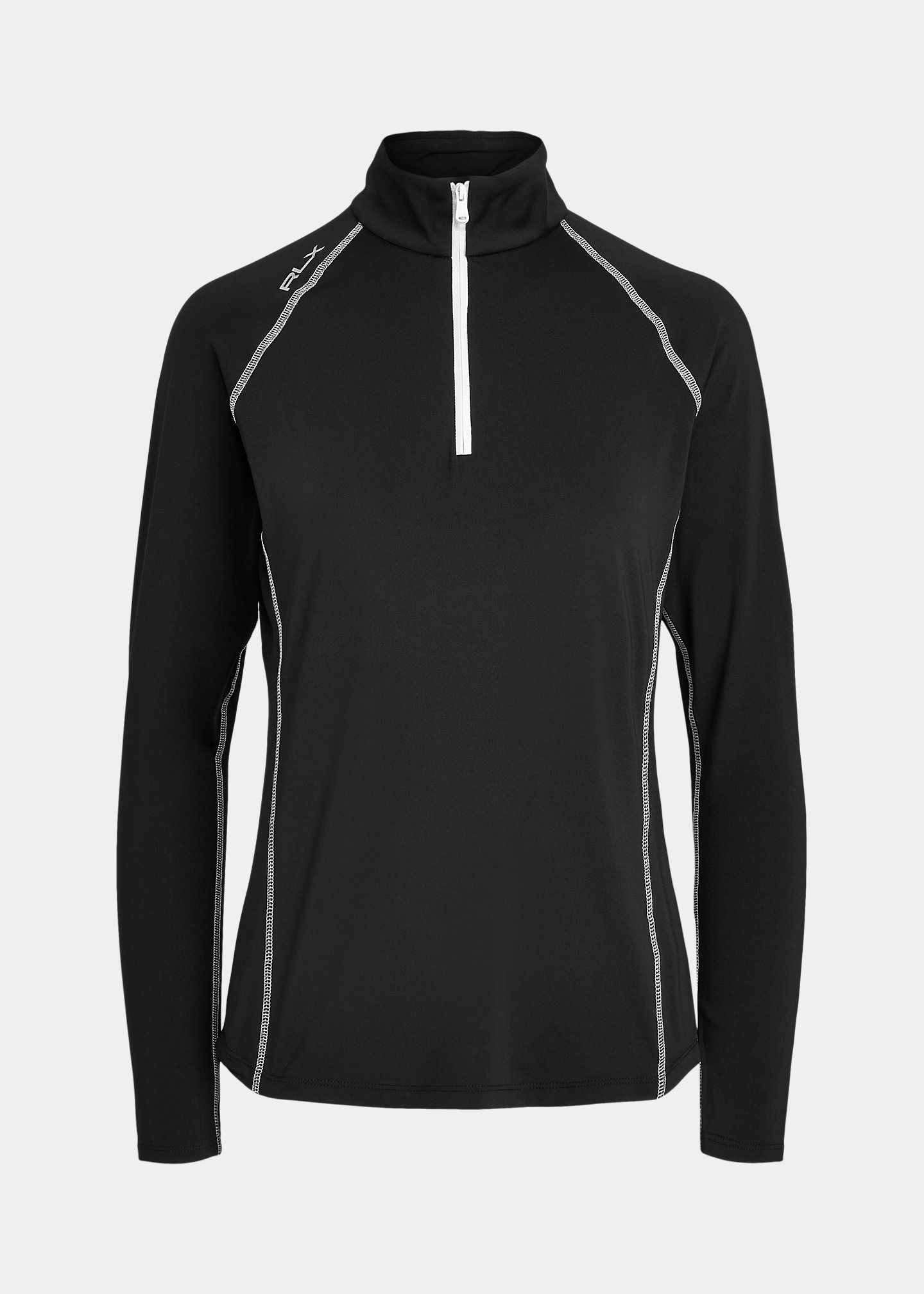 - Back yoke zip pocket. “RLX” rubber-printed at the right shoulder and the center back of the neck.