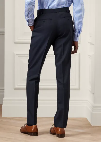 - Trouser: side adjusters; zip fly with an extended hook-and-bar closure; curtain waistband; two front angled pockets; coin pocket; two back buttoned pockets.