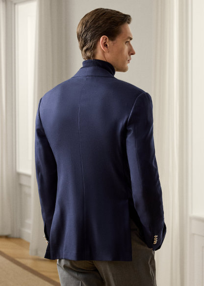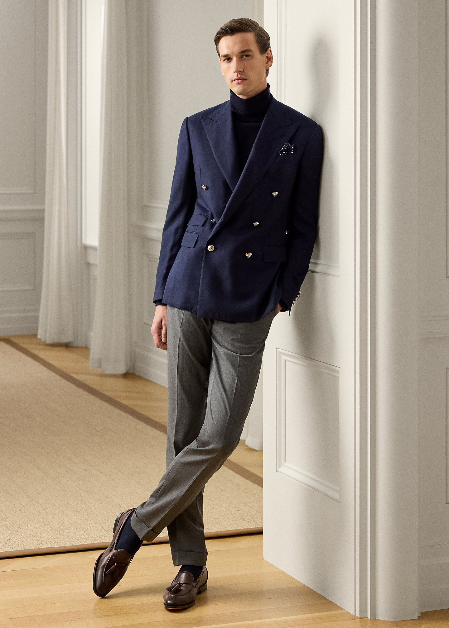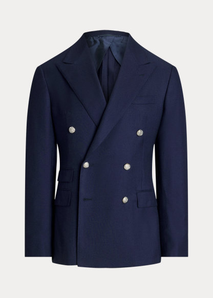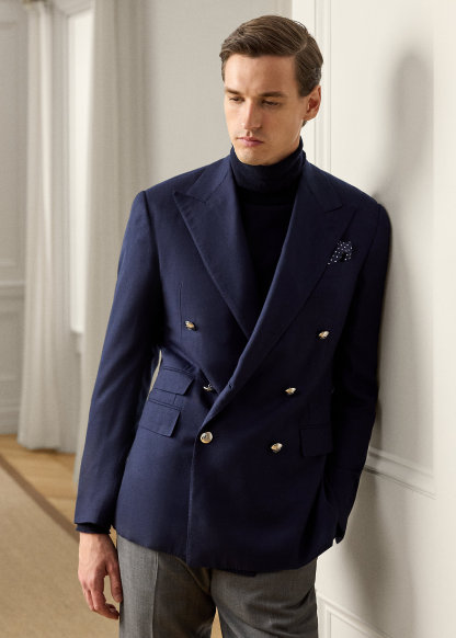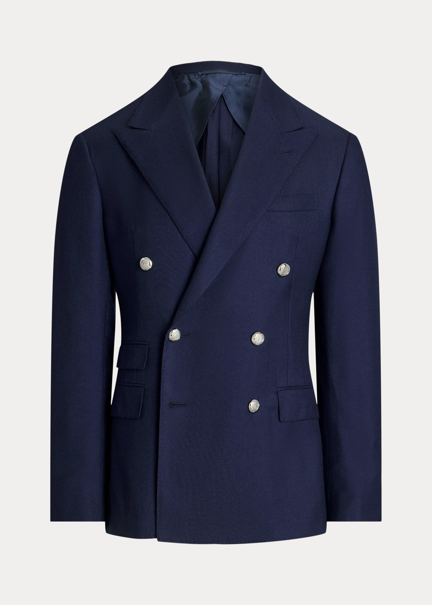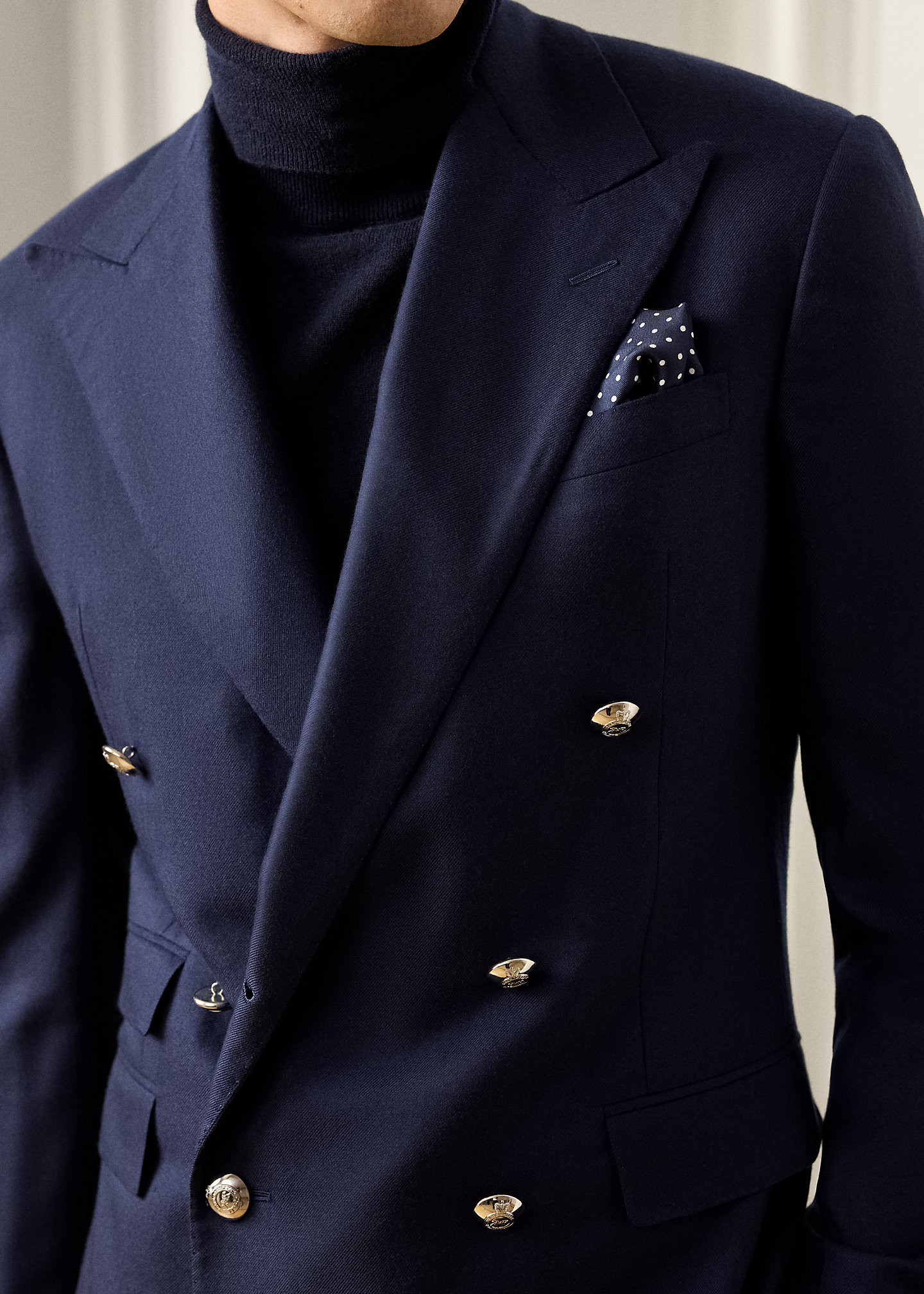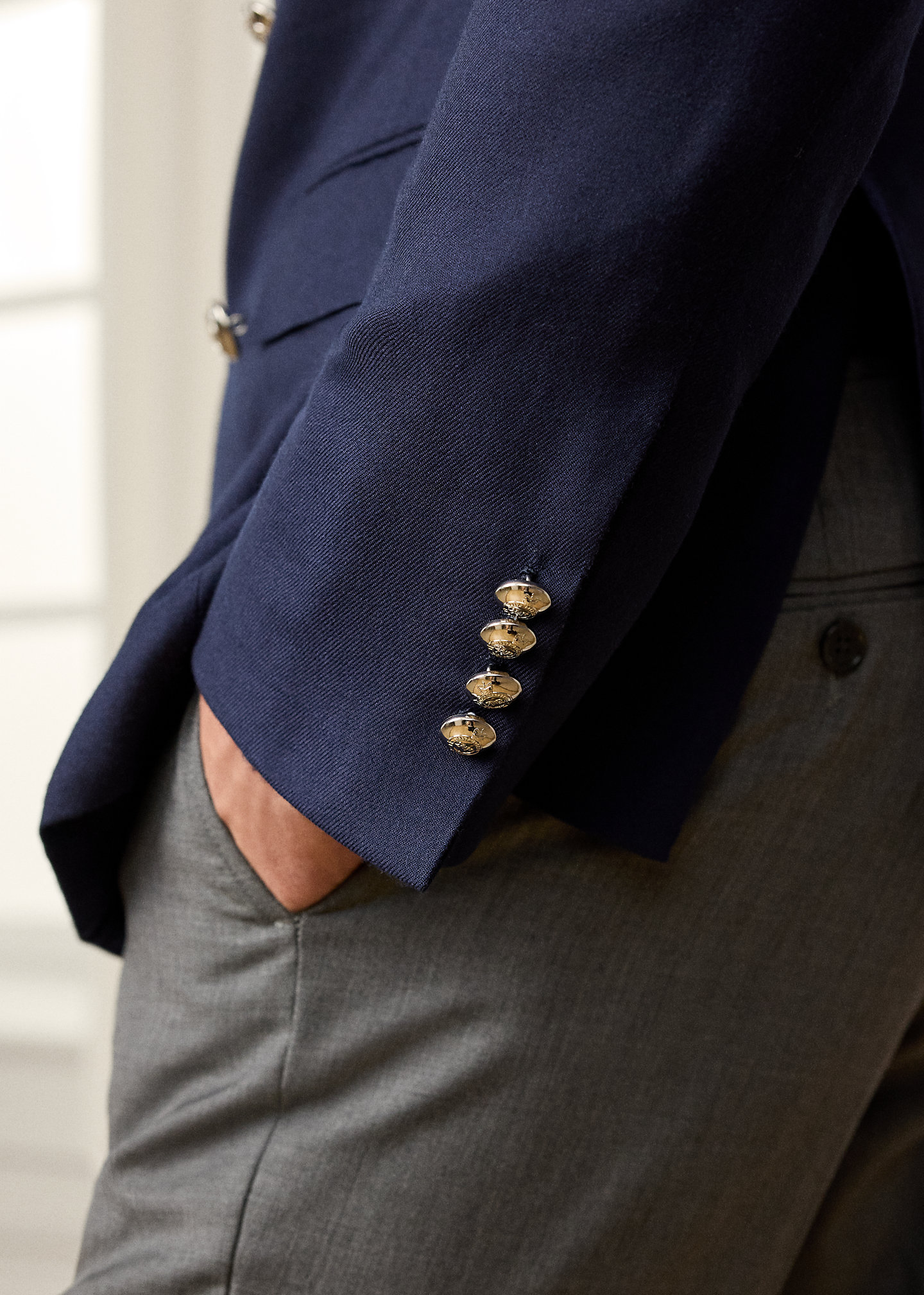 - Peak lapels. Buttonhole at the left lapel. Double-breasted silhouette. Silver-tone brass buttons engraved with a signature crest.