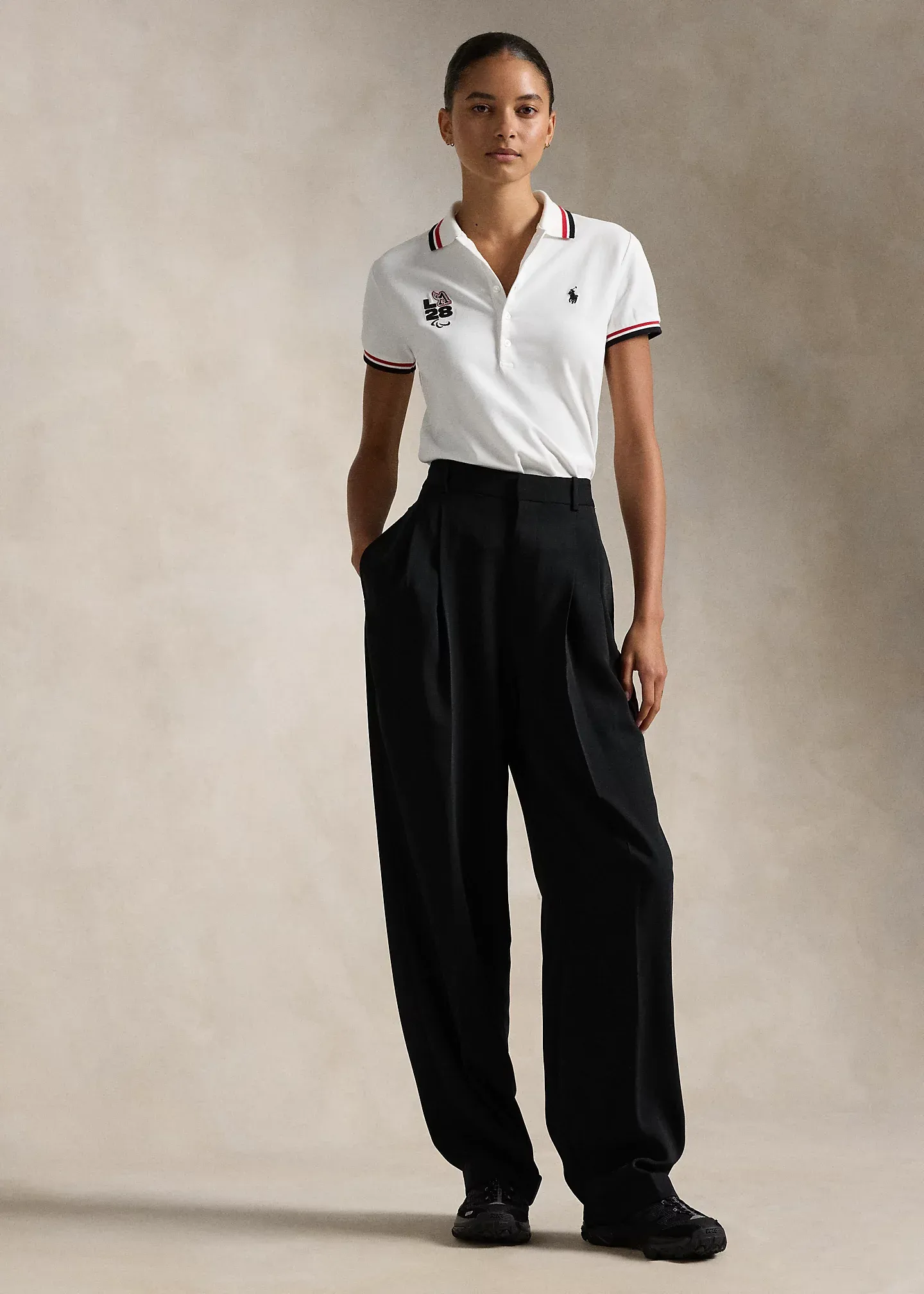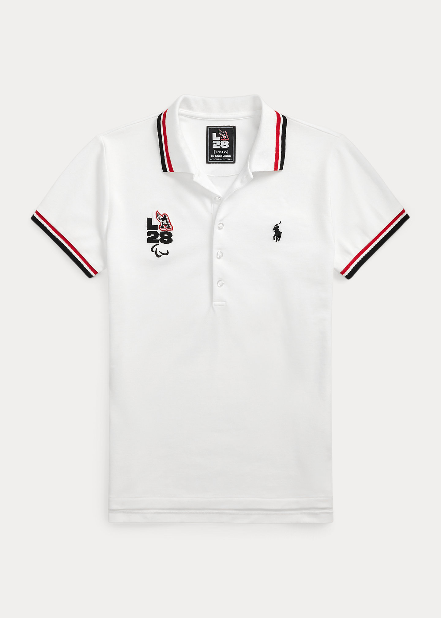 - Official Games logo that includes “LA28" and Paralympic Agitos embroidery at the right chest. Signature embroidered Pony at the left chest.