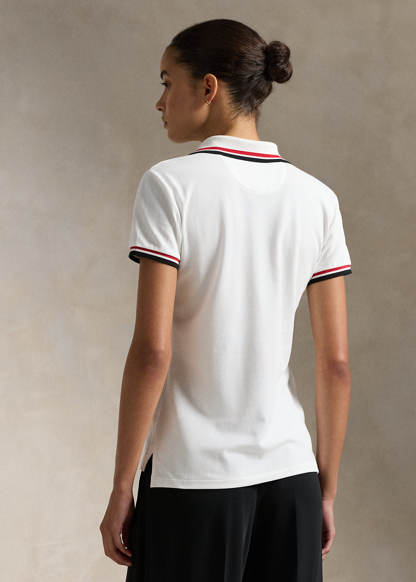 - Ribbed Polo collar with striped tipping. Five-button placket. Short sleeves. Ribbed cuffs with striped tipping. Tennis tail.