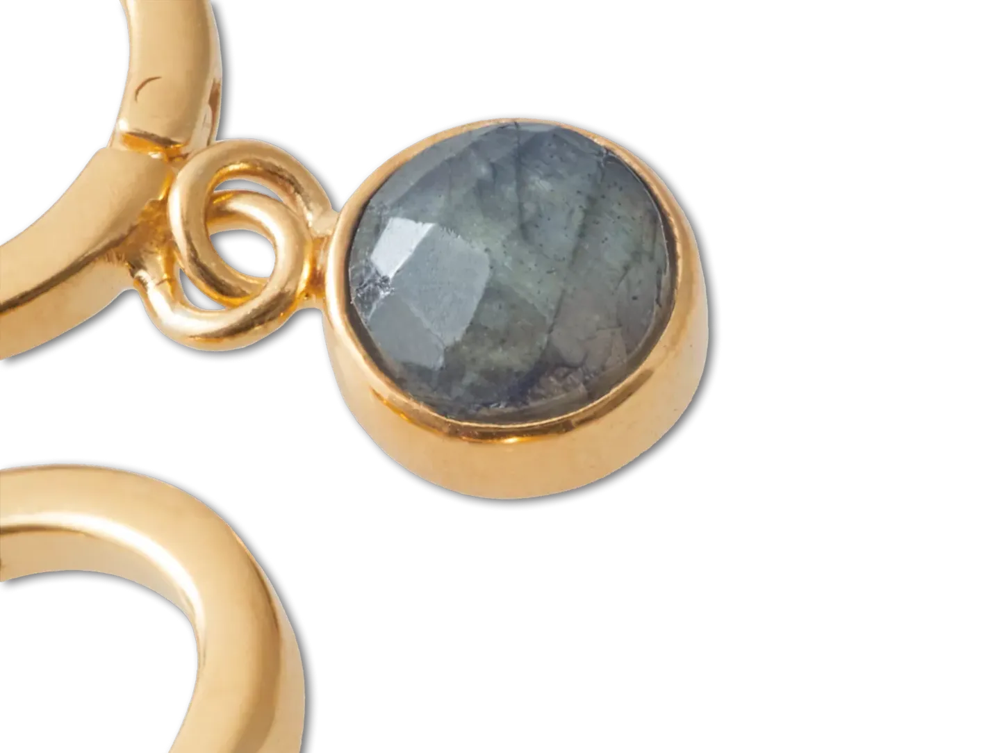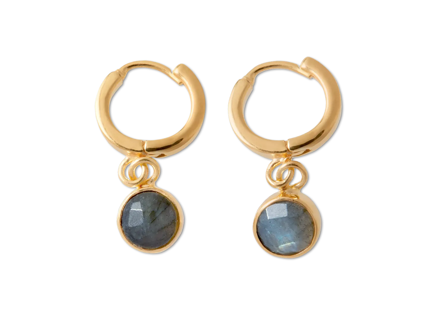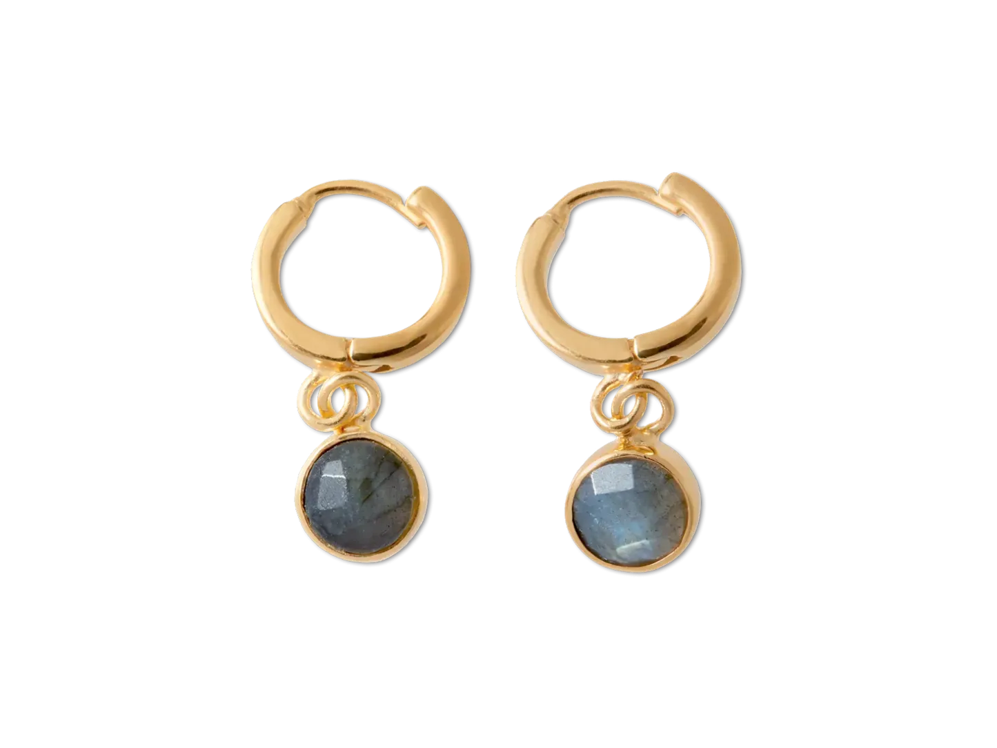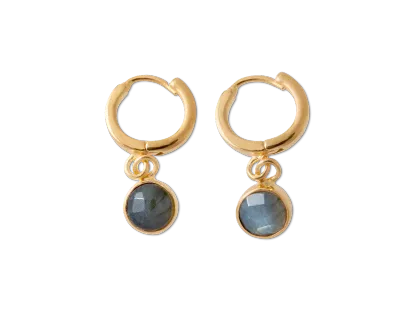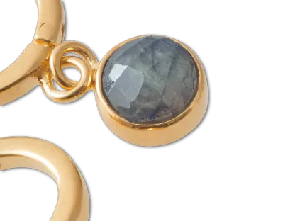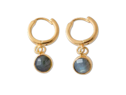 Deze tijdloze oorringen hebben een prachtige labradoriet edelsteen. Labradoriet staat bekend als een krachtige beschermer. Het bestrijdt stress en negatieve energie, en wekt je ware potentieel.