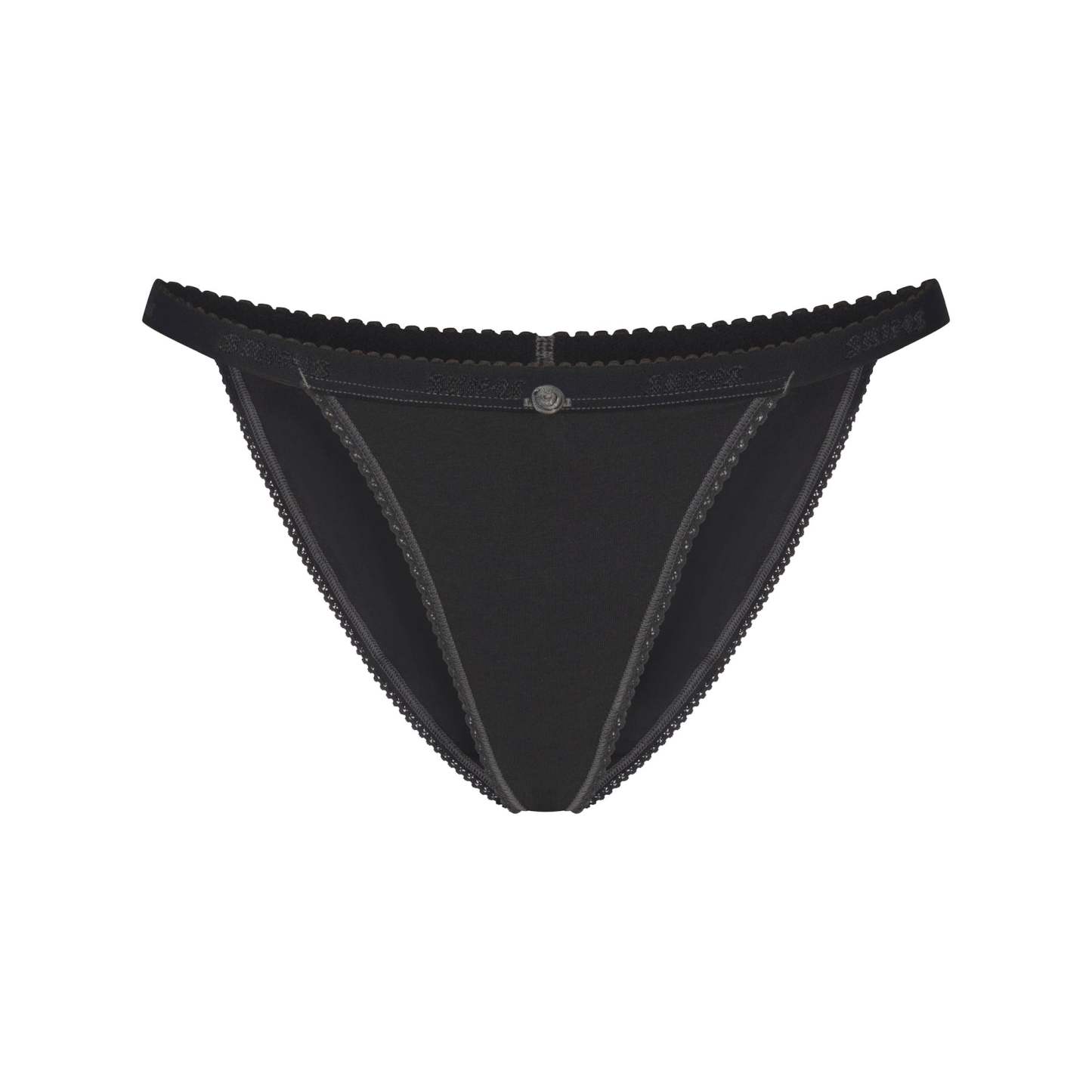 Lightweight cotton comfort meets feminine allure in this string bikini. With delicate lace elastic and a dainty rosette detail, this bikini instantly sweetens your top drawer. Includes a 100% cotton gusset. Finished with a repetitive logo on the picot elastic waistband. Fits true to size.