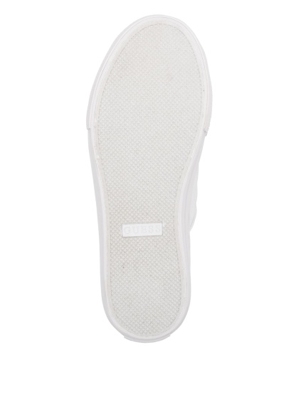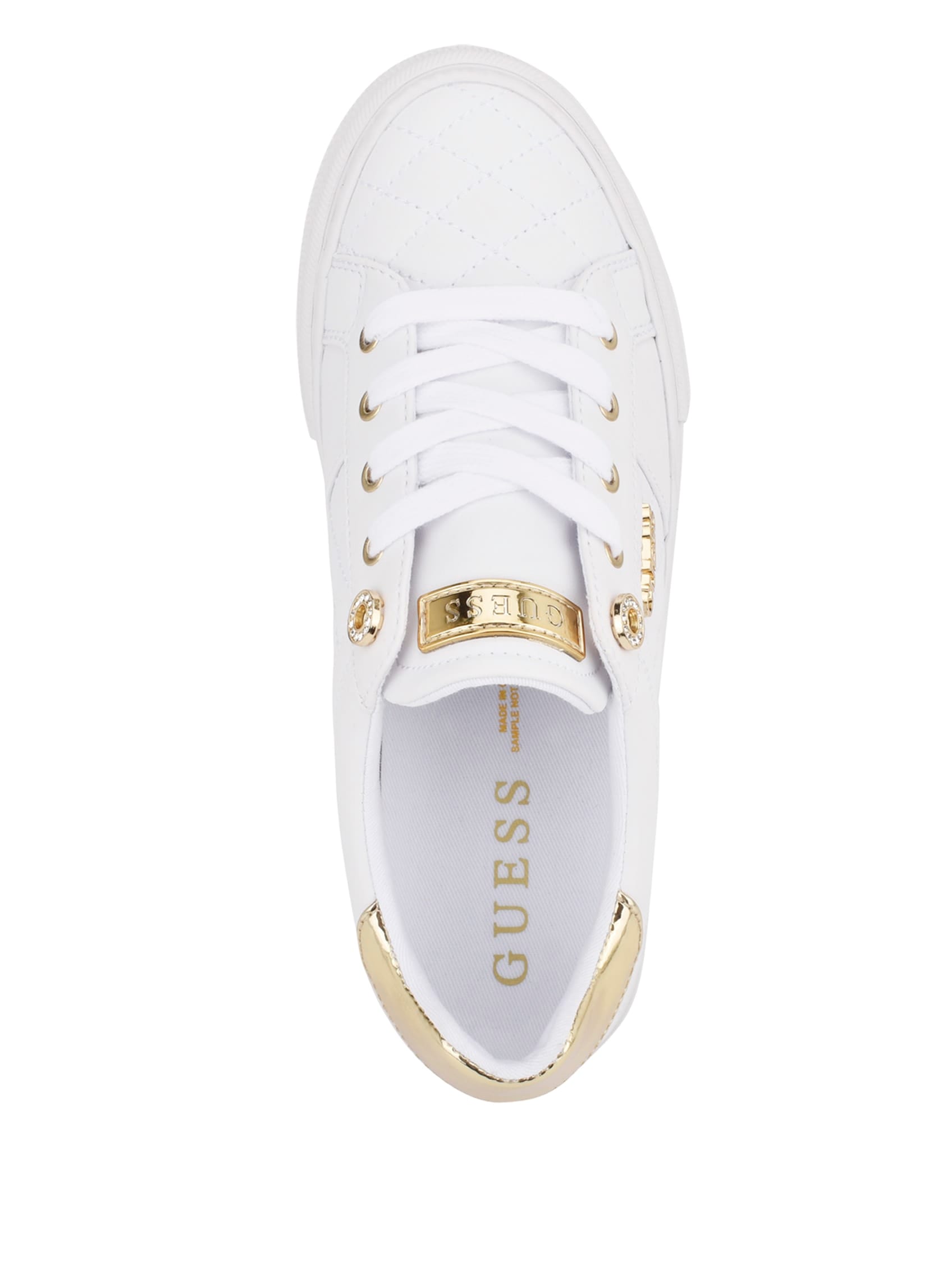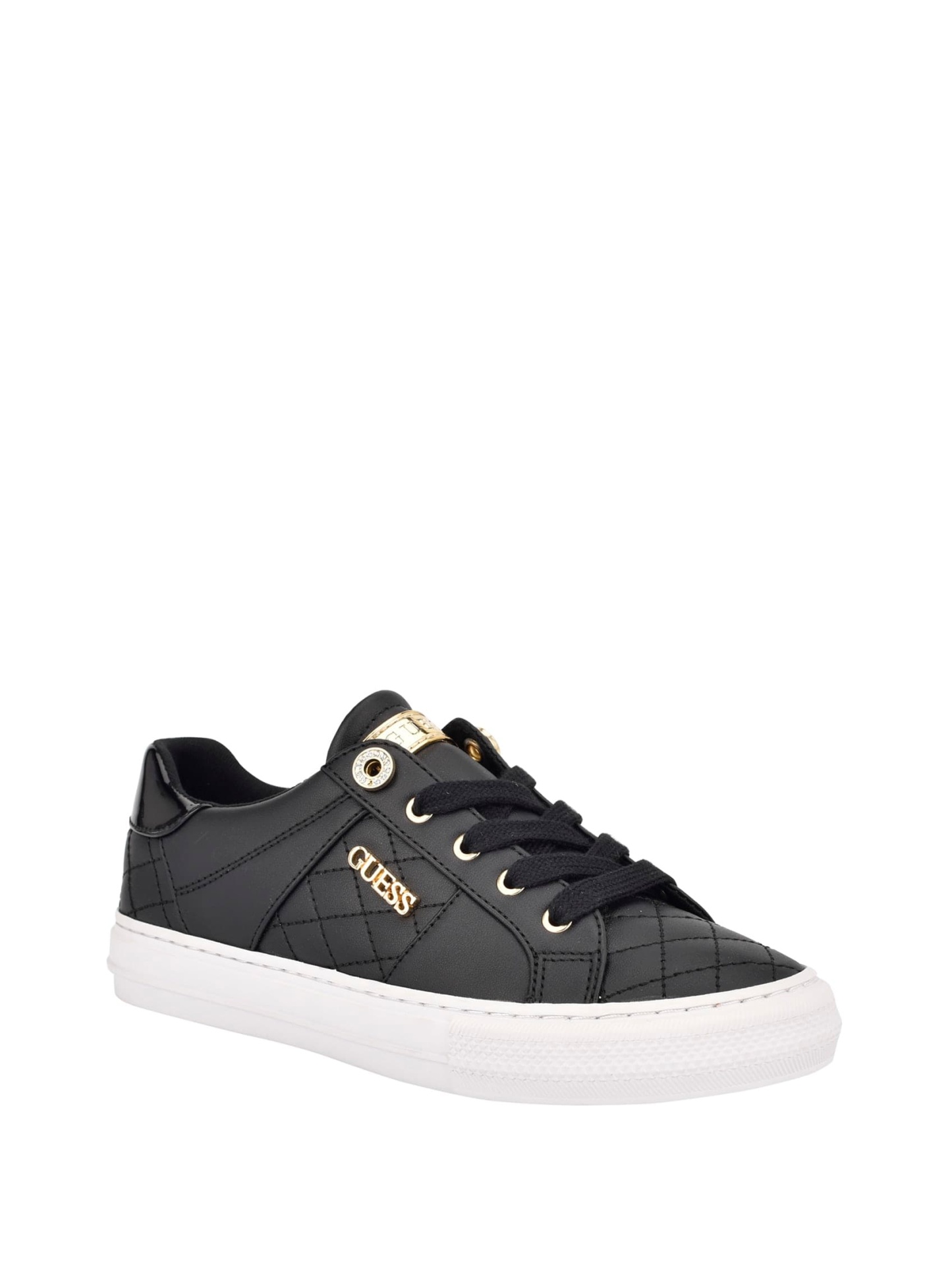 Pair of low-top sneakers constructed in a faux-leather fabrication featuring quilted paneling, gold-tone logo accents and lace-up closure.