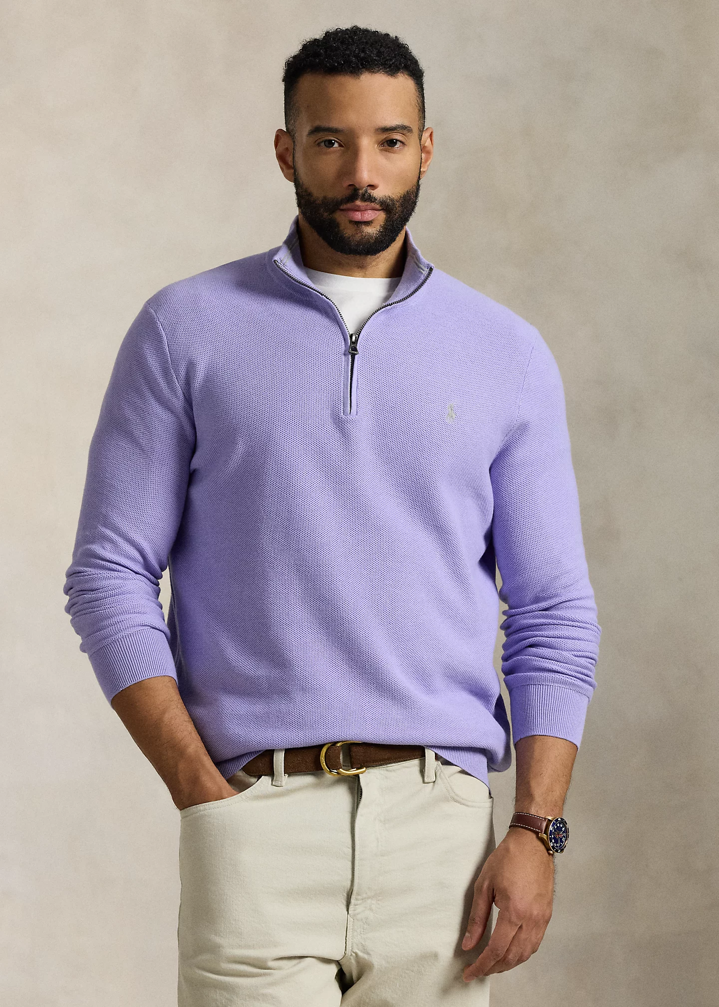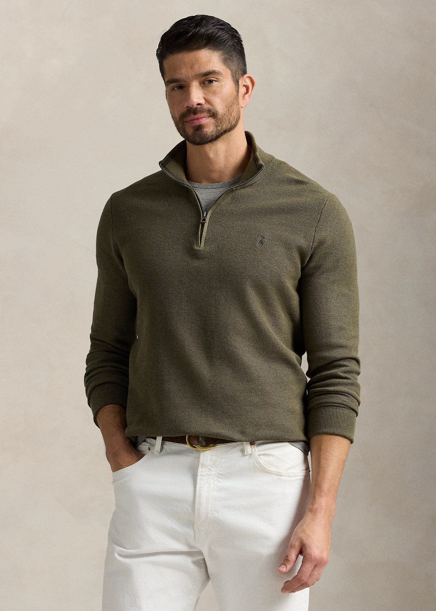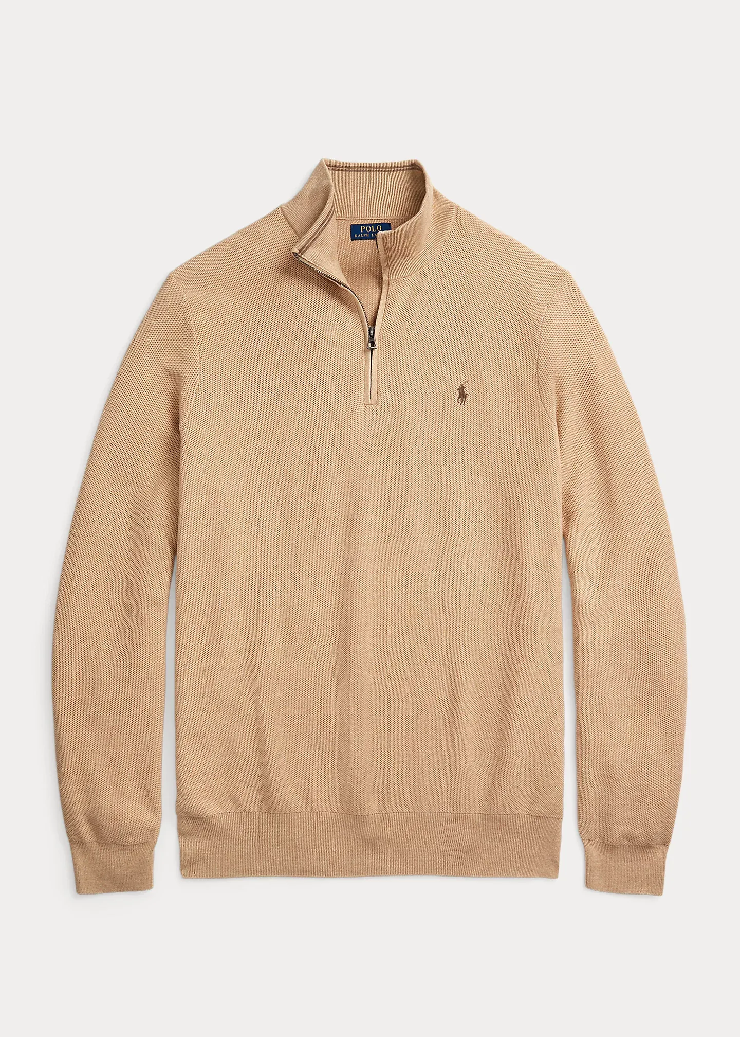 - Rib-knit mockneck. Quarter-zip placket.