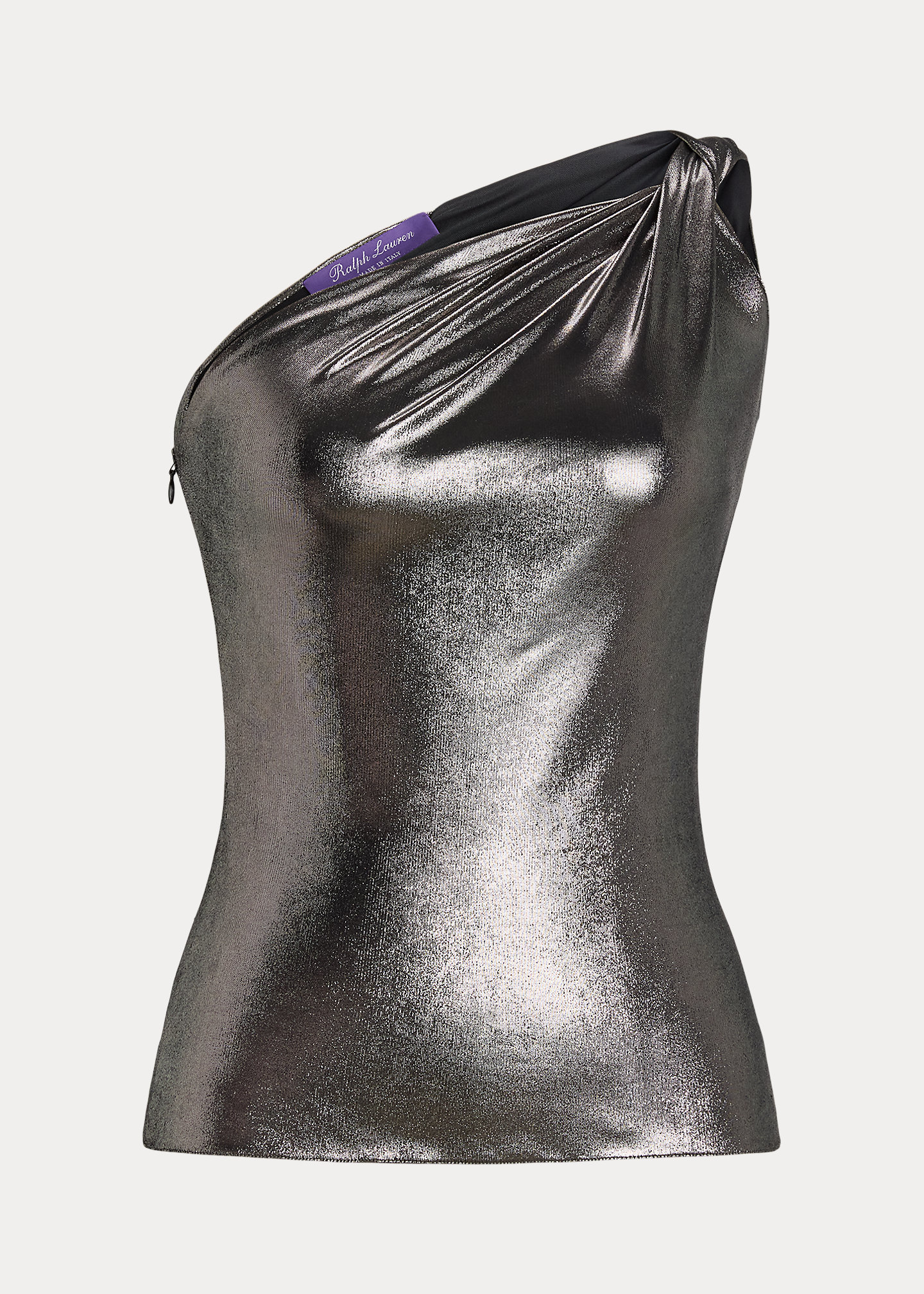 Twisted one-shoulder neckline. Concealed right-side-seam zipper with a hook-and-eye closure.