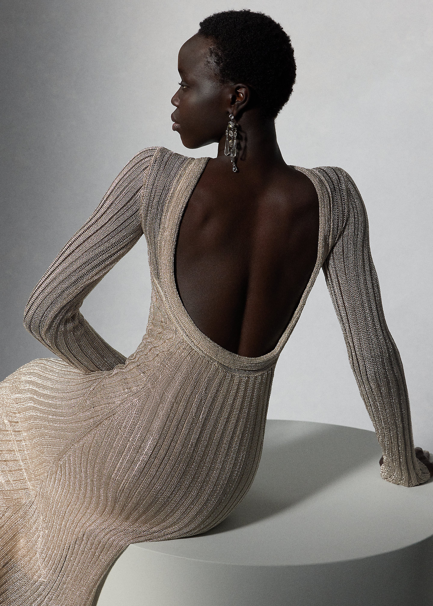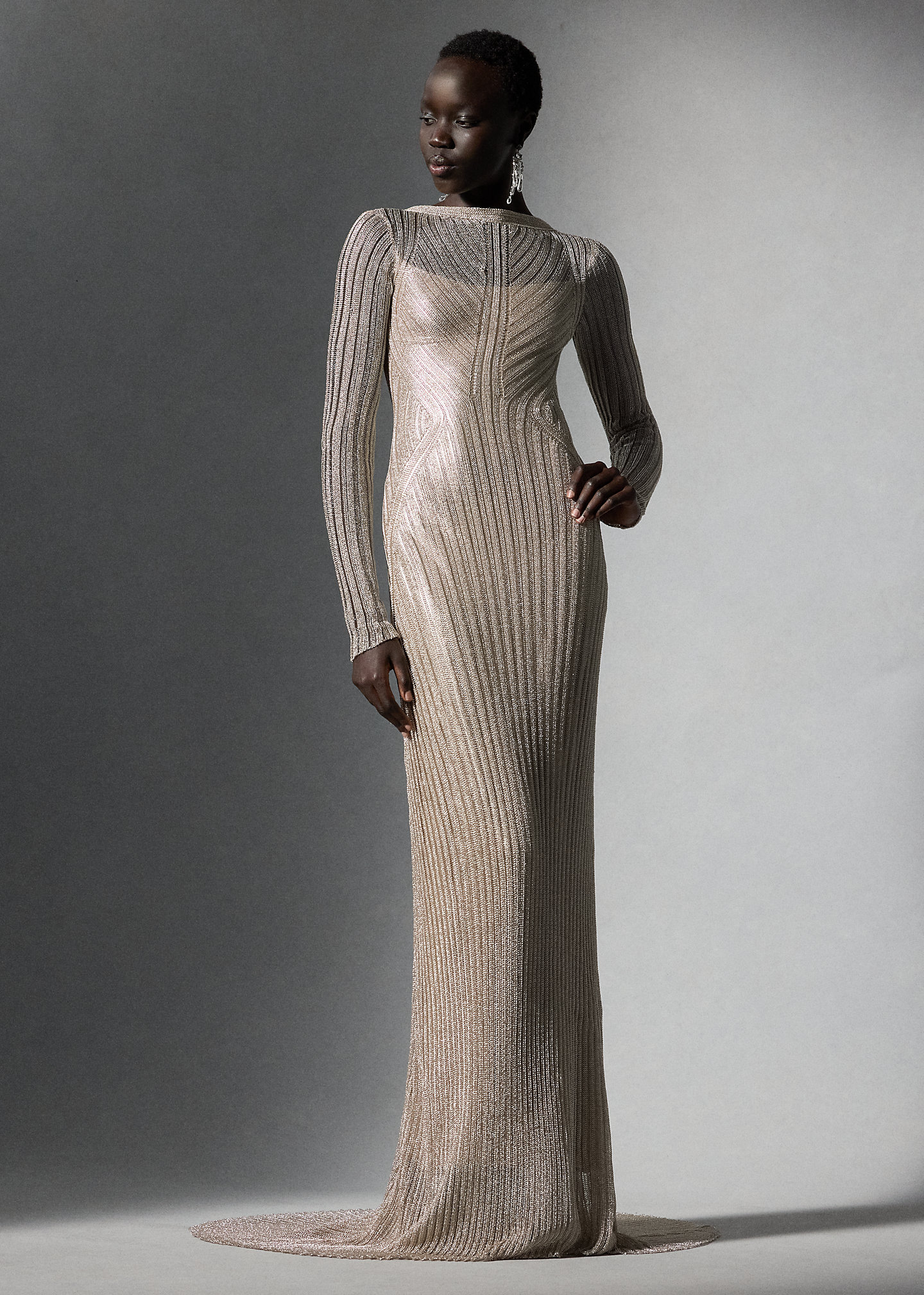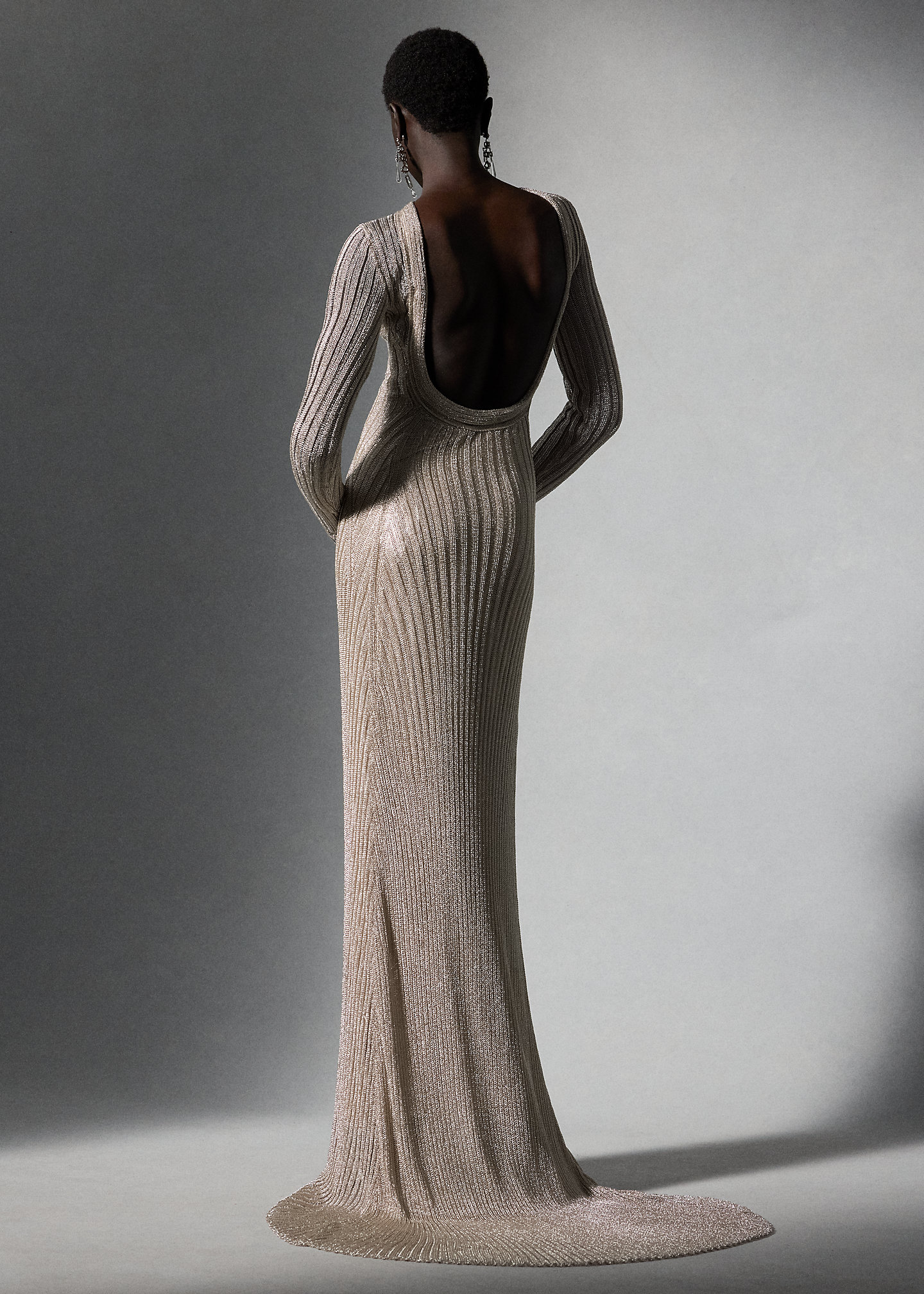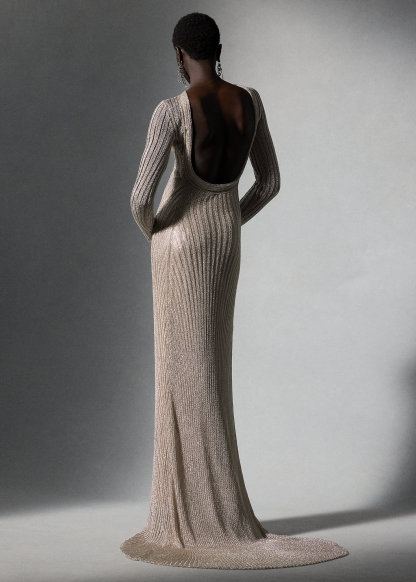- Long sleeves. Backless silhouette. Train at the skirt.
