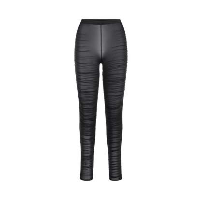 - High-waisted, Elastic waist, Ruching details throughout, Raw cut leg opening, Full length
