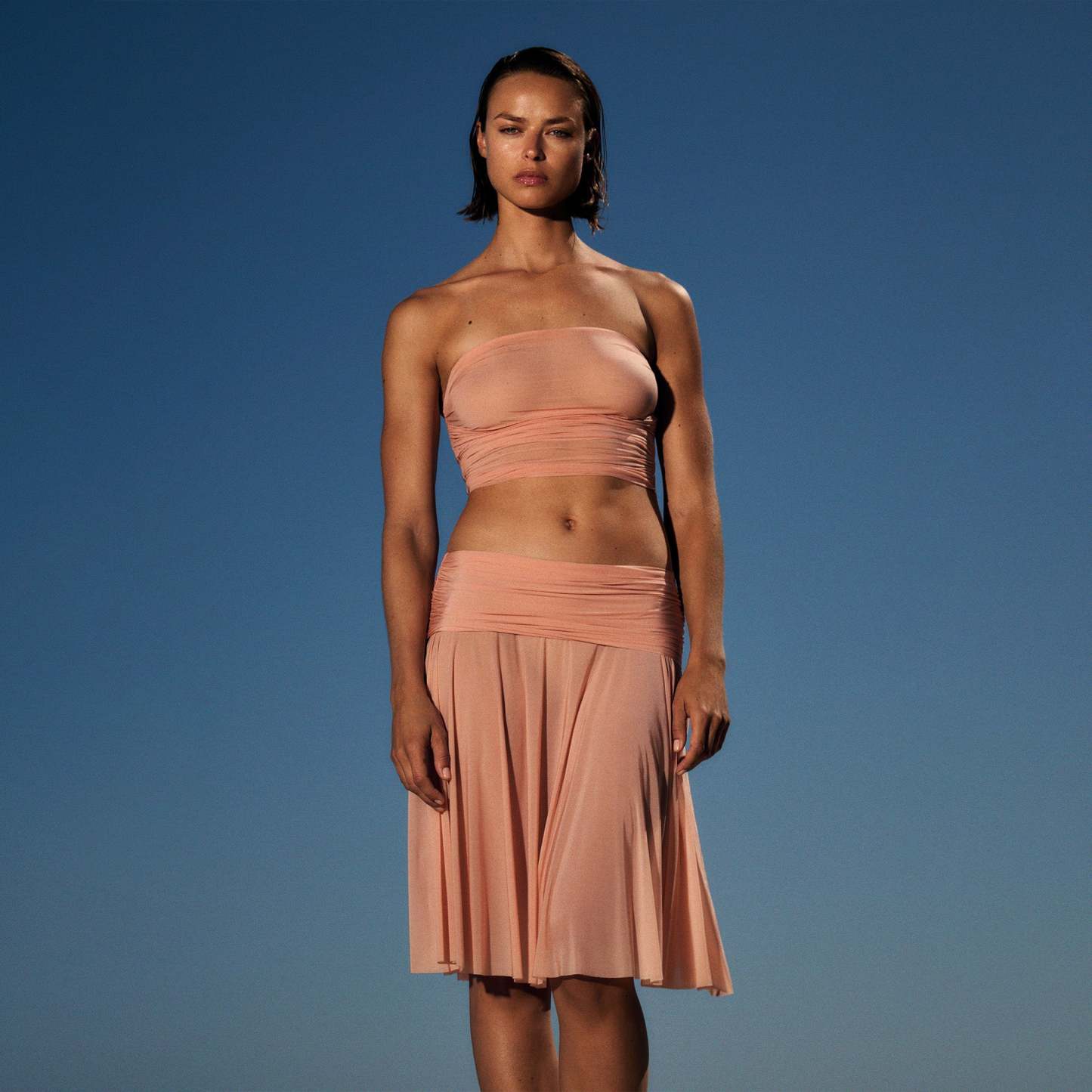 A midi made for showing off. This A-line skirt is made with our lightweight, stretchy Milky Sheer fabric and features an elastic, fixed foldover waistband with sexy ruching details. Complete with a raw cut hem and fits true to size. Layer with coordinating Fits Everybody styles for a tonal look.