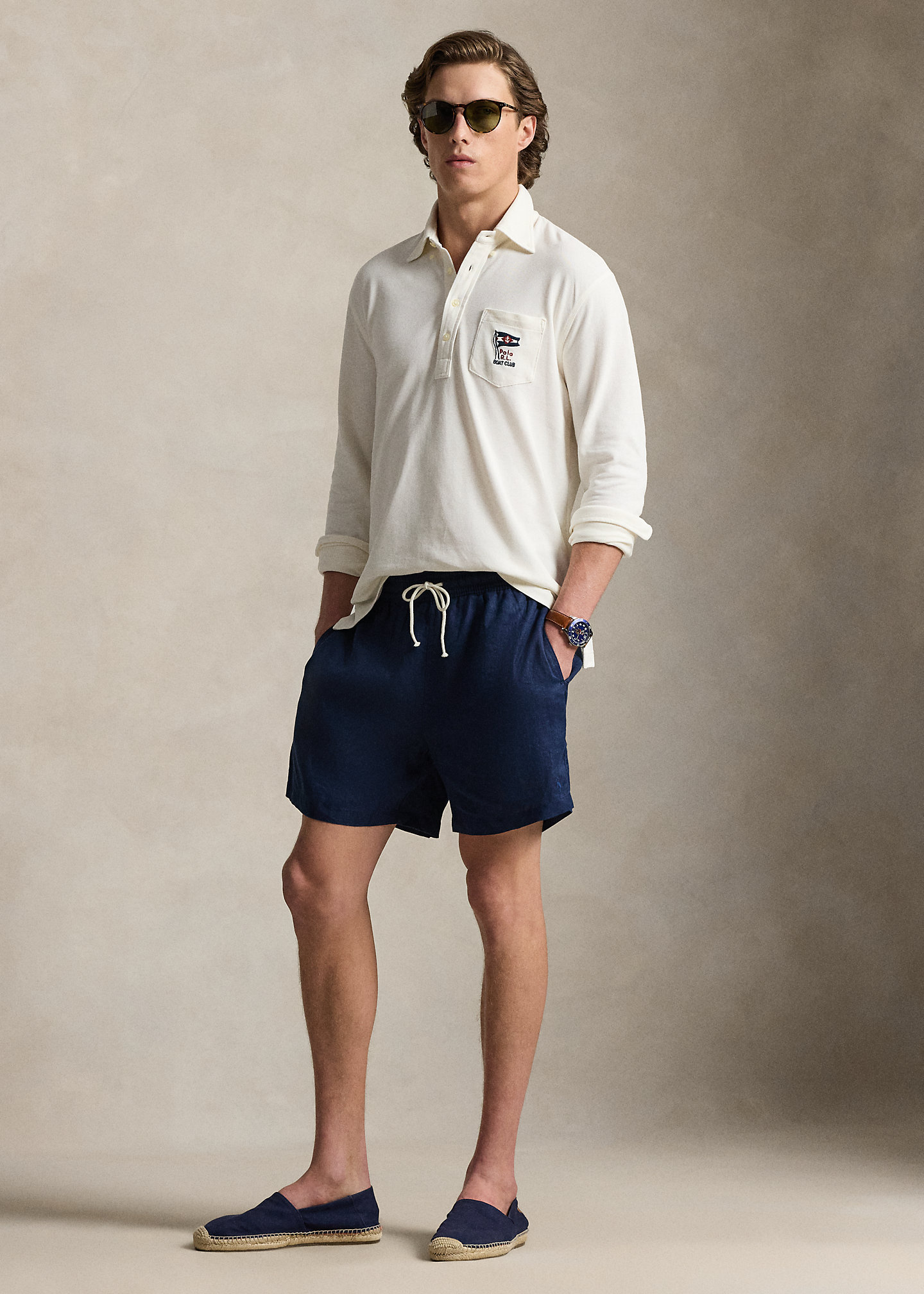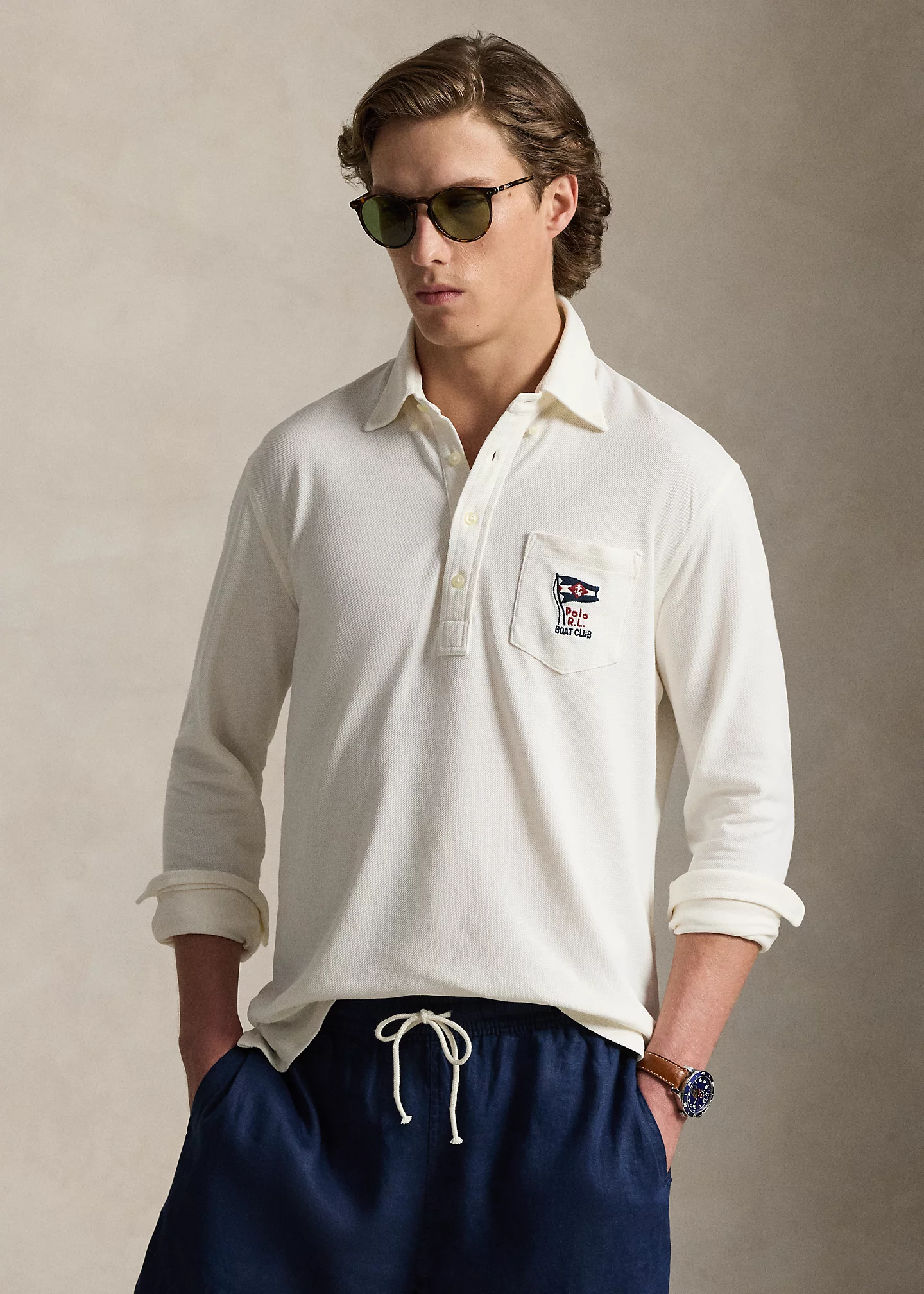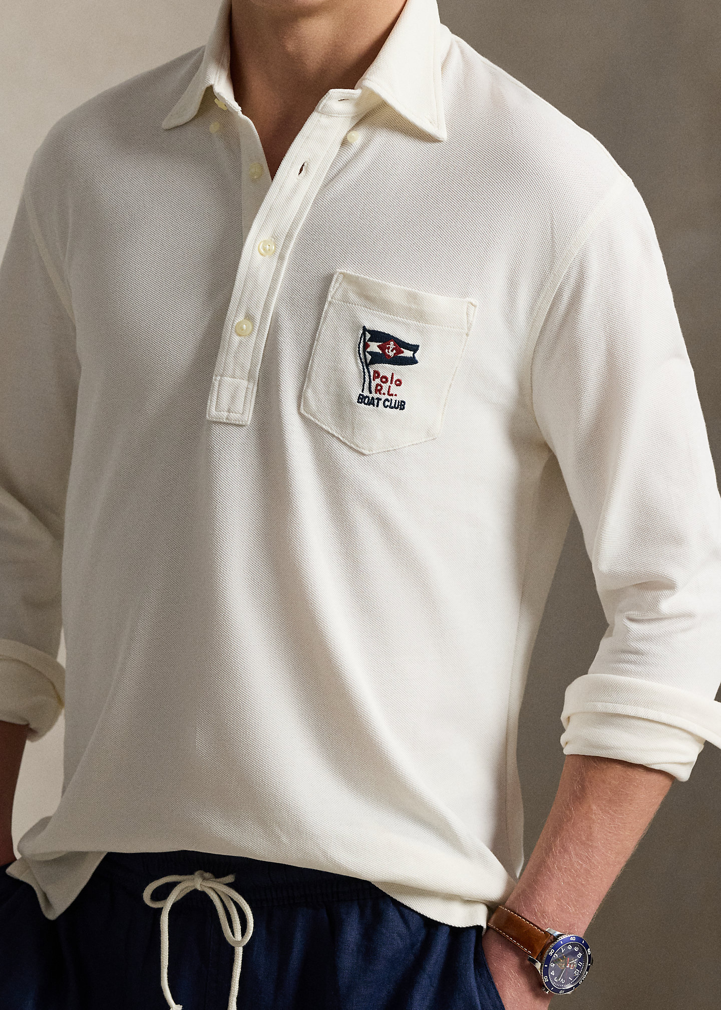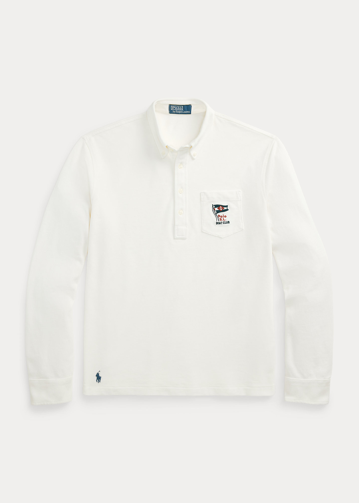- Left chest patch pocket. “Polo R.L. Boat Club” and a nautical flag embroidered at the pocket.