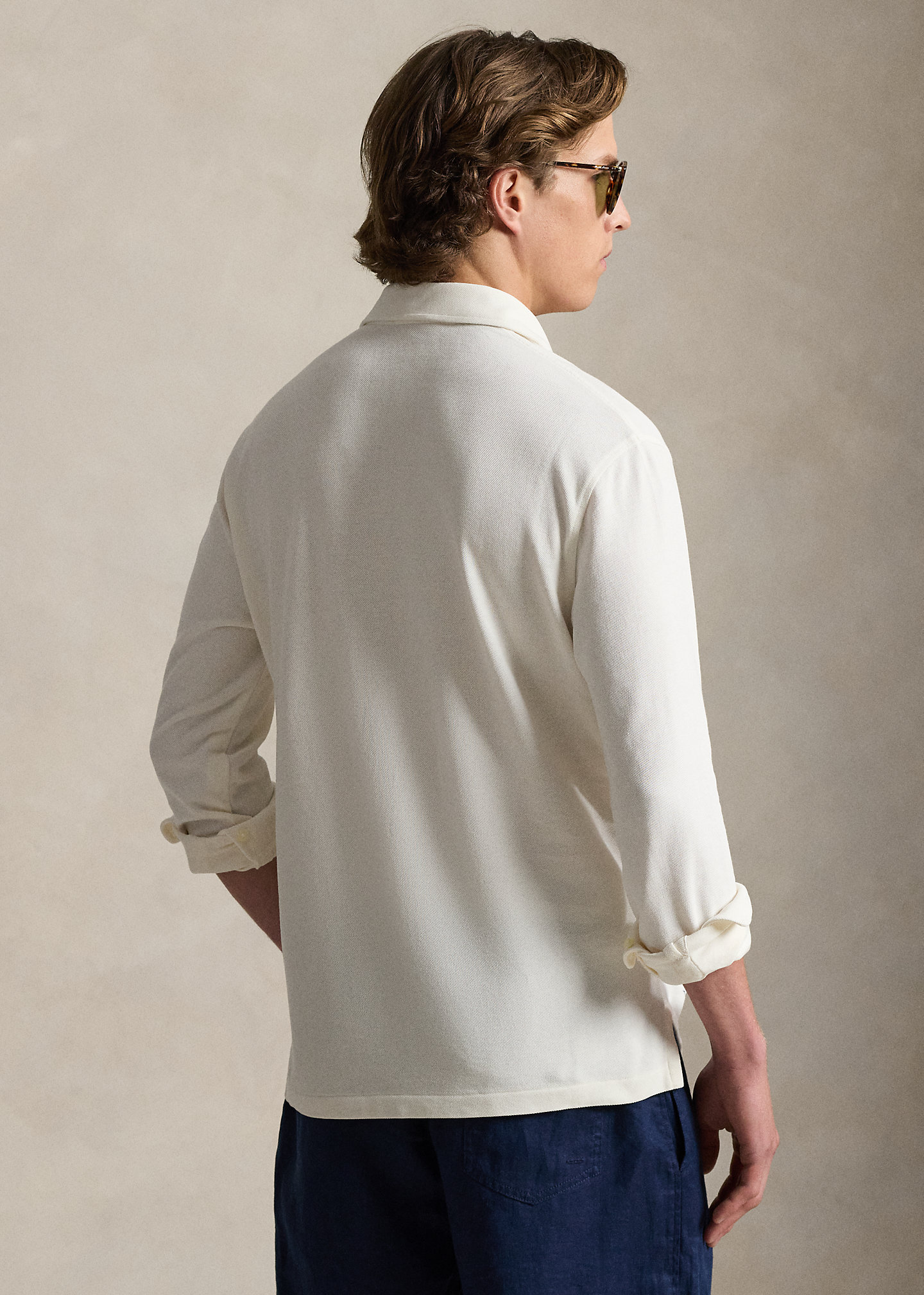 - Button-down collar. Four-button placket. Long sleeves with buttoned barrel cuffs.