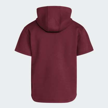 A short sleeve hooded sweatshirt made in part with a blend of recycled and renewable materials.