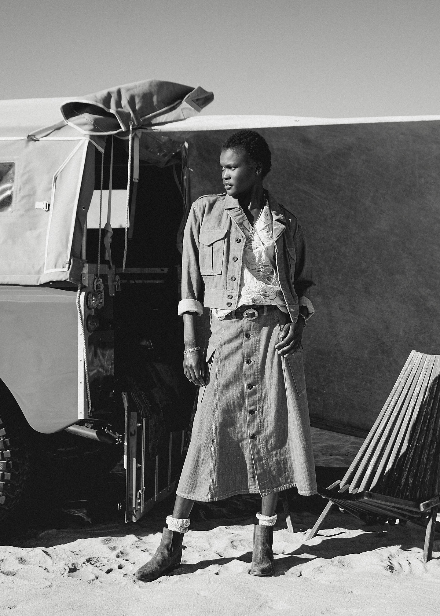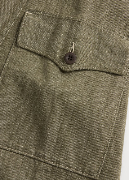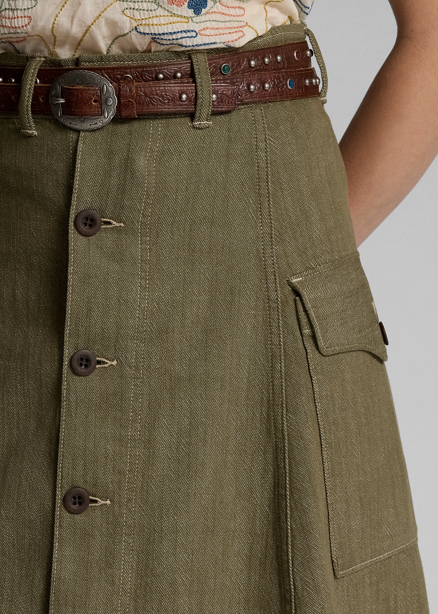 - Buttoned pocket at each hip.