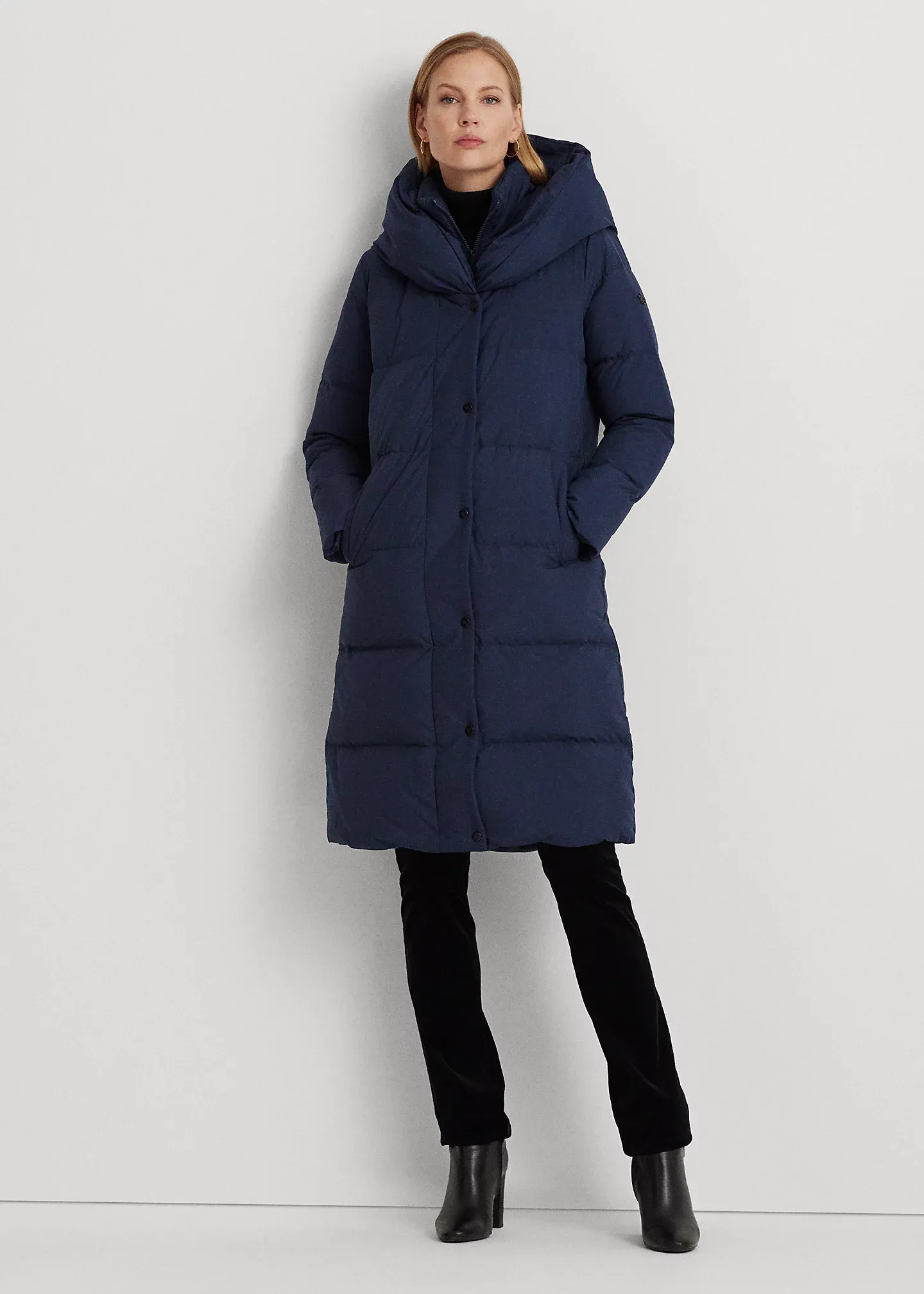 - Oversize shawl collar. Mockneck. Full-zip front with a snapped storm placket. Signature engraved snaps.