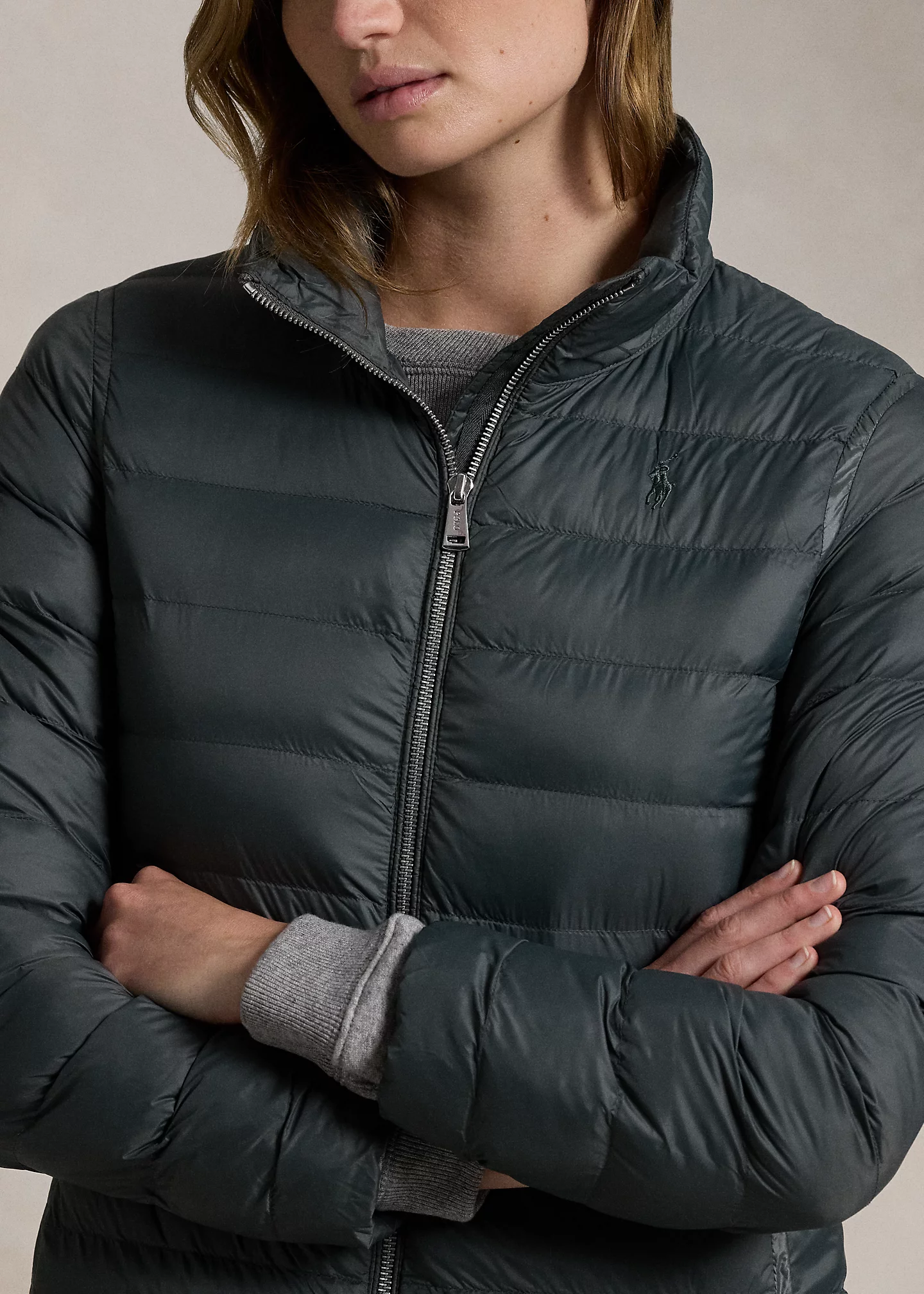 - Mockneck. Storm guard. Two-way full-zip front. Long sleeves with elasticized cuffs. Side on-seam zip pockets. Front and back princess seams. Packs into the right pocket, which features a carrying loop at the interior.