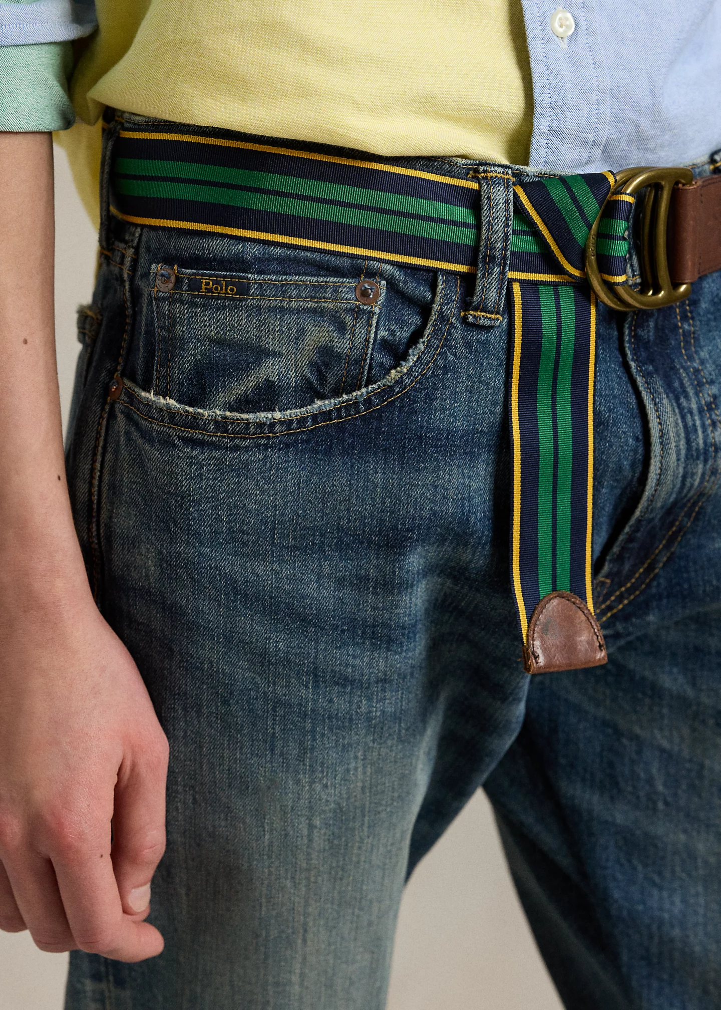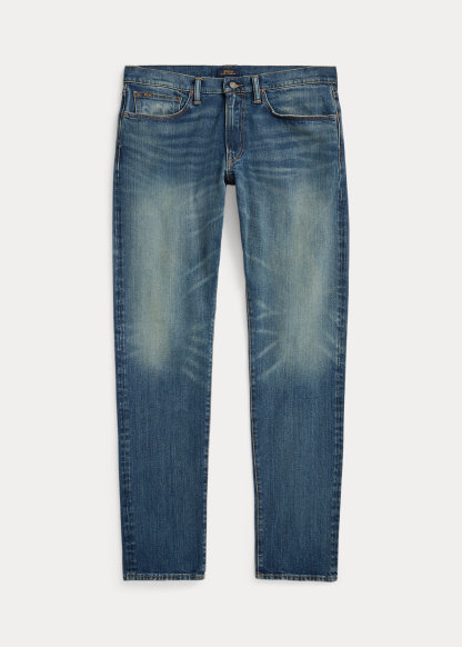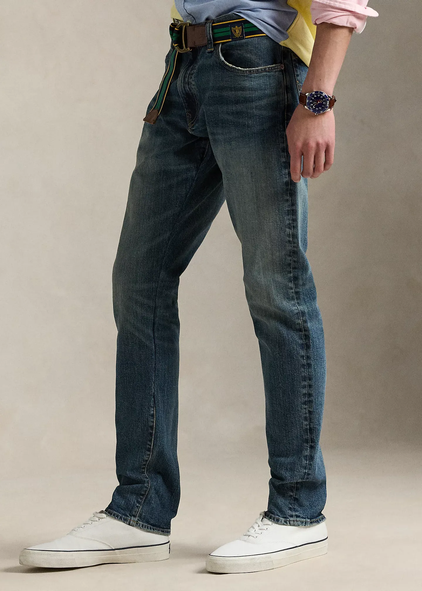 - Five-pocket styling with signature metal rivets. "Polo" label at the coin pocket.