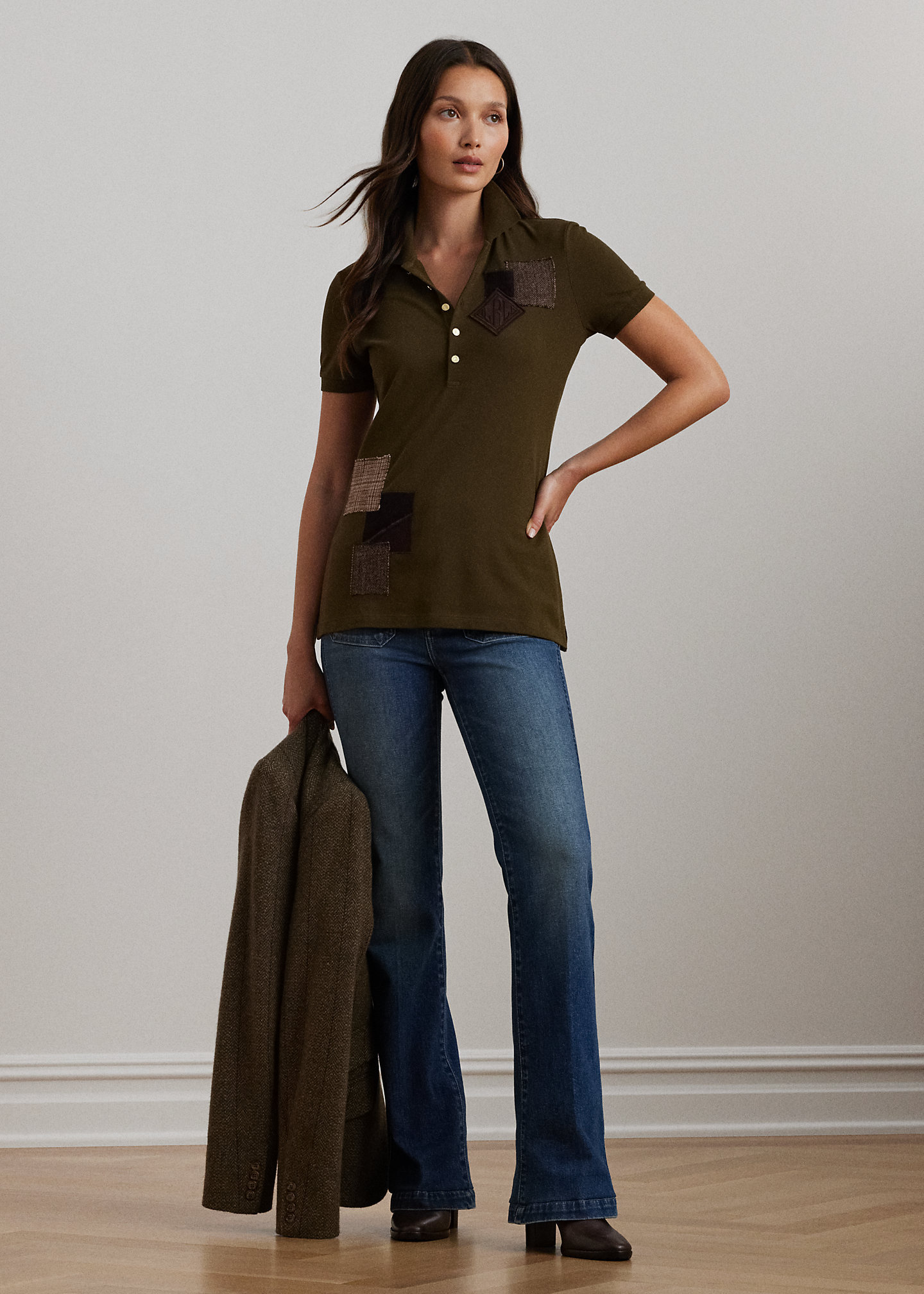 - Ribbed Polo collar. Five-button placket. "LRL"-engraved metal buttons.