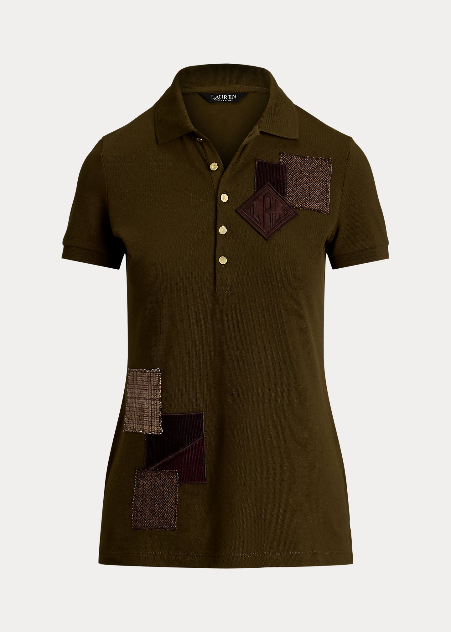 - Short sleeves with ribbed armbands. Patchwork at the front. Diamond-shaped "LRL"-embroidered appliqué logo at the left chest. Side-split hem.