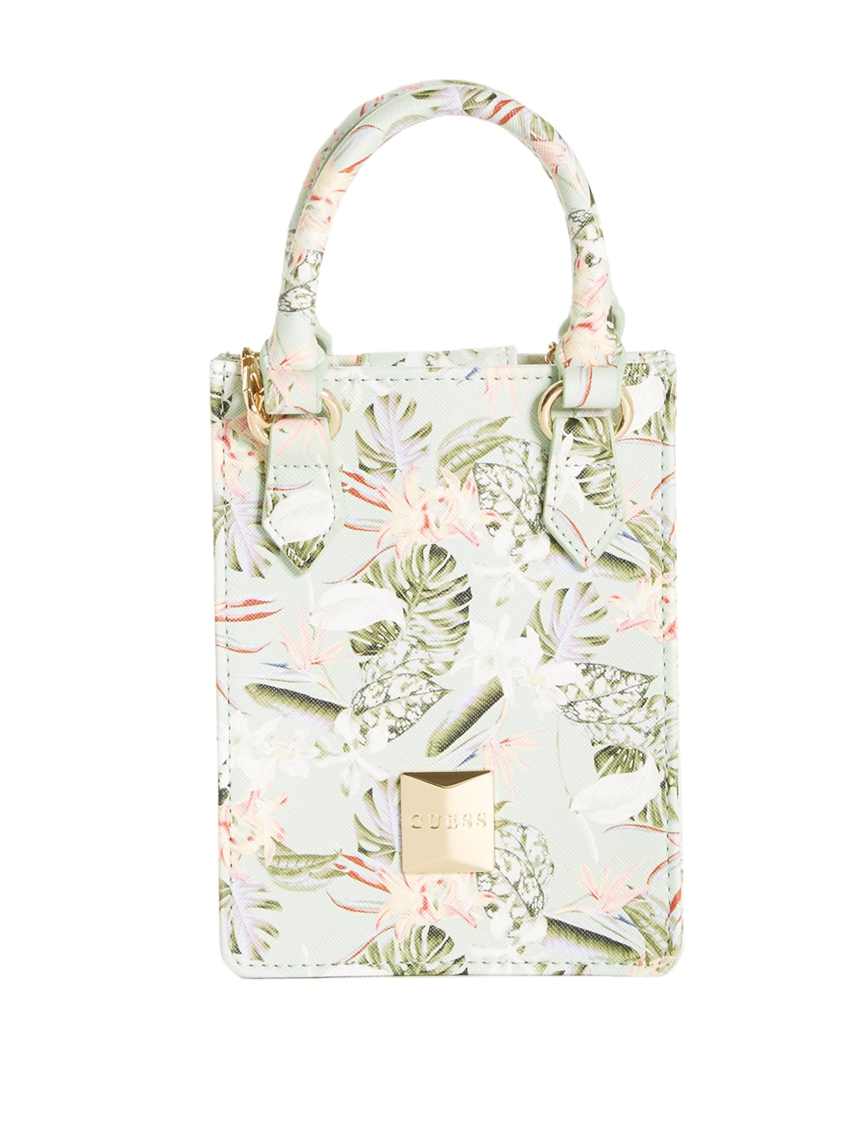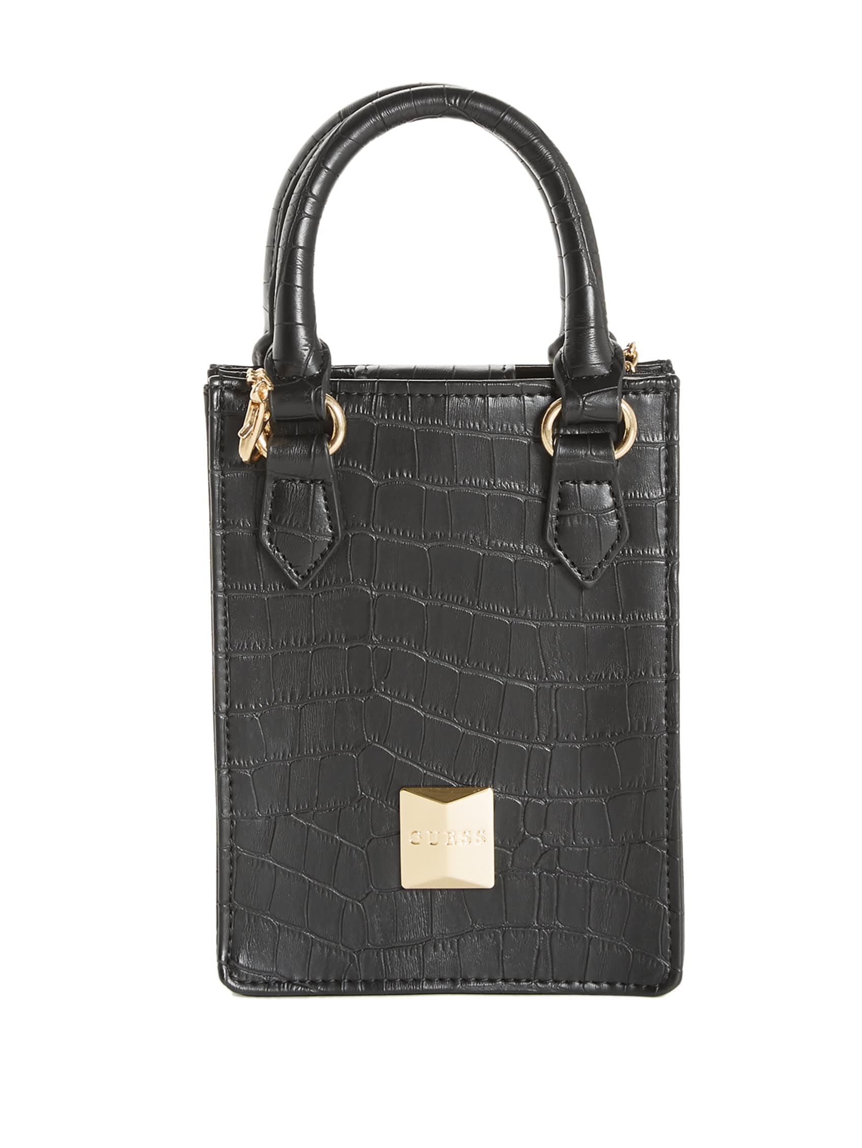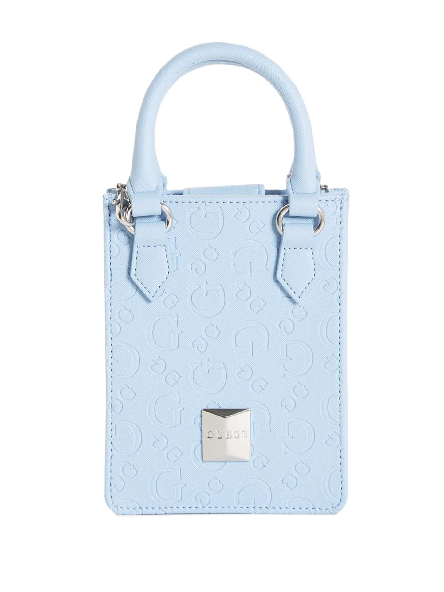 Take your look to the next level with this simple-yet-chic mini tote designed in a longline silhouette. Features stud logo emblem, rolled top handles and chain crossbody strap.