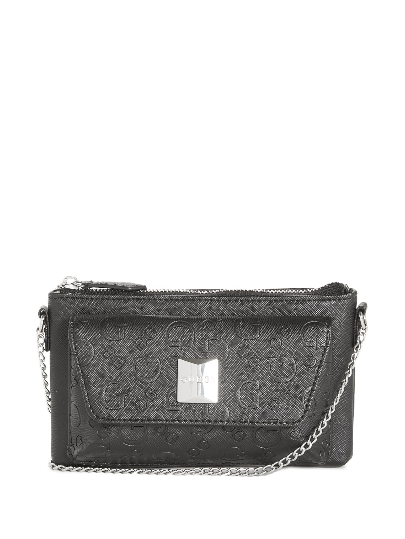 Take your look to the next level with this crossbody featuring an exterior fold-over flap pocket with stud logo emblem. Back zip pouch, chain strap and top zip closure.