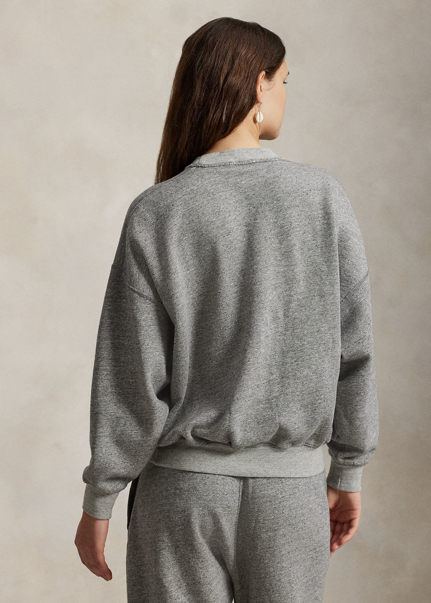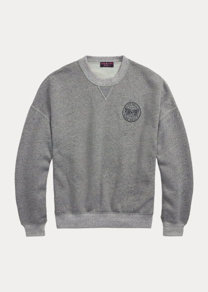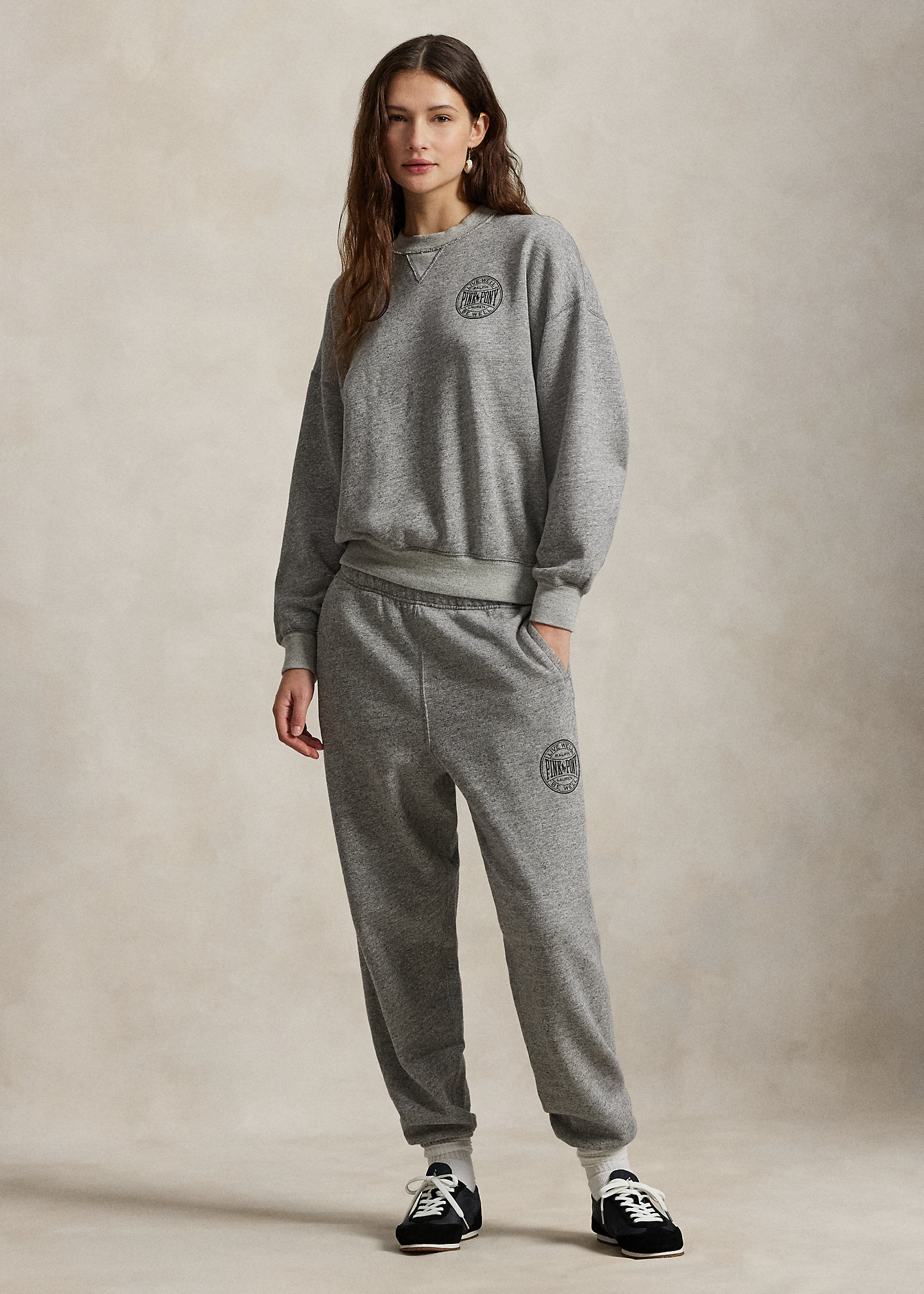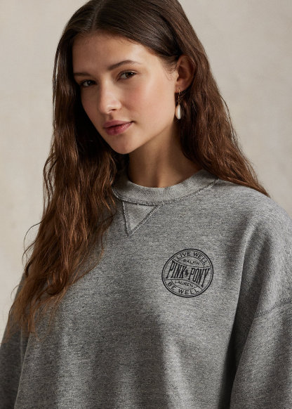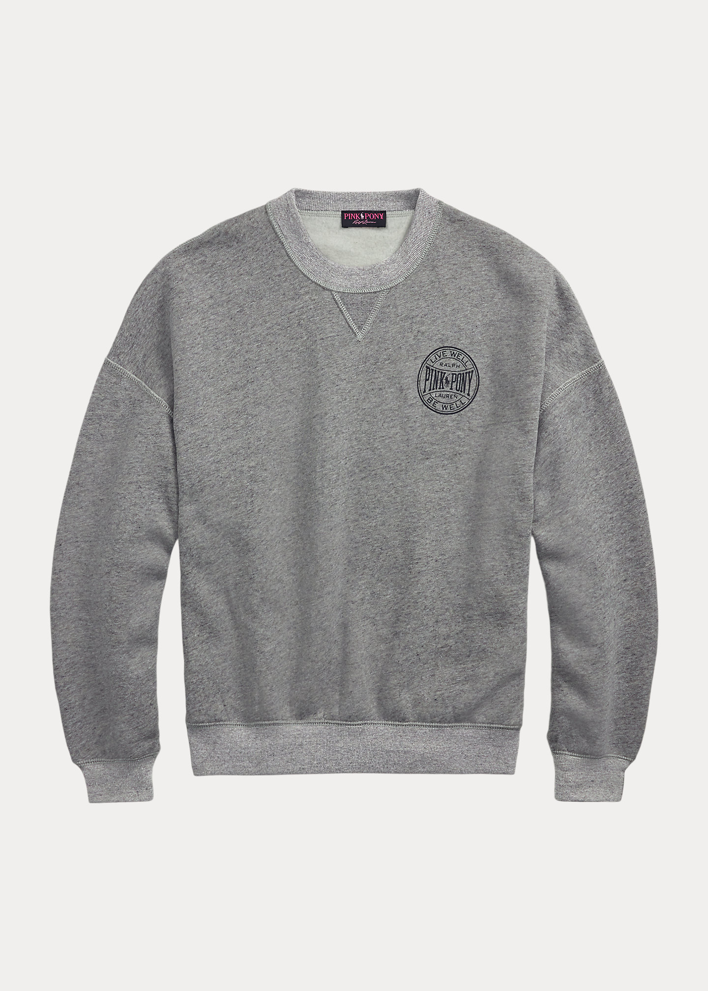 - Ribbed crewneck with V-inset. Long sleeves with ribbed cuffs. Dropped shoulders. Ribbed hem. "Pink Pony Ralph Lauren Live Well Be Well" printed at the left chest.