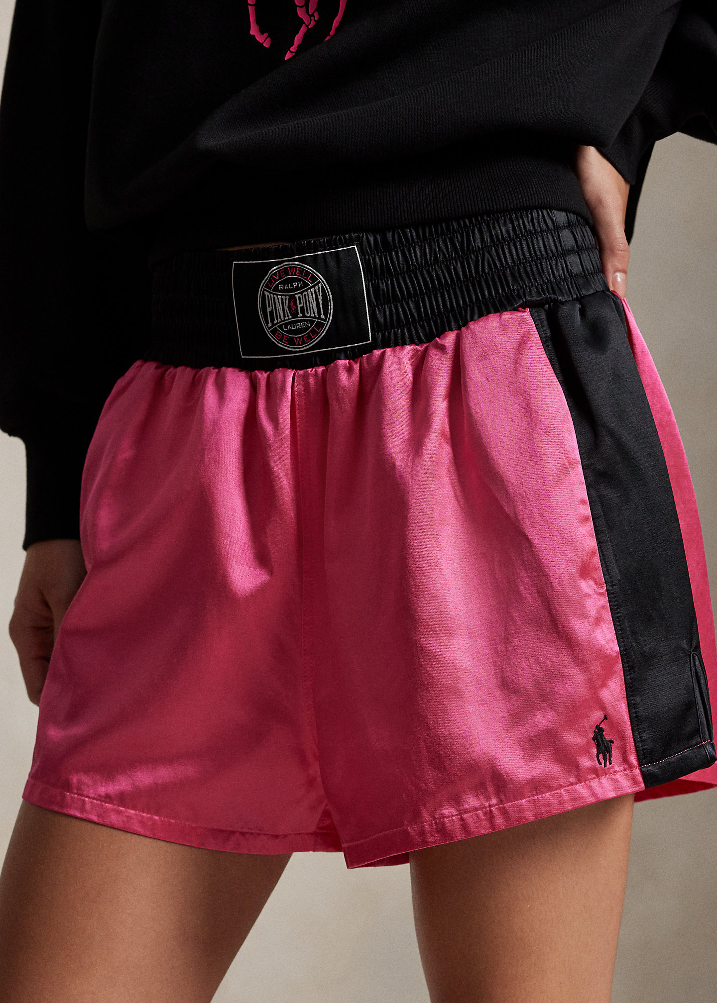 - Elasticized waistband with a "Pink Pony Ralph Lauren Live Well Be Well" woven label at the center front. Side on-seam pockets. Contrast side panels. Vent at each side. Signature embroidered Pony at the left hem.