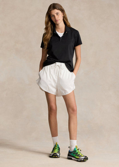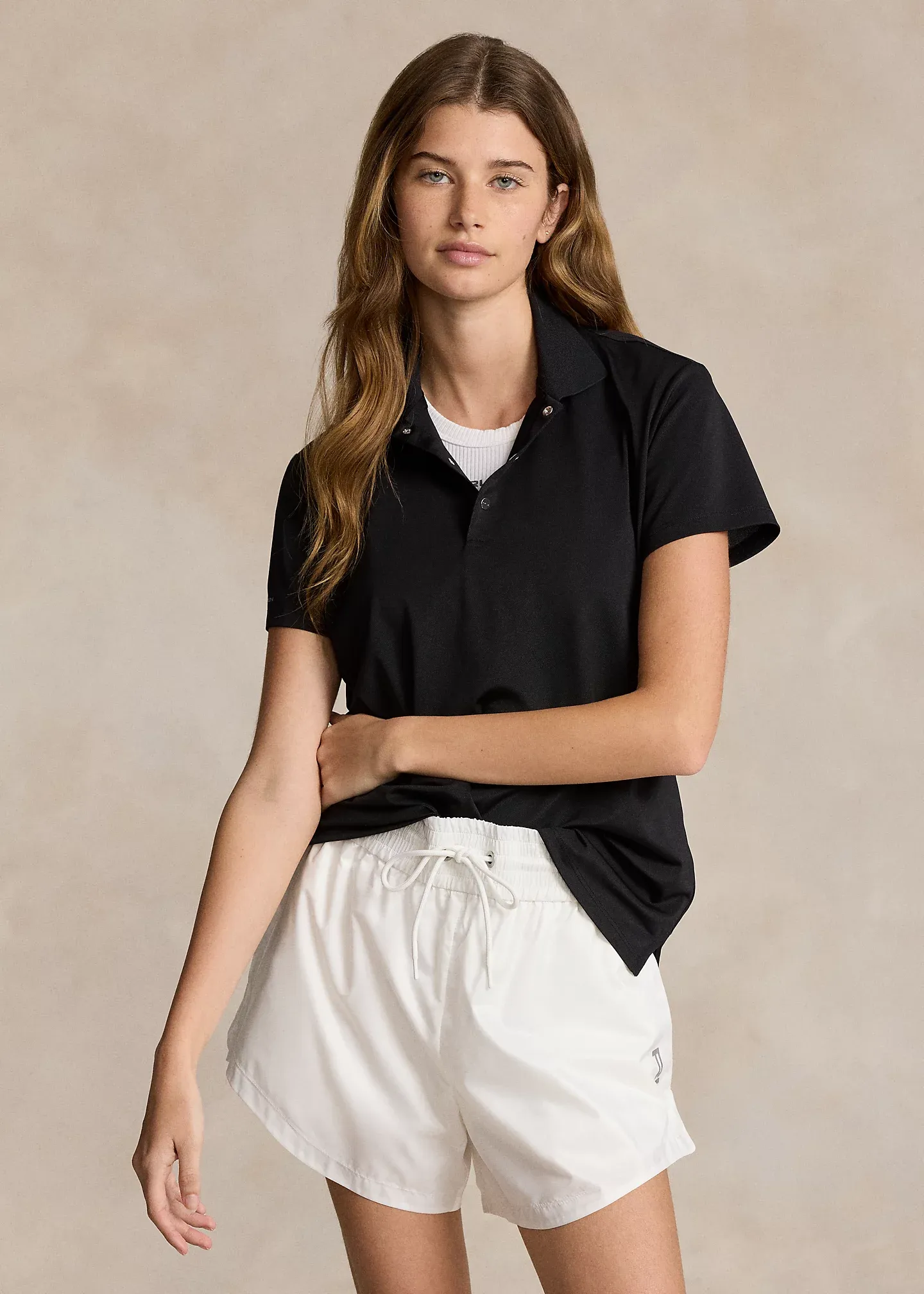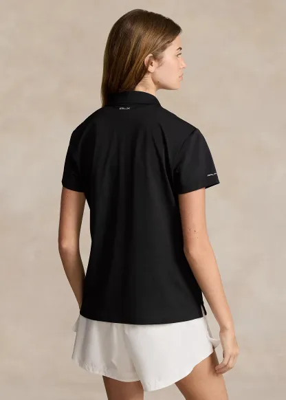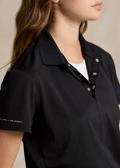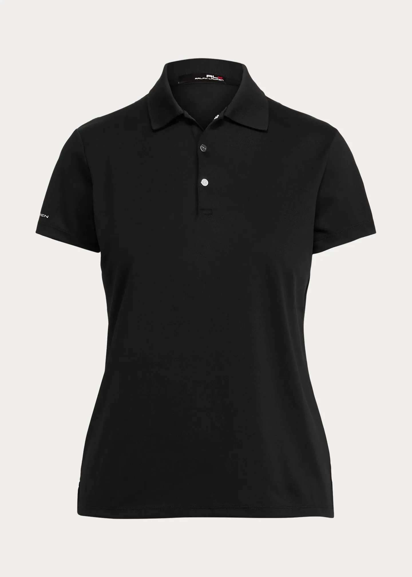 - Ribbed Polo collar. Three-snap placket. Signature "RLX" metal snaps. "RLX" printed at the center back of the neck.