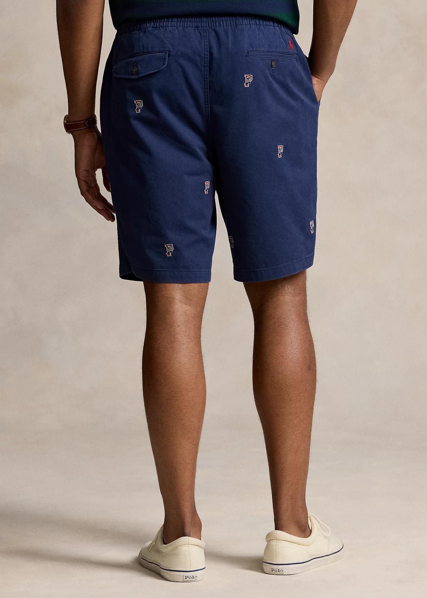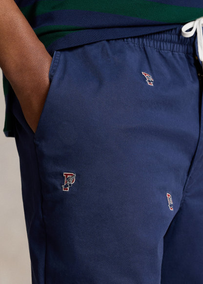 - Elastic waistband with an interior drawstring. Zip fly with a buttoned closure. Two front angled pockets. Two back buttoned pockets.