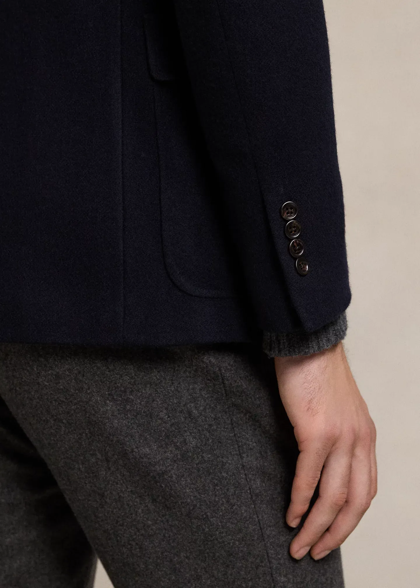 - Notch lapels. Buttonhole at the left lapel. Three-button silhouette. Cuffs with four decorative buttons.
