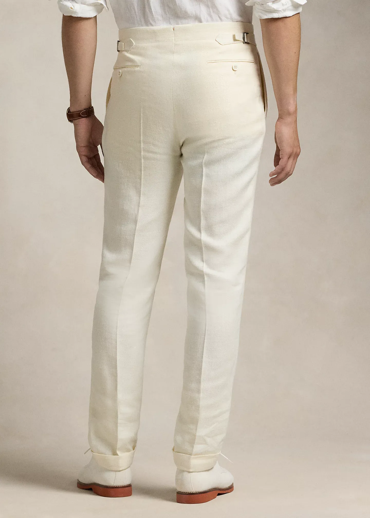 - Trouser: side adjusters; zip fly with an extended hook-and-bar closure; curtain waistband; interior buttons for braces; corozo buttons; double-pleated front; side on-seam pockets; two back buttoned pockets; lined to the knees at the front.