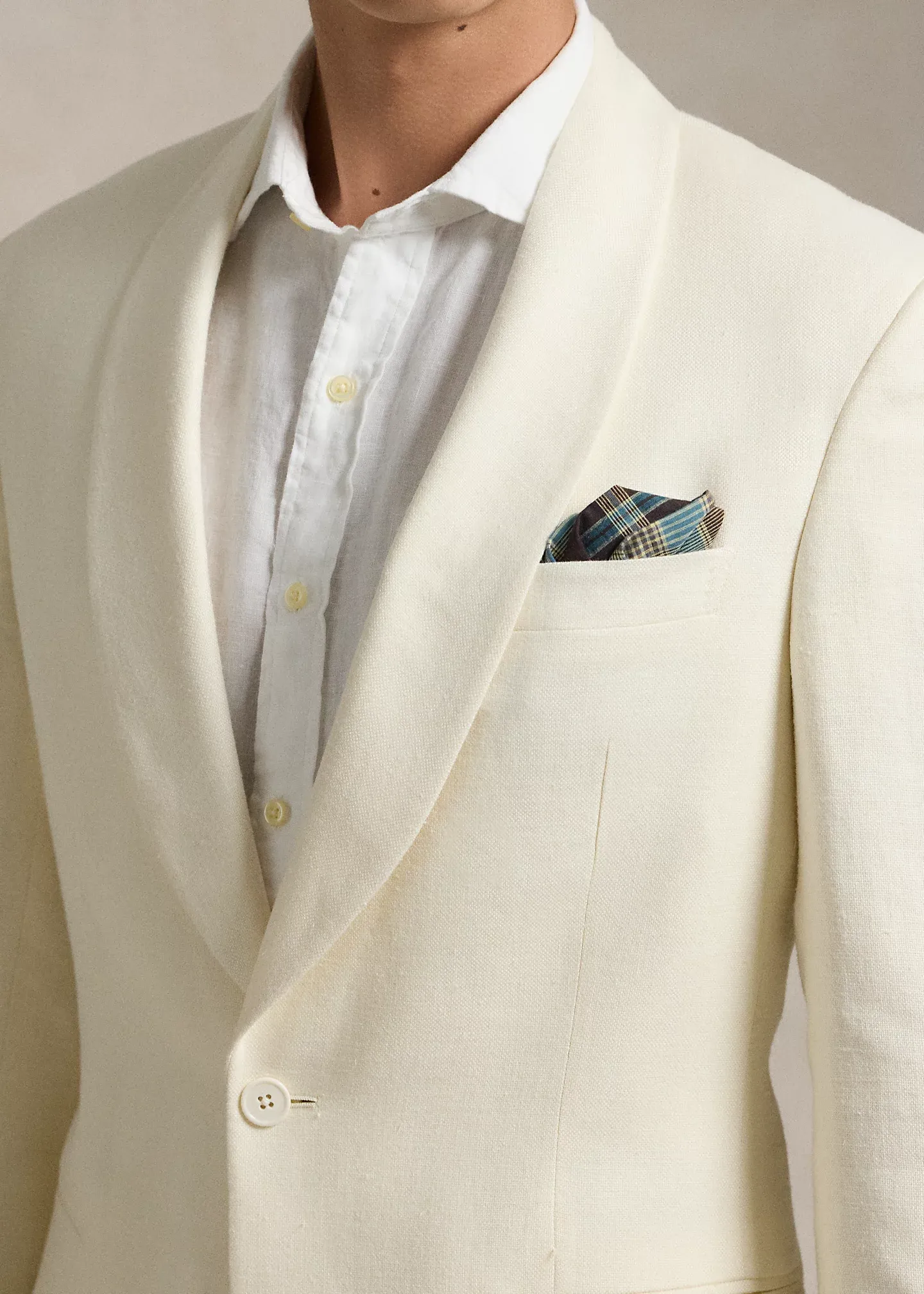 - Jacket: shawl collar; single-button silhouette; cuffs with four decorative buttons; left chest welt pocket; two front waist besom pockets; two interior chest pockets; interior left waist pocket; fully lined.