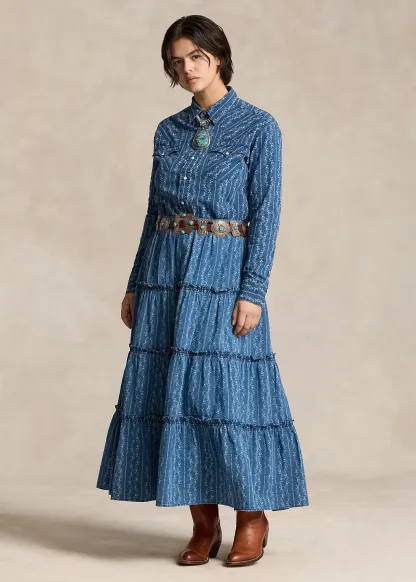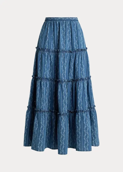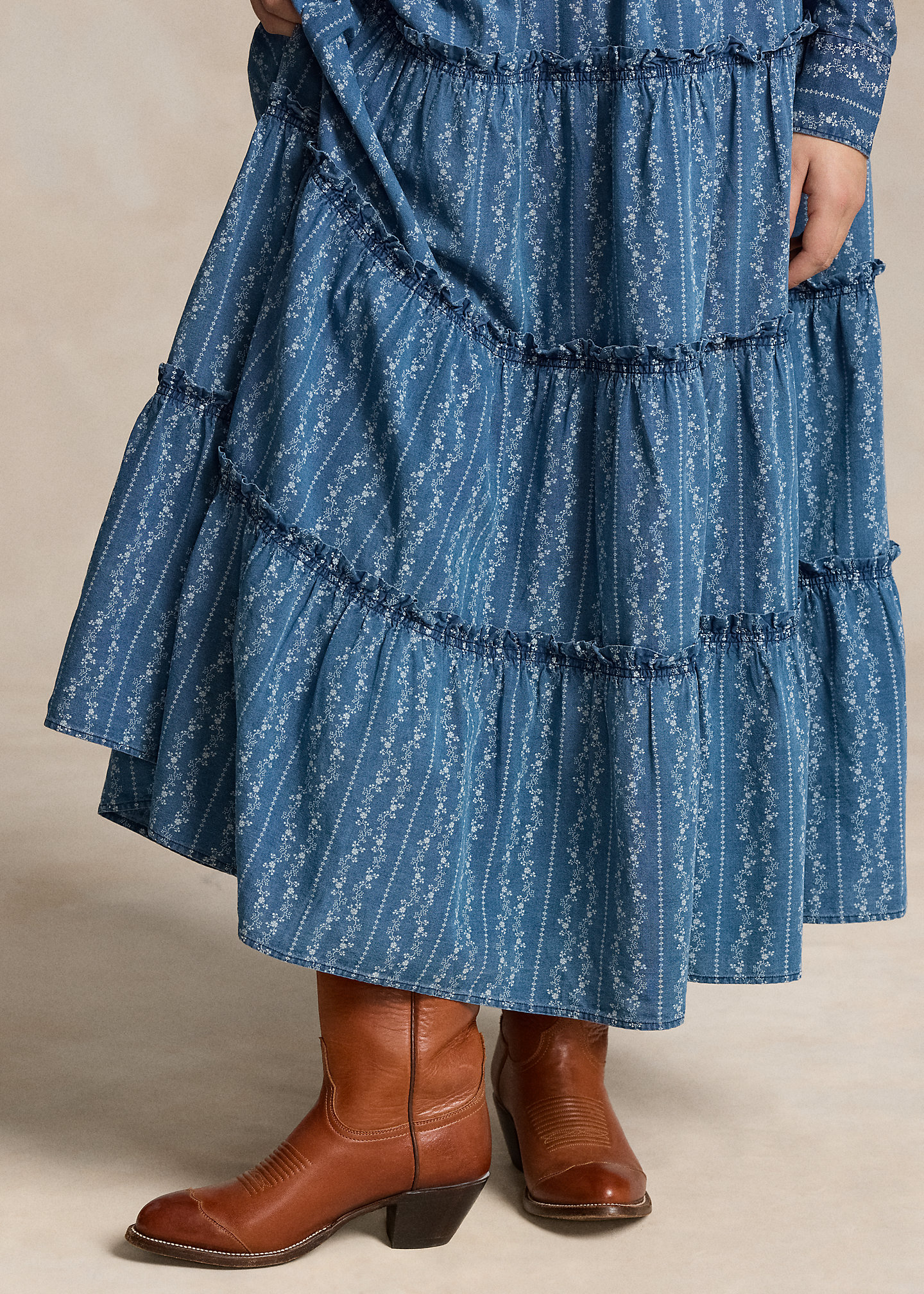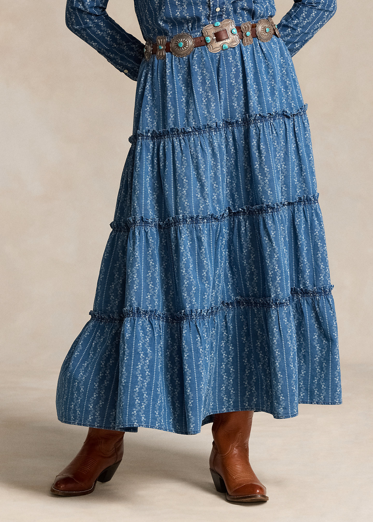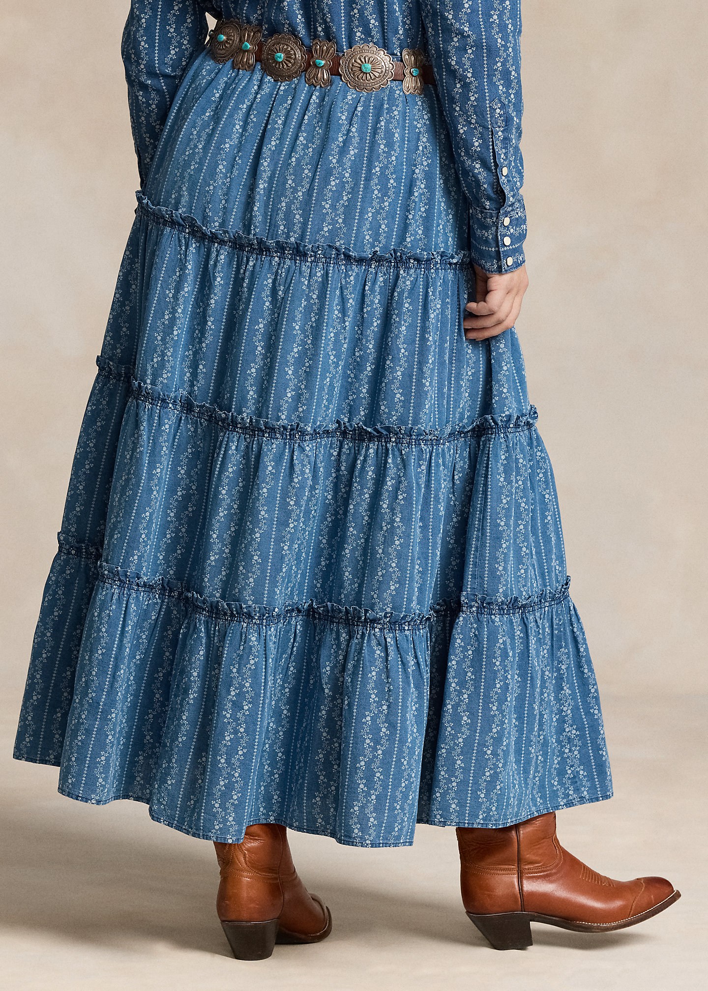 - Sewn waistband. Concealed left-side-seam zipper with a hook-and-eye closure. Four-tier construction with shirring and ruffle trim. Unlined.